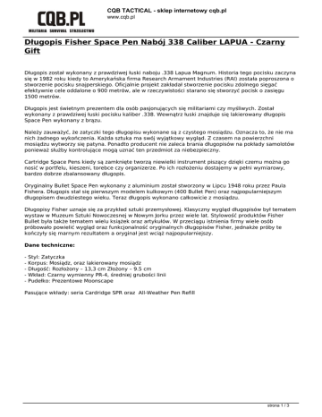 CQB TACTICAL - sklep internetowy cqb.pl www.cqb.pl Długopis Fisher Space Pen Nabój 338 Caliber LAPUA - Czarny Gift Długopis został wykonany z prawdziwej łuski naboju .338 Lapua Magnum. Historia tego pocisku zaczyna się w 1982 roku kiedy to Amerykańska firma Research Armament Industries (RAI) została poproszona o stworzenie pocisku snajperskiego. Oficjalnie projekt zakładał stworzenie pocisku zdolnego sięgać efektywnie cele oddalone o 900 metrów, ale w rzeczywistości starano się stworzyć pocisk o zasięgu 1500 metrów. Długopis jest świetnym prezentem dla osób pasjonujących się militariami czy myśliwych. Został wykonany z prawdziwej łuski pocisku kaliber .338. Wewnątrz łuski znajduje się lakierowany długopis Space Pen wykonany z brązu. Należy zauważyć, że zatyczki tego długopisu wykonane są z czystego mosiądzu. Oznacza to, że nie ma nich żadnego wykończenia. Każda sztuka ma swój wyjątkowy wygląd. Z czasem na powierzchni mosiądzu wytworzy się patyna. Ponadto producent nie zaleca brania długopisów na pokłady samolotów ponieważ służby kontrolujące mogą uznać ten przedmiot za niebezpieczny. Cartridge Space Pens kiedy są zamknięte tworzą niewielki instrument piszący dzięki czemu można go nosić w portfelu, kieszeni, torebce czy organizerze. Po ich rozłożeniu dostajemy w pełni wymiarowy, bardzo dobrze zbalansowany długopis. Oryginalny Bullet Space Pen wykonany z aluminium został stworzony w Lipcu 1948 roku przez Paula Fishera. Długopis stał się pierwszym modelem kulkowym (400 Bullet Pen) oraz najpopularniejszym długopisem dwudziestego wieku. Teraz długopis wykonano całkowicie z mosiądzu. Długopisy Fisher uznaje się za przykład sztuki przemysłowej. Klasyczny wygląd długopisów był tematem wystaw w Muzeum Sztuki Nowoczesnej w Nowym Jorku przez wiele lat. Stylowość produktów Fisher Bullet była także tematem wielu książek oraz artykułów. W przeciągu istnienia firmy wiele osób próbowało powielić wygląd oraz funkcjonalność oryginalnych długopisów Fisher, jednakże próby te kończyły się marnym rezultatem a oryginał jest wciąż najpopularniejszy. Dane techniczne: - Styl: Zatyczka Korpus: Mosiądz, oraz lakierowany mosiądz Długość: Rozłożony – 13,3 cm Złożony – 9.5 cm Wkład: Czarny wymienny PR-4, średniej grubości linii Pudełko: Prezentowe Moonscape Pasujące wkłady: seria Cardridge SPR oraz All-Weather Pen Refill strona 1 / 3 CQB TACTICAL - sklep internetowy cqb.pl www.cqb.pl strona 2 / 3 CQB TACTICAL - sklep internetowy cqb.pl www.cqb.pl strona 3 / 3 Powered by TCPDF (www.tcpdf.org)