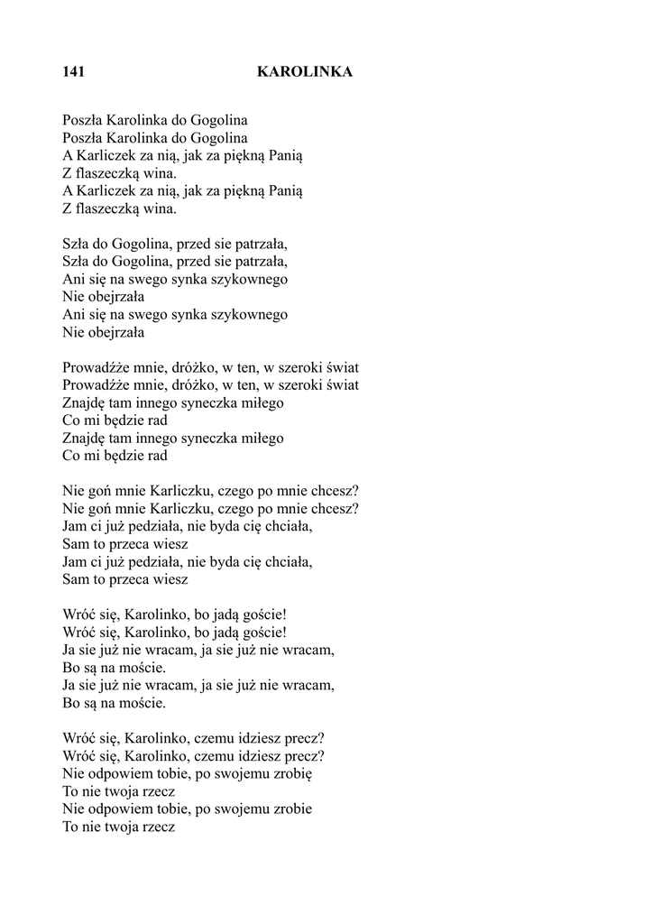 141 KAROLINKA Poszła Karolinka do Gogolina Poszła Karolinka do Gogolina A Karliczek za nią, jak za piękną Panią Z flaszeczką wina. A Karliczek za nią, jak za piękną Panią Z flaszeczką wina. Szła do Gogolina, przed sie patrzała, Szła do Gogolina, przed sie patrzała, Ani się na swego synka szykownego Nie obejrzała Ani się na swego synka szykownego Nie obejrzała Prowadźże mnie, dróżko, w ten, w szeroki świat Prowadźże mnie, dróżko, w ten, w szeroki świat Znajdę tam innego syneczka miłego Co mi będzie rad Znajdę tam innego syneczka miłego Co mi będzie rad Nie goń mnie Karliczku, czego po mnie chcesz? Nie goń mnie Karliczku, czego po mnie chcesz? Jam ci już pedziała, nie byda cię chciała, Sam to przeca wiesz Jam ci już pedziała, nie byda cię chciała, Sam to przeca wiesz Wróć się, Karolinko, bo jadą goście! Wróć się, Karolinko, bo jadą goście! Ja sie już nie wracam, ja sie już nie wracam, Bo są na moście. Ja sie już nie wracam, ja sie już nie wracam, Bo są na moście. Wróć się, Karolinko, czemu idziesz precz? Wróć się, Karolinko, czemu idziesz precz? Nie odpowiem tobie, po swojemu zrobię To nie twoja rzecz Nie odpowiem tobie, po swojemu zrobie To nie twoja rzecz