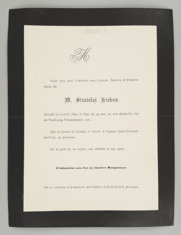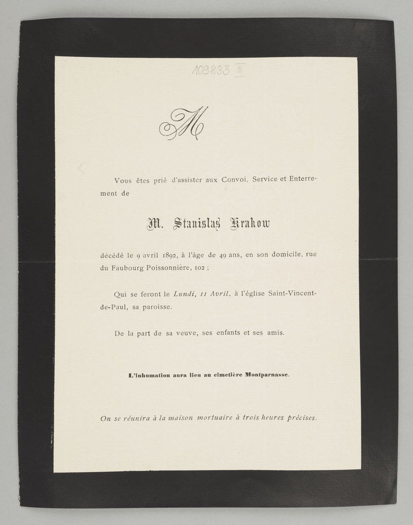 V o u s êtes prié d’assister aux Convoi, Service et Enterre ment de |!L ^raîiotD décédé le 9 avril 1892, à l’âge de 49 ans, en son domicile, rue du Faubourg Poissonnière, 102 ; Qui se feront le L u n d i, 11 A v r il, à l’église Saint-Vincentde-Paul, sa paroisse; De la part de sa veuve, ses enfants et ses amis. L ’ in hu m ation au ra lien an cim e tiè re M on tp arn a sse. O n se réunira à la m aison m ortuaire à trois heures p récises. STANISLAW KRAKOW Po dlugiej i ciçzkiej cliorohie zakonczyt zycie dnia 980kwietnia 1892 r. przezywszy lat 49. W yprow adzenie zwlok nastqpi z domu, rue du Faubourg P o isso n n ière, 102, w poniedzialek, i i b0 b. m., o godzinie 3ej po poludniu do kosciola Saint- Vincent-de-Paul, a nastçpnie na cmçtarz Montparnasse, na ktôre pozostala wdowa i dzieci wraz z przyjaciolmi zapraszajq znajoinvch.