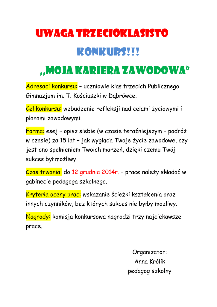 UWAGA Trzecioklasisto KONKURS!!! ,,Moja kariera zawodowa” Adresaci konkursu: – uczniowie klas trzecich Publicznego Gimnazjum im. T. Kościuszki w Dąbrówce. Cel konkursu: wzbudzenie refleksji nad celami życiowymi i planami zawodowymi. Forma: esej – opisz siebie (w czasie teraźniejszym – podróż w czasie) za 15 lat – jak wygląda Twoje życie zawodowe, czy jest ono spełnieniem Twoich marzeń, dzięki czemu Twój sukces był możliwy. Czas trwania: do 12 grudnia 2014r. – prace należy składać w gabinecie pedagoga szkolnego. Kryteria oceny prac: wskazanie ścieżki kształcenia oraz innych czynników, bez których sukces nie byłby możliwy. Nagrody: komisja konkursowa nagrodzi trzy najciekawsze prace. Organizator: Anna Królik pedagog szkolny