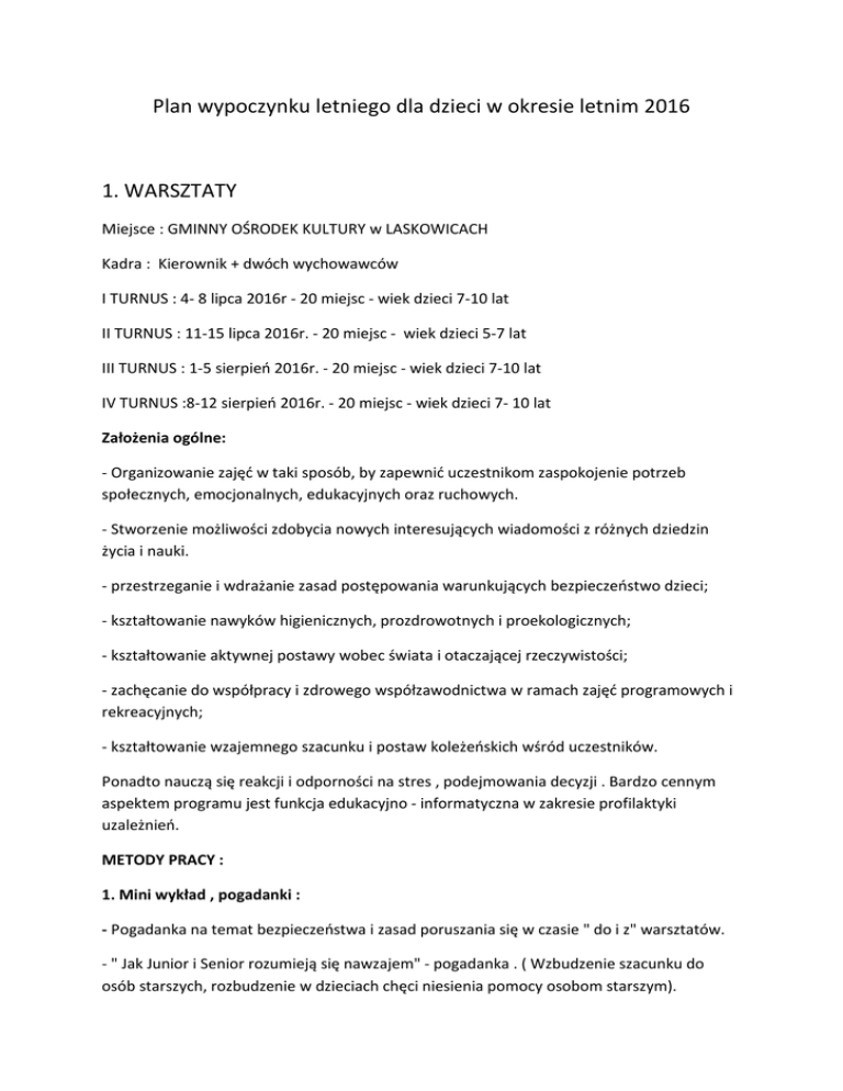 Plan wypoczynku letniego dla dzieci w okresie letnim 2016 1. WARSZTATY Miejsce : GMINNY OŚRODEK KULTURY w LASKOWICACH Kadra : Kierownik + dwóch wychowawców I TURNUS : 4- 8 lipca 2016r - 20 miejsc - wiek dzieci 7-10 lat II TURNUS : 11-15 lipca 2016r. - 20 miejsc - wiek dzieci 5-7 lat III TURNUS : 1-5 sierpień 2016r. - 20 miejsc - wiek dzieci 7-10 lat IV TURNUS :8-12 sierpień 2016r. - 20 miejsc - wiek dzieci 7- 10 lat Założenia ogólne: - Organizowanie zajęć w taki sposób, by zapewnić uczestnikom zaspokojenie potrzeb społecznych, emocjonalnych, edukacyjnych oraz ruchowych. - Stworzenie możliwości zdobycia nowych interesujących wiadomości z różnych dziedzin życia i nauki. - przestrzeganie i wdrażanie zasad postępowania warunkujących bezpieczeństwo dzieci; - kształtowanie nawyków higienicznych, prozdrowotnych i proekologicznych; - kształtowanie aktywnej postawy wobec świata i otaczającej rzeczywistości; - zachęcanie do współpracy i zdrowego współzawodnictwa w ramach zajęć programowych i rekreacyjnych; - kształtowanie wzajemnego szacunku i postaw koleżeńskich wśród uczestników. Ponadto nauczą się reakcji i odporności na stres , podejmowania decyzji . Bardzo cennym aspektem programu jest funkcja edukacyjno - informatyczna w zakresie profilaktyki uzależnień. METODY PRACY : 1. Mini wykład , pogadanki : - Pogadanka na temat bezpieczeństwa i zasad poruszania się w czasie " do i z" warsztatów. - " Jak Junior i Senior rozumieją się nawzajem" - pogadanka . ( Wzbudzenie szacunku do osób starszych, rozbudzenie w dzieciach chęci niesienia pomocy osobom starszym). - Pogadanka na temat zagrożeń multimedialnych (uświadomienie dzieciom zagrożeń, na które są narażeni w wirtualnym świecie) - Pogadanka na temat używek ( alkohol , papierosy , narkotyki i inne ) i ich oddziaływanie na organizm człowieka . 2. Odgrywanie ról i scenek - Ułatwia zrozumienie innych ludzi ,pozwala na wypróbowanie różnych typów zachowań , rozwija umiejętności rozwiązywania problemów. 3. Prace plastyczne - Uwalniają od napięć psychicznych, uruchamiają niewerbalny przekaz oraz wyobraźnię dziecka . 4. Burza mózgów - Przyjmowanie wszystkich pomysłów bez ich oceniania pozwala na twórcze myślenie , uczy szacunku dla propozycji innych . 5. Gry i zabawy integracyjne - Ułatwiają kontakt między dziećmi i sprzyjają integracji grupy . Budżet : 1. Wynagrodzenie wychowawców 2000 zł 2. Posiłki dla dzieci w trakcie warsztatów : 6000 zł - 15 zł obiad 3. Zakup materiałów do prac plastycznych : 500 zł 4. Ubezpieczenie dzieci i kadry na okres warsztatów : 5. Zakup napojów i kiełbasy na ognisko : 300 zł Po zakończeniu I , II turnusu jak i III , IV turnusu wystawa prac dzieci oraz ognisko z rodzicami . 18- 29 Lipca - zajęcia dojazdowe dla dzieci w świetlicach wiejskich na terenie gminy Jeżewo 15-27 sierpień - zajęcia dojazdowe dla dzieci w świetlicach wiejskich na terenie gminy Jeżewo Zajęcia zorganizowane dla dzieci które z różnych przyczyn nie mogą dojechać na jakiekolwiek zajęcia letnie organizowane w gminie Jeżewo . Zajęcia odbędą się po wcześniejszym uzgodnieniu z sołtysami , nie ma ograniczenia wiekowego dla dzieci . Kino letnie dla dzieci miejsce Dom Kultury w Laskowicach 20 lipiec - bajka " W głowie się nie mieści " 27 lipiec - bajka " Król Lew " 17 sierpień - bajka " Piękna i bestia " 24 sierpień - bajka " Mulan" Repertuar bajek może ulec zmianie . "Kolorowy Bieg" termin - 6 sierpień 2016r Bieg dla mieszkańców gminy Jeżewo z wykorzystaniem kolorowego proszku "Holi " - zakończony mini festynem ( współpraca z GOK , sołtysem Laskowic , policją, OSP , KGW )