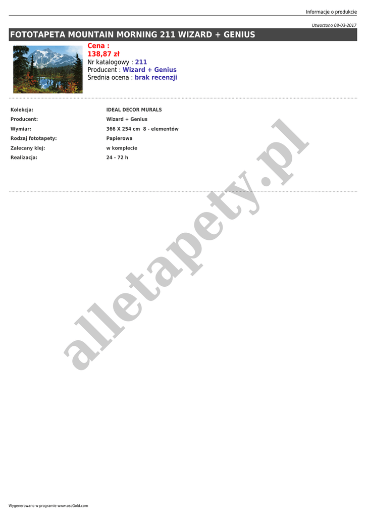 Informacje o produkcie Utworzono 08-03-2017 FOTOTAPETA MOUNTAIN MORNING 211 WIZARD + GENIUS Cena : 138,87 zł IDEAL DECOR MURALS Producent: Wizard + Genius Wymiar: 366 X 254 cm 8 - elementów Rodzaj fototapety: Papierowa Zalecany klej: w komplecie Realizacja: 24 - 72 h al le ta pe ty Kolekcja: .p l Nr katalogowy : 211 Producent : Wizard + Genius Średnia ocena : brak recenzji Wygenerowano w programie www.oscGold.com