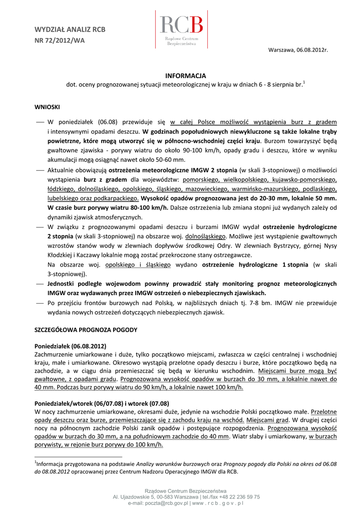 WYDZIAŁ ANALIZ RCB NR 72/2012/WA Warszawa, 06.08.2012r. INFORMACJA dot. oceny prognozowanej sytuacji meteorologicznej w kraju w dniach 6 - 8 sierpnia br.1 WNIOSKI W poniedziałek (06.08) przewiduje się w całej Polsce możliwość wystąpienia burz z gradem i intensywnymi opadami deszczu. W godzinach popołudniowych niewykluczone są także lokalne trąby powietrzne, które mogą utworzyć się w północno-wschodniej części kraju. Burzom towarzyszyć będą gwałtowne zjawiska - porywy wiatru do około 90-100 km/h, opady gradu i deszczu, które w wyniku akumulacji mogą osiągnąć nawet około 50-60 mm. Aktualnie obowiązują ostrzeżenia meteorologiczne IMGW 2 stopnia (w skali 3-stopniowej) o możliwości wystąpienia burz z gradem dla województw: pomorskiego, wielkopolskiego, kujawsko-pomorskiego, łódzkiego, dolnośląskiego, opolskiego, śląskiego, mazowieckiego, warmińsko-mazurskiego, podlaskiego, lubelskiego oraz podkarpackiego. Wysokość opadów prognozowana jest do 20-30 mm, lokalnie 50 mm. W czasie burz porywy wiatru 80-100 km/h. Dalsze ostrzeżenia lub zmiana stopni już wydanych zależy od dynamiki zjawisk atmosferycznych. W związku z prognozowanymi opadami deszczu i burzami IMGW wydał ostrzeżenie hydrologiczne 2 stopnia (w skali 3-stopniowej) na obszarze woj. dolnośląskiego. Możliwe jest wystąpienie gwałtownych wzrostów stanów wody w zlewniach dopływów środkowej Odry. W zlewniach Bystrzycy, górnej Nysy Kłodzkiej i Kaczawy lokalnie mogą zostać przekroczone stany ostrzegawcze. Na obszarze woj. opolskiego i śląskiego wydano ostrzeżenie hydrologiczne 1 stopnia (w skali 3-stopniowej). Jednostki podległe wojewodom powinny prowadzić stały monitoring prognoz meteorologicznych IMGW oraz wydawanych przez IMGW ostrzeżeń o niebezpiecznych zjawiskach. Po przejściu frontów burzowych nad Polską, w najbliższych dniach tj. 7-8 bm. IMGW nie przewiduje wydania nowych ostrzeżeń dotyczących niebezpiecznych zjawisk. SZCZEGÓŁOWA PROGNOZA POGODY Poniedziałek (06.08.2012) Zachmurzenie umiarkowane i duże, tylko początkowo miejscami, zwłaszcza w części centralnej i wschodniej kraju, małe i umiarkowane. Okresowo wystąpią przelotne opady deszczu i burze, które początkowo będą na zachodzie, a w ciągu dnia przemieszczać się będą w kierunku wschodnim. Miejscami burze mogą być gwałtowne, z opadami gradu. Prognozowana wysokość opadów w burzach do 30 mm, a lokalnie nawet do 40 mm. Podczas burz porywy wiatru do 90 km/h, a lokalnie nawet 100 km/h. Poniedziałek/wtorek (06/07.08) i wtorek (07.08) W nocy zachmurzenie umiarkowane, okresami duże, jedynie na wschodzie Polski początkowo małe. Przelotne opady deszczu oraz burze, przemieszczające się z zachodu kraju na wschód. Miejscami grad. W drugiej części nocy na północnym zachodzie Polski zanik opadów i postępujące rozpogodzenia. Prognozowana wysokość opadów w burzach do 30 mm, a na południowym zachodzie do 40 mm. Wiatr słaby i umiarkowany, w burzach porywisty, w rejonie burz porywy do 100 km/h. 1 Informacja przygotowana na podstawie Analizy warunków burzowych oraz Prognozy pogody dla Polski na okres od 06.08 do 08.08.2012 opracowanej przez Centrum Nadzoru Operacyjnego IMGW dla RCB. Rządowe Centrum Bezpieczeństwa Al. Ujazdowskie 5, 00-583 Warszawa | tel./fax +48 22 236 59 75 e-mail: [email protected] | www . r c b . g o v . p l W dzień przelotne opady deszczu, lokalnie burze, głównie w północnej części Polski. Prognozowana wysokość opadów na północnym wschodzie do 15 mm. Wiatr słaby i umiarkowany, na północy Polski okresami dość silny i porywisty, na wybrzeżu w porywach do 70 km/h. W rejonie burz porywy wiatru do 90 km/h. Wtorek/środa (07/08.08) i środa (08.08) W nocy na północy Polski przelotne opady deszczu. Wiatr słaby, na północy Polski okresami umiarkowany i dość silny, w porywach na wybrzeżu do 70 km/h. W dzień miejscami przelotne opady deszczu, głównie w północnej części Polski oraz w górach. Na północnym wschodzie lokalnie możliwe burze. Wiatr słaby i umiarkowany, na północy Polski okresami dość silny w porywach na wybrzeżu do 55 km/h. W burzach porywy wiatru do 70 km/h. Rządowe Centrum Bezpieczeństwa Al. Ujazdowskie 5, 00-583 Warszawa | tel./fax +48 22 236 59 75 e-mail: [email protected] | www . r c b . g o v . p l