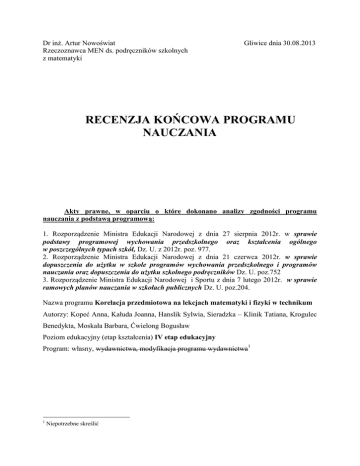 Dr inż. Artur Nowoświat Rzeczoznawca MEN ds. podręczników szkolnych z matematyki Gliwice dnia 30.08.2013 RECENZJA KOŃCOWA PROGRAMU NAUCZANIA Akty prawne, w oparciu o które dokonano analizy zgodności programu nauczania z podstawą programową: 1. Rozporządzenie Ministra Edukacji Narodowej z dnia 27 sierpnia 2012r. w sprawie podstawy programowej wychowania przedszkolnego oraz kształcenia ogólnego w poszczególnych typach szkół, Dz. U. z 2012r. poz. 977. 2. Rozporządzenie Ministra Edukacji Narodowej z dnia 21 czerwca 2012r. w sprawie dopuszczenia do użytku w szkole programów wychowania przedszkolnego i programów nauczania oraz dopuszczenia do użytku szkolnego podręczników Dz. U. poz.752 3. Rozporządzenie Ministra Edukacji Narodowej i Sportu z dnia 7 lutego 2012r. w sprawie ramowych planów nauczania w szkołach publicznych Dz. U. poz.204. Nazwa programu Korelacja przedmiotowa na lekcjach matematyki i fizyki w technikum Autorzy: Kopeć Anna, Kałuda Joanna, Hanslik Sylwia, Sieradzka – Klinik Tatiana, Krogulec Benedykta, Moskała Barbara, Ćwielong Bogusław Poziom edukacyjny (etap kształcenia) IV etap edukacyjny Program: własny, wydawnictwa, modyfikacja programu wydawnictwa1 1 Niepotrzebne skreślić OPINIA OGÓLNA Poprawiony program nauczania ma 82 strony i składa się 8 rozdziałów. Program zawiera 56 pozycji literaturowych co świadczy o dużym rozeznaniu autorów w literaturze przedmiotu. Przedstawiony do oceny program nauczania ma charakter linearny. Oznacza to, że porcje materiału są ułożone kolejno, jedna po drugiej. Założeniem tak skonstruowanego programu jest stosunkowo pełne opanowanie poprzedniej części przed przystąpieniem do realizacji kolejnej. Niedostateczne opanowanie treści na danym etapie może tworzyć lukę w wiadomościach i umiejętnościach uczniów. We wstępie autorzy odnieśli się do genezy potrzeby utworzenia takiego programu. Jak sami piszą program powstał w odpowiedzi na zapotrzebowanie rynku pracy jak i zapotrzebowaniu uczelni wyższych na absolwentów szkół średnich, którzy operują podstawami fizyki i matematyki w stopniu dobrym. Słusznie autorzy zauważyli, że oczekiwania władz oświatowych oraz wyższych uczelni wobec nauczycieli szkół ponadgimnazjalnych – w szczególności techników – skierowane jest na wzrost efektów kształcenia z fizyki i matematyki. Treści kształcenia i szczegółowe cele edukacyjne są zgodne z podstawą programową nauczania ogólnego dla IV etapu edukacyjnego. Uwzględniają również niektóre treści kształcenia i umiejętności nie występujące w podstawie programowej dla zakresu podstawowego czy też rozszerzonego, ale ułatwiające zrozumienie zagadnień zapisanych w standardach wymagań egzaminacyjnych lub są związane z zagadnieniami z podstawy programowej, albo odgrywają istotną rolę w uczeniu się przedmiotów matematyczno fizycznych. Autorzy pozostawiają decyzję o zakresie realizacji tych treści nauczycielowi pracującemu z uczniami według tego programu. Jednym z ważniejszych rozdziałów programu jest rozdział 3. dotyczący sposobów osiągania celów kształcenia i wychowania. Autorzy programu przypominają w tym rozdziale, jak ważne i potrzebne jest prawidłowe przekazywanie wiedzy matematycznej i fizycznej a również korelowanie tej wiedzy między przedmiotami. Przypominają jak wiele różnych celów można realizować na lekcjach matematyki i fizyki. Zawarte są w nim dobrze opisane proponowane metody i formy pracy na lekcjach, metody kontroli i oceny osiągnięć uczniów oraz niektóre środki dydaktyczne. Bardzo fajnie opisano indywidualizację procesu nauczania. Na szczególną uwagę zasługuje rozdział 5. Dotyczący kryteriów i metod oceniania osiągnięć uczniów. Oceniany program ma wiele zalet i kilka drobnych niewpływających na ocenę końcową usterek. Jedne i drugie krótko omówię Program jest dostosowany do potrzeb i możliwości uczniów, dla których jest przeznaczony. Autorzy przedstawili opis założonych osiągnięć ucznia oraz metody ich sprawdzania. Ważnym elementem programu jest to (jak już sam tytuł wskazuje), że daje on matematyczne podstawy uczenia się fizyki. Co więcej korelacja przedmiotowa jest tak opisana, że elementy matematyki realizowane są w takiej kolejności aby lekcje fizyki były lepiej zrozumiałe. W zasadzie śmiało można postawić tezę, że wreszcie znalazł się program, który realizuje na lekcjach fizyki zagadnienia poznane na matematyce i odwrotnie, przez co matematyka staje się narzędziem stosowanym a nie tylko rozważaniem abstrakcyjnym. Brakuje mi w przedstawionym programie opisu założonych osiągnięć uczniów po skończeniu danej klasy oraz ramowego rozkładu materiału. Określenie osiągnięć stwarza nauczycielowi możliwość sprawdzenia stopnia skuteczności stosowanych procedur dydaktycznych oraz spójności podejmowanych działań z celami ogólnymi zawartymi w podstawie programowej. Brak ten może mieć swoje uzasadnienie w tym iż program korelacji między matematyką i fizyką jest zupełnie autorskim programem do którego nie ma dostosowanego podręcznika. Zatem osiągnięcia uczniów oraz ramowy rozkład materiału będą dostosowane do siatki godzin ustalonej w danej szkole. Zresztą w ten sposób argumentują również autorzy programu we wstępie na stronie czwartej. Nie bardzo rozumiem co to jest postać ogólna funkcji kwadratowej i jak można zamienić postać ogólną funkcji kwadratowej na postać kanoniczną czy iloczynową. Czy postać ogólna funkcji kwadratowej jest tą samą funkcją co na przykład postać kanoniczna? Raczej bym postaci nie definiował bo funkcja nie jest postacią. Lepszym rozwiązaniem byłoby omawianie równania (bądź wzoru) funkcji kwadratowej zapisanej w postaci ogólnej, kanonicznej czy iloczynowej. Przy omawianiu ciągu geometrycznego wspomniany jest (jako zagadnienie dodatkowe) związek ilorazu ciągu geometrycznego z monoto