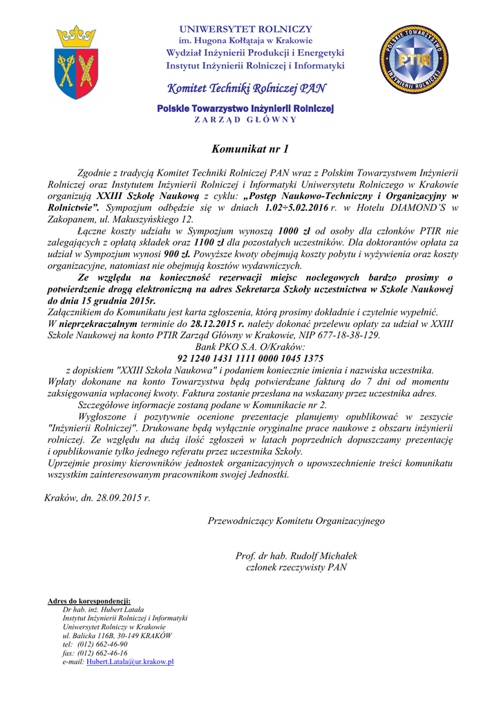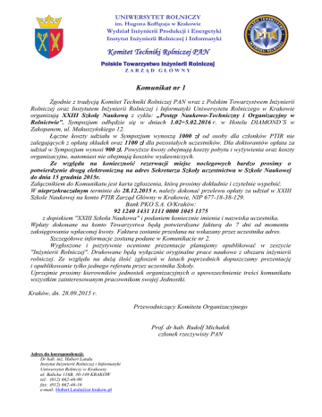 UNIWERSYTET ROLNICZY im. Hugona Kołłątaja w Krakowie Wydział Inżynierii Produkcji i Energetyki Instytut Inżynierii Rolniczej i Informatyki Komitet Techniki Rolniczej PAN Polskie Towarzystwo Inżynierii Rolniczej ZARZĄD GŁÓWNY Komunikat nr 1 Zgodnie z tradycją Komitet Techniki Rolniczej PAN wraz z Polskim Towarzystwem Inżynierii Rolniczej oraz Instytutem Inżynierii Rolniczej i Informatyki Uniwersytetu Rolniczego w Krakowie organizują XXIII Szkołę Naukową z cyklu: „Postęp Naukowo-Techniczny i Organizacyjny w Rolnictwie”. Sympozjum odbędzie się w dniach 1.02÷5.02.2016 r. w Hotelu DIAMOND’S w Zakopanem, ul. Makuszyńskiego 12. Łączne koszty udziału w Sympozjum wynoszą 1000 zł od osoby dla członków PTIR nie zalegających z opłatą składek oraz 1100 zł dla pozostałych uczestników. Dla doktorantów opłata za udział w Sympozjum wynosi 900 zł. Powyższe kwoty obejmują koszty pobytu i wyżywienia oraz koszty organizacyjne, natomiast nie obejmują kosztów wydawniczych. Ze względu na konieczność rezerwacji miejsc noclegowych bardzo prosimy o potwierdzenie drogą elektroniczną na adres Sekretarza Szkoły uczestnictwa w Szkole Naukowej do dnia 15 grudnia 2015r. Załącznikiem do Komunikatu jest karta zgłoszenia, którą prosimy dokładnie i czytelnie wypełnić. W nieprzekraczalnym terminie do 28.12.2015 r. należy dokonać przelewu opłaty za udział w XXIII Szkole Naukowej na konto PTIR Zarząd Główny w Krakowie, NIP 677-18-38-129. Bank PKO S.A. O/Kraków: 92 1240 1431 1111 0000 1045 1375 z dopiskiem "XXIII Szkoła Naukowa" i podaniem koniecznie imienia i nazwiska uczestnika. Wpłaty dokonane na konto Towarzystwa będą potwierdzane fakturą do 7 dni od momentu zaksięgowania wpłaconej kwoty. Faktura zostanie przesłana na wskazany przez uczestnika adres. Szczegółowe informacje zostaną podane w Komunikacie nr 2. Wygłoszone i pozytywnie ocenione prezentacje planujemy opublikować w zeszycie "Inżynierii Rolniczej". Drukowane będą wyłącznie oryginalne prace naukowe z obszaru inżynierii rolniczej. Ze względu na dużą ilość zgłoszeń w latach poprzednich dopuszczamy prezentację i opublikowanie tylko jednego referatu przez uczestnika Szkoły. Uprzejmie prosimy kierowników jednostek organizacyjnych o upowszechnienie treści komunikatu wszystkim zainteresowanym pracownikom swojej Jednostki. Kraków, dn. 28.09.2015 r. Przewodniczący Komitetu Organizacyjnego Prof. dr hab. Rudolf Michałek członek rzeczywisty PAN Adres do korespondencji: Dr hab. inż. Hubert Latała Instytut Inżynierii Rolniczej i Informatyki Uniwersytet Rolniczy w Krakowie ul. Balicka 116B, 30-149 KRAKÓW tel: (012) 662-46-90 fax: (012) 662-46-16 e-mail: [email protected]