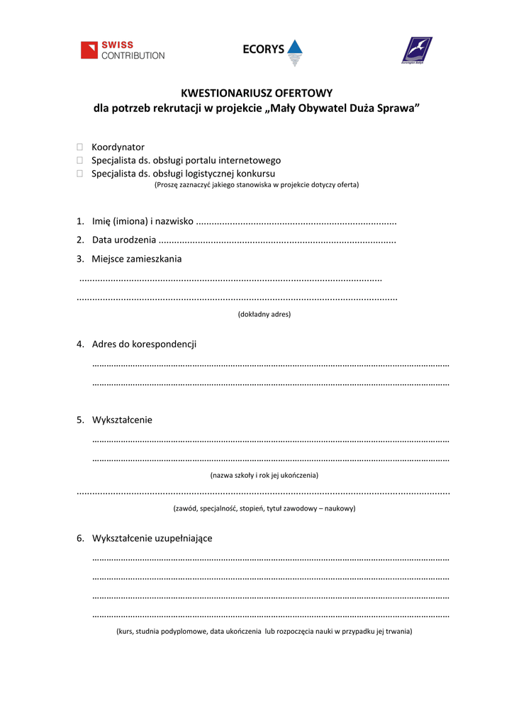 KWESTIONARIUSZ OFERTOWY dla potrzeb rekrutacji w projekcie „Mały Obywatel Duża Sprawa” Koordynator Specjalista ds. obsługi portalu internetowego Specjalista ds. obsługi logistycznej konkursu (Proszę zaznaczyć jakiego stanowiska w projekcie dotyczy oferta) 1. Imię (imiona) i nazwisko ............................................................................. 2. Data urodzenia ........................................................................................... 3. Miejsce zamieszkania .................................................................................................................... ........................................................................................................................... (dokładny adres) 4. Adres do korespondencji …………………………………………………………………………………………………………………………………… …………………………………………………………………………………………………………………………………… 5. Wykształcenie …………………………………………………………………………………………………………………………………… …………………………………………………………………………………………………………………………………… (nazwa szkoły i rok jej ukończenia) ............................................................................................................................................... (zawód, specjalność, stopień, tytuł zawodowy – naukowy) 6. Wykształcenie uzupełniające …………………………………………………………………………………………………………………………………… …………………………………………………………………………………………………………………………………… …………………………………………………………………………………………………………………………………… …………………………………………………………………………………………………………………………………… (kurs, studnia podyplomowe, data ukończenia lub rozpoczęcia nauki w przypadku jej trwania) 7. Kwalifikacje potrzebne do objęcia stanowiska w projekcie .............................................................................................................................................. ............................................................................................................................................... ............................................................................................................................................... ............................................................................................................................................... ............................................................................................................................................... ............................................................................................................................................... 8. Doświadczenie w realizacji projektów o tematyce „dzieci i młodzież” ............................................................................................................................................... ............................................................................................................................................... ............................................................................................................................................... ............................................................................................................................................... ............................................................................................................................................... ............................................................................................................................................... 9. Dodatkowe uprawnienia, umiejętności, zainteresowania (np. stopień znajomości języków obcych, prawo jazdy, obsługa komputera) ............................................................................................................................................... ............................................................................................................................................... ............................................................................................................................................... 10. Proponowana stawka wynagrodzenia brutto (w przypadku koordynatora proszę określić stawkę godzinową, w przypadku pozostałych stanowisk – miesięczną) ................................................................................................................................................. ................................................................................................................................................. ................................................................................................................................................ ........................................ (miejscowość i data) ................................................ (podpis osoby składającej kwestionariusz)