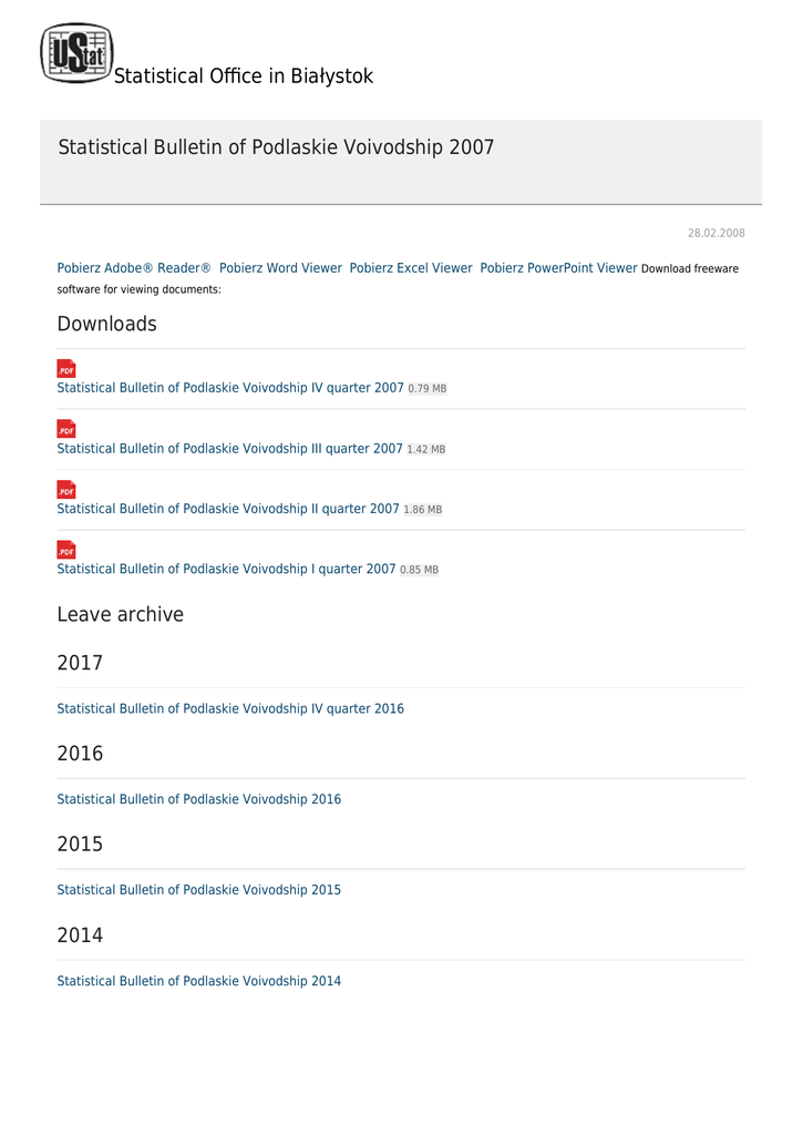 Statistical Office in Białystok Statistical Bulletin of Podlaskie Voivodship 2007 28.02.2008 Pobierz Adobe® Reader® Pobierz Word Viewer Pobierz Excel Viewer Pobierz PowerPoint Viewer Download freeware software for viewing documents: Downloads Statistical Bulletin of Podlaskie Voivodship IV quarter 2007 0.79 MB Statistical Bulletin of Podlaskie Voivodship III quarter 2007 1.42 MB Statistical Bulletin of Podlaskie Voivodship II quarter 2007 1.86 MB Statistical Bulletin of Podlaskie Voivodship I quarter 2007 0.85 MB Leave archive 2017 Statistical Bulletin of Podlaskie Voivodship IV quarter 2016 2016 Statistical Bulletin of Podlaskie Voivodship 2016 2015 Statistical Bulletin of Podlaskie Voivodship 2015 2014 Statistical Bulletin of Podlaskie Voivodship 2014 2013 Statistical Bulletin of Podlaskie Voivodship 2013 2012 Statistical Bulletin of Podlaskie Voivodship 2012 2011 Statistical Bulletin of Podlaskie Voivodship 2011 2010 Statistical Bulletin of Podlaskie Voivodship 2010 2009 Statistical Bulletin of Podlaskie Voivodship 2009 2008 Statistical Bulletin of Podlaskie Voivodship 2008 2007 Statistical Bulletin of Podlaskie Voivodship 2007 2006 Statistical Bulletin of Podlaskie Voivodship 2006 2005 Statistical Bulletin of Podlaskie Voivodship 2005 2004 Statistical Bulletin of Podlaskie Voivodship 2004