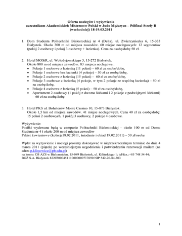 Oferta noclegów i wyżywienia uczestnikom Akademickich Mistrzostw Polski w Judo Mężczyzn – Półfinał Strefy B (wschodniej) 18-19.03.2011 1. Dom Studenta Politechniki Białostockiej nr 4 (Delta), ul. Zwierzyniecka 6, 15-333 Białystok. Około 300 m od miejsca zawodów. 60 miejsc noclegowych: 12 segmentów (pokój 2 osobowy i pokój 3 osobowy + łazienka). Cena za osobę/dobę 50 zł. 2. Hotel MOSiR, ul. Wołodyjowskiego 5, 15-272 Białystok. Około 800 m od miejsca zawodów. 83 miejsca noclegowe.: Pokoje 1 osobowe z łazienką (11 pokoi) – 60 zł za osobę/dobę, Pokoje 1 osobowe bez łazienki (4 pokoje) – 50 zł za osobę/dobę, Pokoje 2 osobowe z łazienką (15 pokoi) – 60 zł za osobę/dobę, Pokoje 3 osobowe z łazienką (4 pokoje, w tym 2 pokoje ze wspólną łazienką) – 50 zł za osobę/dobę, Pokoje 4 osobowe z łazienką (5 pokoi) – 50 zł za osobę/dobę, Apartament 2 osobowy (1 pokój z dwoma łóżkami i 2 pokoje z podwójnymi łóżkami) – 60 zł za osobę/dobę 3. Hotel PKS ul. Bohaterów Monte Cassino 10, 15-873 Białystok. Około 1,5 km od miejsca zawodów. 41 miejsc noclegowych. Cena 40 zł za osobę/dobę: 15 pokoi 2 osobowych, 1 pokój 3 osobowy, 2 pokoje 4 osobowe. Wyżywienie: Posiłki wydawane będą w campusie Politechniki Białostockiej – około 100 m od Domu Studenta nr 4 i około 200 m od miejsca zawodów Pakiet żywieniowy (kolacja18.02.2011, śniadanie i obiad 19.02.2011) – 50 zł/osobę Wpłat za wyżywienie i noclegi prosimy dokonywać w nieprzekraczalnym terminie do dnia 4 marca 2011 (piątek) po wcześniejszym uzgodnieniu i potwierdzeniu rezerwacji mailem (na adres [email protected]) na konto: OŚ AZS w Białymstoku, 15-089 Białystok, ul. Kilińskiego 1; tel/fax.:+85 748 54 44; BGŻ S.A. Białystok 82203000451110000000717690 NIP 542-20-84-803 1