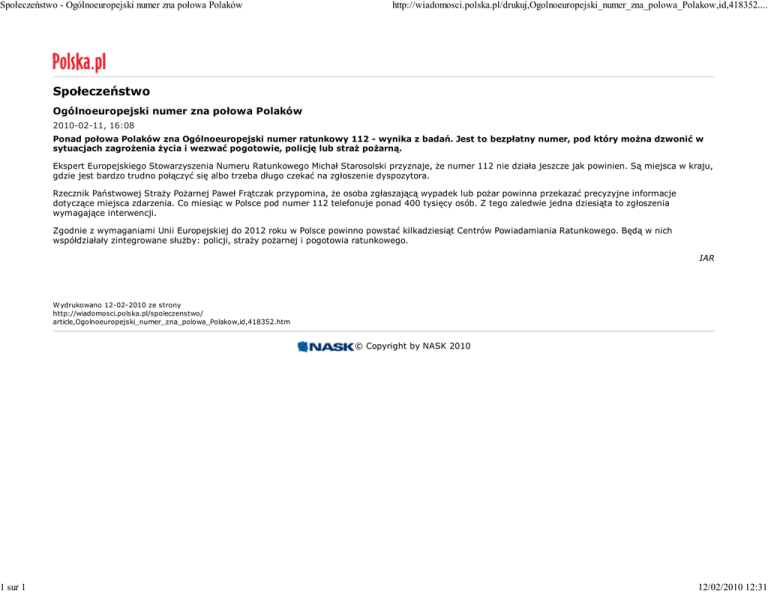 Społeczeństwo - Ogólnoeuropejski numer zna połowa Polaków 1 sur 1 http://wiadomosci.polska.pl/drukuj,Ogolnoeuropejski_numer_zna_polowa_Polakow,id,418352.... Społeczeństwo Ogólnoeuropejski numer zna połowa Polaków 2010-02-11, 16:08 Ponad połowa Polaków zna Ogólnoeuropejski numer ratunkowy 112 - wynika z badań. Jest to bezpłatny numer, pod który można dzwonić w sytuacjach zagrożenia życia i wezwać pogotowie, policję lub straż pożarną. Ekspert Europejskiego Stowarzyszenia Numeru Ratunkowego Michał Starosolski przyznaje, że numer 112 nie działa jeszcze jak powinien. Są miejsca w kraju, gdzie jest bardzo trudno połączyć się albo trzeba długo czekać na zgłoszenie dyspozytora. Rzecznik Państwowej Straży Pożarnej Paweł Frątczak przypomina, że osoba zgłaszającą wypadek lub pożar powinna przekazać precyzyjne informacje dotyczące miejsca zdarzenia. Co miesiąc w Polsce pod numer 112 telefonuje ponad 400 tysięcy osób. Z tego zaledwie jedna dziesiąta to zgłoszenia wymagające interwencji. Zgodnie z wymaganiami Unii Europejskiej do 2012 roku w Polsce powinno powstać kilkadziesiąt Centrów Powiadamiania Ratunkowego. Będą w nich współdziałały zintegrowane służby: policji, straży pożarnej i pogotowia ratunkowego. IAR Wydrukowano 12-02-2010 ze strony http://wiadomosci.polska.pl/spoleczenstwo/ article,Ogolnoeuropejski_numer_zna_polowa_Polakow,id,418352.htm © Copyright by NASK 2010 12/02/2010 12:31