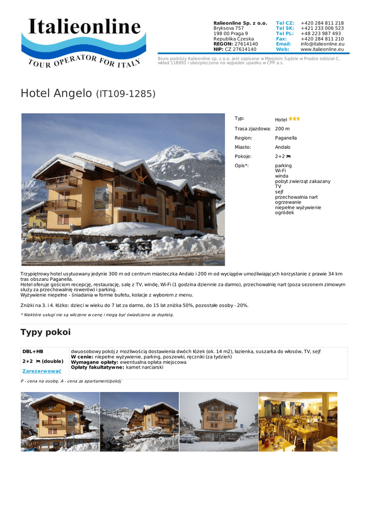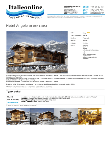 Italieonline Sp. z o.o. Bryksova 757 198 00 Praga 9 Republika Czeska REGON: 27614140 NIP: CZ 27614140 Tel CZ: Tel SK: Tel PL: Fax: Email: Web: +420 284 811 218 +421 233 006 523 +48 223 987 493 +420 284 811 210 [email protected] www.italieonline.eu Biuro podróży Italieonline sp. z o.o. jest zapisane w Miejskim Sądzie w Pradze oddział C, wkład 118991 i ubezpieczone na wypadek upadku w ČPP a.s. Hotel Angelo (IT109-1285) Typ: Hotel Trasa zjazdowa: 200 m Region: Paganella Miasto: Andalo Pokoje: 2+2 Opis*: parking Wi-Fi winda pobyt zwierząt zakazany TV sejf przechowalnia nart ogrzewanie niepełne wyżywienie ogródek Trzypiętrowy hotel usytuowany jedynie 300 m od centrum miasteczka Andalo i 200 m od wyciągów umożliwiających korzystanie z prawie 34 km tras obszaru Paganella. Hotel oferuje gościom recepcję, restaurację, salę z TV, windę, Wi-Fi (1 godzina dziennie za darmo), przechowalnię nart (poza sezonem zimowym służy za przechowalnię rowerów) i parking. Wyżywienie niepełne - śniadania w formie bufetu, kolacje z wyborem z menu. Zniżki na 3. i 4. łóżko: dzieci w wieku do 7 lat za darmo, do 15 lat zniżka 50%, pozostałe osoby - 20%. * Niektóre usługi nie są wliczone w cenę i mogą być świadczone za dopłatą. Typy pokoi DBL+HB 2+2 (double) Zarezerwować dwuosobowy pokój z możliwością dostawienia dwóch łóżek (ok. 14 m2), łazienka, suszarka do włosów, TV, sejf W cenie: niepełne wyżywienie, parking, poszewki, ręczniki (za tydzień) Wymagane opłaty: ewentualna opłata miejscowa Opłaty fakultatywne: karnet narciarski P - cena na osobę, A - cena za apartament/pokój Prezentowane zdjęcia są przykładowe. https://www.italieonline.eu/pl/andalo/hotel-angelo-1285.html www.ITALIEONLINE.eu TOUR OPERATOR FOR ITALY