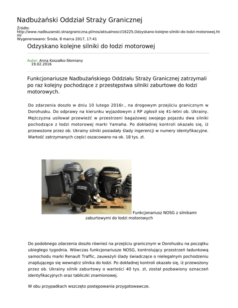 Nadbużański Oddział Straży Granicznej Źródło: http://www.nadbuzanski.strazgraniczna.pl/nos/aktualnosci/16225,Odzyskano-kolejne-silniki-do-lodzi-motorowej.ht ml Wygenerowano: Środa, 8 marca 2017, 17:41 Odzyskano kolejne silniki do łodzi motorowej Autor: Anna Koszałko-Słomiany 19.02.2016 Funkcjonariusze Nadbużańskiego Oddziału Straży Granicznej zatrzymali po raz kolejny pochodzące z przestępstwa silniki zaburtowe do łodzi motorowych. Do zdarzenia doszło w dniu 10 lutego 2016r., na drogowym przejściu granicznym w Dorohusku. Do odprawy na kierunku wyjazdowym z RP zgłosił się 41-letni ob. Ukrainy. Mężczyzna usiłował przewieźć w przestrzeni bagażowej swojego pojazdu dwa silniki pochodzące z łodzi motorowej marki Yamaha. Po dokładnej kontroli okazało się, iż przewożone przez ob. Ukrainy silniki posiadały ślady ingerencji w numery identyfikacyjne. Wartość zatrzymanych części oszacowano na ok. 18 tys. zł. Funkcjonariusz NOSG z silnikami zaburtowymi do łodzi motorowych Do podobnego zdarzenia doszło również na przejściu granicznym w Dorohusku na początku ubiegłego tygodnia. Wówczas funkcjonariusze NOSG, kontrolujący przestrzeń ładunkową samochodu marki Renault Traffic, zauważyli ślady świadczące o nielegalnym pochodzeniu znajdującego się wewnątrz silnika do łodzi. Po dokładnej kontroli okazało się, iż przewożony przez ob. Ukrainy silnik zaburtowy o wartości 40 tys. zł, został pozbawiony oznaczeń identyfikacyjnych oraz tabliczki znamionowej. W obu przypadkach wszczęto postępowania przygotowawcze. Funkcjonariusze Nadbużańskiego Oddziału SG, prowadzą w sposób ciągły kontrolę legalności pochodzenia nie tylko samochodów ale również innych przedmiotów przewożonych przez granicę.