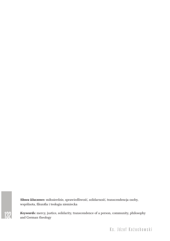 Słowa kluczowe: miłosierdzie, sprawiedliwość, solidarność, transcendencja osoby, wspólnota, filozofia i teologia niemiecka 132 Keywords: mercy, justice, solidarity, transcendence of a person, community, philosophy and German theology Ks. Józef Kożuchowski Warszawskie Studia Teologiczne XXIX/3/2016, 132-148 Ks. Józef Kożuchowski WYŻSZE SEMINARIUM DUCHOWNE W ELBLĄGU MIŁOSIERDZIE WE WSPÓŁCZESNEJ MYŚLI NIEMIECKIEJ – WYBRANE PROBLEMY „Miłosierdzie to oznaka mądrości” (Gerwing, 2016, s. 233) WPROWADZENIE Miłosierdzie jest w szczególnym sensie cnotą Boską (Hildebrand, 1950, s. 288), dlatego ten, kto wypowiada się na temat miłosierdzia, musi wiedzieć, że mówi o Bogu – podkreślił św. Tomasz z Akwinu (Św. Tomasz, tłum. 1934, s. 205– 206). Miłosierdzie ujawnia mądrość człowieka, który zrozumiał, że wobec świata (w aktualnej sytuacji jego „nędzy”) należy przejawiać solidarność. Można mówić również o miłosierdziu ludzkim i to w wielu aspektach, m.in. antropologicznym, etycznym, społecznym, politycznym, kulturowym oraz podkreślać związek tego zagadnienia z sensem życia oraz szczęściem. Problem ten jest zatem rzeczywiście ważny i nie traci na aktualności. Tymczasem, jak się podkreśla, został zapomniany, a nawet karygodnie zaniedbany (Nie można jednak tego powiedzieć o św. Tomaszu z Akwinu – jak celnie zauważył M. Gerwing. Doktor Anielski omówił i przeanalizował problematykę miłosierdzia w dwóch zasadniczych miejscach Sumy teologicznej: w nauce o Bogu – pierwsza część Sumy – oraz w ramach MIŁOSIERDZIE WE WSPÓŁCZESNEJ MYŚLI NIEMIECKIEJ 133 teologicznej wykładni nauki o cnotach dokonanej w czterech artykułach – II–II, kwestia 30; zob. Gerwing, 2016, s. 230). W opinii znawców zagadnienia miłosierdzie przestało być tematem toczonych obecnie debat społecznych. Ponadto pojawia się zarzut, że zagadnienie to jest nośnikiem treści ideologicznych (Kasper, 2012, s. 15). W tym kontekście szczególnie interesujące są analizy, które w bieżącym roku pojawiły się w filozofii i teologii niemieckiej. Zostaną tu zaprezentowane stanowiska trzech uznanych przedstawicieli: filozofii – Holgera Zaborowskiego oraz teologii – Ursuli Nothelle-Wildfeuer i Ursuli Kostki, w nawiązaniu do interesującej interpretacji doktryny św. Tomasza z Akwinu o miłosierdziu (dokonanej również w bieżącym roku przez Manfreda Gerwinga). W artykule będą uwzględnione wybrane problemy dotyczące miłosierdzia, w tym zasadniczy – próba wyjaśnienia, dlaczego również w zsekularyzowanym społeczeństwie i mimo krytyki, wysuwanej także przez teologów pod adresem paradygmatu miłosierdzia, kategoria ta okazuje się nie do zastąpienia, jest nadal aktualna i ważna w życiu społecznym, politycznym, kulturowym, duchowym oraz indywidualnym. OBRAZ MIŁOSIERDZIA W MYŚLI HOLGERA ZABOROWSKIEGO Holger Zaborowski1 słusznie podkreślił, że osoba, która jest miłosierna tylko dlatego, iż Bóg również jest miłosierny – lub ze względu na fakt, że nakazał On miłosierdzie (Łk 6,36) – znajduje się na równi pochyłej. Miłosierdzie staje się wówczas wyłącznie aktem zewnętrznym, spełnianiem obowiązku, które nie dotknie wewnętrznej istoty człowieka i nie pochodzi z jego serca. Człowiek rzeczywiście miłosierny wobec drugiego, czyli zainspirowany mową serca, zmienia się, staje się wewnętrznie inny; nie tylko daje, lecz również otrzymuje. Dla wierzącego miłosierdzie Boga jest wzorem zobowiązującym do naśladownictwa przez akt własnej wolności i poruszenie całej osobowości (Lebensbewegtheit). 134 1 Holger Zaborowski, ur. w 1974 r., studiował filozofię, teologię katolicką oraz filologię łacińską i grecką na uniwersytetach we Freiburgu, Bazylei, Cambridge. Od 2012 r. jest profesorem filozofii w Filozoficzno-Teologicznej Wyższej Szkole (uznanej przez państwo i Kościół) w Vallender. Jego główne kierunki badań to: filozofia nowożytna, filozofia religii i filozofia polityczna. Ks. Józef Kożuchowski Miłosierdzie w zsekularyzowanym społeczeństwie i jego aktualność Niekiedy wydaje się, że miłosierdzie może być interpretowane tylko w aspekcie religijnym – podkreślił Zaborowski (2016a, s. 39). Chrześcijańska perspektywa nie okazuje się jedyna, albowiem nie tylko chrześcijaństwo, lecz również inne religie, np. islam, buddyzm, hinduizm, akcentują znaczenie miłosierdzia w urzeczywistnianiu człowieczeństwa. Zdaniem niemieckiego filozofa, zrozumienie miłosiernego działania z filozoficznej perspektywy jest zadaniem trudnym, a jeszcze trudniejszym jego realizacja. Miłosierdzie odgrywa w filozofii podrzędną rolę. W etyce filozoficznej dużo mówi się o sprawiedliwości i solidarności, obowiązkach i cnotach, wolności i odpowiedzialności, a nadzwyczaj rzadko dotyka się problemu współczucia i miłosierdzia (jest to zazwyczaj podejście krytyczne) (tamże)2. Miłosierdzie traktowane jest jako pojęcie niejasne, jako samo uczucie lub dwuznaczna i nadużywana postawa. W odniesieniu do niego wysuwa się, jak zauważył Zaborowski, różnorakie zarzuty, które można ująć w formie pytań: Czy w imieniu miłosierdzia nie dzieje się często niesprawiedliwość? Czy w miłosiernym działaniu różnice nie są cementowane zamiast być znoszone? Po czym w ogóle można poznać miłosierdzie? Czy nie wynika ono często bardziej z ukrytej miłości do siebie aniżeli do drugiego człowieka? Jak powinno się uzasadnić ogólnie wiążący obowiązek miłosierdzia? Czy to wewnętrzne poruszenie człowieka nie jest tylko sprawą religijną i raczej przedmiotem psychologii niż filozofii? Jednakże kilka argumentów, jak słusznie podkreślił Zaborowski, zdecydowanie przemawia przeciw temu sceptycyzmowi (tamże, s. 40). Jeśli słowo „miłosierdzie” postrzegane jest dzisiaj jako przestarzałe, to jednak na temat znaczenia działania miłosiernego istnieje (