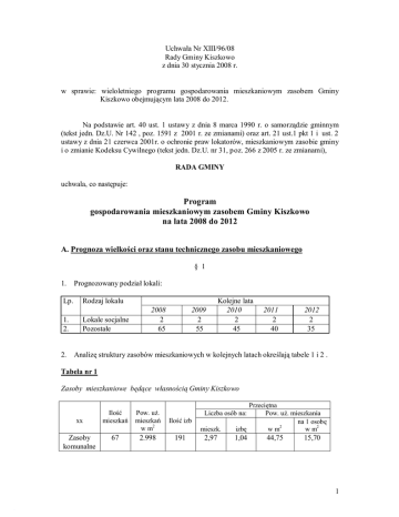 Uchwała Nr XIII/96/08 Rady Gminy Kiszkowo z dnia 30 stycznia 2008 r. w sprawie: wieloletniego programu gospodarowania mieszkaniowym zasobem Gminy Kiszkowo obejmującym lata 2008 do 2012. Na podstawie art. 40 ust. 1 ustawy z dnia 8 marca 1990 r. o samorządzie gminnym (tekst jedn. Dz.U. Nr 142 , poz. 1591 z 2001 r. ze zmianami) oraz art. 21 ust.1 pkt 1 i ust. 2 ustawy z dnia 21 czerwca 2001r. o ochronie praw lokatorów, mieszkaniowym zasobie gminy i o zmianie Kodeksu Cywilnego (tekst jedn. Dz.U. nr 31, poz. 266 z 2005 r. ze zmianami), RADA GMINY uchwala, co następuje: Program gospodarowania mieszkaniowym zasobem Gminy Kiszkowo na lata 2008 do 2012 A. Prognoza wielkości oraz stanu technicznego zasobu mieszkaniowego § 1 1. Lp. 1. 2. 2. Prognozowany podział lokali: Rodzaj lokalu Lokale socjalne Pozostałe 2008 2 65 2009 2 55 Kolejne lata 2010 2 45 2011 2 40 2012 2 35 Analizę struktury zasobów mieszkaniowych w kolejnych latach określają tabele 1 i 2 . Tabela nr 1 Zasoby mieszkaniowe będące własnością Gminy Kiszkowo xx Zasoby komunalne Ilość mieszkań Pow. uż. mieszkań w m2 Ilość izb 67 2.998 191 Przeciętna Pow. uż. mieszkania na 1 osobę izbę w m2 w m2 Liczba osób na: mieszk. 2,97 1,04 44,75 15,70 1 Tabela nr 2 Zasoby mieszkaniowe będące własnością Gminy Kiszkowo w poszczególnych latach: Pow. Lata użytk. Ilość Ilość mieszk. budynk. mieszk. 2 Ilość izb wm 2008 2009 2010 2011 2012 27 25 23 21 20 65 55 45 40 35 2.998 2.551 2.104 1.880 1.656 Przeciętna Liczba osób na Pow. uż. mieszk. Ilość osób 191 161 131 116 105 mieszk. izbę w m2 na 1 os. w m2 3,0 3,0 3,0 2,9 2,9 1,0 1,0 1,0 1,0 1,0 46,1 46,3 46,7 47,0 47,3 15,1 15,0 16,0 16,2 15,7 199 169 139 124 109 § 2 Podział budynków pod kątem wyposażenia: L.p. 1. 2. 3. 4. Rodzaj lokalu Lokal Lokal Lokal Lokal posiadający posiadający posiadający posiadający 2008 11 54 67 62 C. O piece kafl. wodę kanalizację 2009 11 44 57 52 Kolejne lata 2010 11 34 47 42 2011 10 30 42 37 2012 10 25 37 32 B. Analiza potrzeb oraz plan remontów i modernizacji § 3 Analiza potrzeb głównych w zakresie remontów z podziałem na budynki i mieszkania: Rodzaj remontu Remonty dachów (np. wymiana papy, dachówki, konstrukcji dachowej) Malowanie elewacji zewnętrznej budynku Malowanie klatek schodowych Kolejne lata 2008 2009 2010 2011 2012 Bud Miesz Bud Miesz Bud Miesz Bud Miesz Bud Miesz 1 4 1 5 1 2 1 3 1 3 1 2 1 5 2 7 1 3 1 3 1 7 1 5 2 7 1 3 1 3 2 § 4 Plan remontów w poszczególnych latach określa tabela: L.p 1. 2. 3. 4. 5. 6. Remonty (w tys. zł) Wymiana pokryć dachowych Malowanie elewacji zewnętrznej budynków Malowanie klatek schodowych Wykonanie kominów Wymiana rur, rynien, opierzeń i papy na dachu Naprawy różne RAZEM 2008 20.000 15.000 Kolejne lata 2009 2010 2011 30.000 20.000 25.000 20.000 20.000 18.000 2012 25.000 19.000 18.000 7.000 12.000 12.000 6.000 7.000 12.000 8.000 12.000 13.000 8.000 14.000 3.100 75.100 3.000 78.000 6.000 81.000 5.000 84.000 20.000 6.000 10.000 4.000 80.000 C. Sprzedaż lokali § 5 Planowana sprzedaż lokali mieszkalnych w kolejnych latach: 2008 10 lokali Sprzedaż lokali w kolejnych latach 2009 2010 2011 10 lokali 5 lokali 5 lokali 2012 5 lokali D. Zasady polityki czynszowej § 6 Ustala się następujące rodzaje czynszów dla lokali stanowiących mieszkaniowy zasób Gminy: a) za lokale mieszkalne i zamienne, b) za lokale socjalne, § 7 1. Czynsz obejmuje: podatek od nieruchomości, koszty administrowania, koszty konserwacji, utrzymania technicznego budynku, koszty utrzymania zieleni oraz wszystkich pomieszczeń wspólnego użytkowania, w tym opłaty za utrzymanie czystości, energię elektryczną. 2. Najemca oprócz czynszu jest obowiązany do uiszczania związanych z eksploatacją mieszkania opłat niezależnych od właściciela, tj. opłat za dostawę do lokalu energii, gazu, wody, oraz odbiór nieczystości płynnych w wypadkach gdy korzystający z lokalu nie ma zawartej umowy bezpośrednio z dostawcą mediów lub dostawcą usług. 3 § 8 1. Czynsz ustala się stosując metodę tzw. stawki bazowej za 1 m2 powierzchni użytkowej, uwzględniając czynniki obniżające stawki czynszu według załącznika nr 1 do uchwały. 2. Czynniki obniżające stawki czynszu dotyczą także czynszu za lokale socjalne , albowiem obowiązują dwie odrębne stawki bazowe czynszu , jedna dla lokali mieszkalnych i zamiennych , a druga dla socjalnych. § 9 1. Stawki czynszu miesięcznego za 1 m2 powierzchni użytkowej ustala Zarządzeniem Wójt Gminy Kiszkowo. § 10 Czynsz najmu płacony jest z góry do 10 dnia każdego miesiąca na rachunek wynajmującego, z wyjątkiem przypadków, gdy strony pisemnie ustaliły zmianę terminu i formę. § 11 W sprawach nieuregulowanych niniejszą uchwałą mają zastosowanie obowiązujące przepisy prawa. E. Sposób i zasady zarządzania lokalami i budynkami § 12 1. Opis dzisiejszego sposobu zarządzania. Stan gminnych zasobów mieszkaniowych i jakości usług dla ich lokatorów zależy głównie od systemu zarządzania gminnymi nieruchomościami. Obecnie w Gminie Kiszkowo budynkami komunalnymi zarządza Wójt Gminy Kiszkowo. F. Finansowanie gospodarki mieszkaniowej § 13 Źródła finansowania w kolejnych latach: Lp. 1. 2. Źródła finansowania (w tys. zł) Dochody z czynszu Dochody z lokali użytkowych Razem Kolejne lata 2008 2009 60.350 55.000 42.650 47.000 103.000 102.000 2010 2011 50.000 48.000 47.000 53.000 97.000 101.000 2012 46.000 53.000 99.000 4 § 14 Prognoza wysokości wydatków w kolejnych latach: Lp. 1. 2. 3. Koszty (w tys. zł) Bieżącej eksploatacji Remontów Zarządzania nieruchom. wspóln. z udziałem gminy Razem 2008 11.400 75.100 16.500 2009 9.000 78.000 15.000 103.000 102.000 Kolejne lata 2010 8.000 80.000 9.000 97.000 2011 10.000 81.000 10.000 2012 8.000 84.000 7.000 101.000 99.000 G. Inne działania § 15 W celu poprawy warunków mieszkaniowych i racjonalnego gospodarowania mieszkaniowym zasobem gminy planuje się następujące działania: 1.