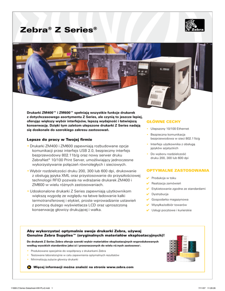 Zebra® Z Series® Drukarki ZM400™ i ZM600™ spełniajà wszystkie funkcje drukarek z dotychczasowego asortymentu Z Series, ale czynià to jeszcze lepiej, oferujàc wi´kszy wybór interfejsów, lepszà wydajnoÊç i łatwiejszà konserwacj´. Dzi´ki tym zaletom ulepszone drukarki Z Series nadajà si´ doskonale do szerokiego zakresu zastosowaƒ. GŁÓWNE CECHY • Ulepszony 10/100 Ethernet • Bezpieczna komunikacja Lepsze do pracy w Twojej firmie bezprzewodowa w sieci 802.11b/g •Drukarki ZM400 i ZM600 zapewniajà rozbudowane opcje komunikacji przez interfejs USB 2.0, bezpieczny interfejs bezprzewodowy 802.11b/g oraz nowy serwer druku ZebraNet® 10/100 Print Server, umo˝liwiajàcy jednoczesne wykorzystywanie połàczeƒ równoległych i sieciowych. • Interfejs u˝ytkownika z obsługà •Wybór rozdzielczoÊci druku 200, 300 lub 600 dpi, drukowanie z obsługà j´zyka XML oraz przystosowanie do przyszłoÊciowej technologii RFID pozwala na wdra˝anie drukarek ZM400 i ZM600 w wielu ró˝nych zastosowaniach. OPTYMALNE ZASTOSOWANIA doskonalone drukarki Z Series zapewniajà u˝ytkownikom •U wi´kszà wygod´ ze wzgl´du na łatwe ładowanie kalki termotransferowej i etykiet, proste wprowadzanie ustawieƒ z pomocà du˝ego wyÊwietlacza LCD oraz uproszczonà konserwacj´ głowicy drukujàcej i wałka. j´zyków azjatyckich • Do wyboru rozdzielczoÊç druku 200, 300 lub 600 dpi ✔✔ Produkcja w toku ✔✔ Realizacja zamówieƒ ✔✔ Etykietowanie zgodne ze standardami ✔✔ Dystrybucja ✔✔ Gospodarka magazynowa ✔✔ Wysyłka/odbiór towarów ✔✔ Usługi pocztowe i kurierskie Aby wykorzystaç optymalnie swoje drukarki Zebra, u˝ywaj Genuine Zebra Supplies™ (oryginalnych materiałów eksploatacyjnych)! Do drukarek Z Series Zebra oferuje szeroki wybór materiałów eksploatacyjnych wyprodukowanych według wysokich standardów jakoÊci i przeznaczonych do wielu ró˝nych zastosowaƒ. • Produkowane specjalnie do współpracy z drukarkami Zebra • Testowane laboratoryjnie w celu zapewnienia optymalnych rezultatów • Minimalizujà zu˝ycie głowicy drukarki Wi´cej informacji mo˝na znaleêç na stronie www.zebra.com 11806 Z Series Datasheet-AW-PLv2.indd 1 7/11/07 11:26:26 PODSTAWOWE DANE TECHNICZNE* WYPOSA˚ENIE STANDARDOWE PARAMETRY KALKI • Technologia druku: termotransferowy lub termiczny • Konstrukcja: podstawa, szkielet i mechanizm głowicy odlewane z aluminium • Metalowa pokrywa zasobnika noÊników z du˝ym oknem • Technologia Element Energy Equalizer™ (E3®) zapewniajàca wysokà jakoÊç druku • Automatyczna kalibracja • Zegar czasu rzeczywistego (RTC) • Zasilacz samonastawny (90–265 V AC) • Instrukcje obsługi oznaczone kolorami • Panel sterowania z wieloj´zycznym podÊwietlanym wyÊwietlaczem graficznym LCD o rozdz. 240x128 pikseli Ârednica zewn´trzna • 81,3 mm DANE TECHNICZNE DRUKAREK RozdzielczoÊç • 8 punktów na mm/203 dpi; 12 punktów na mm/ • 300 dpi; 24 punkty na mm/600 dpi (tylko ZM400) Pami´ç • Standardowo: flash 8 MB, DRAM 16 MB • Opcjonalnie: instalowana fabrycznie pami´ç flash 64 MB SzerokoÊç druku • ZM400: 104 mm • ZM600: 168 mm DługoÊç druku • ZM400: w rozdz. 203 dpi: 3988 mm; w rozdz. 300 dpi: 1854 mm; w rozdz. 600 dpi: 991 mm • ZM600: w rozdz. 203 dpi: 2590 mm; w rozdz. 300 dpi: 1143 mm SzybkoÊÊç druku • 203 dpi: 254 mm/s • 300 dpi: 203 mm/s • 600 dpi: 102 mm/s Czujniki noÊników • Stały czujnik refleksyjny • Regulowany czujnik transmisyjny PARAMETRY NOÂNIKÓW Maksymalna długoÊç etykiet z podkładem • Maksymalna długoÊç noÊników nieciàgłych: 991 mm Maksymalna szerokoÊç etykiet z podkładem • ZM400 – 114 mm • ZM600 – 178 mm Maksymalna Êrednica rolki • 203 mm Êrednica rdzenia • 76 mm GruboÊç noÊników • 0,058 mm do 0,25 mm Rodzaje noÊników • Ciàgłe, typu die-cut, metki/przywieszki, z czarnym znacznikiem • Aby uzyskaç optymalnà jakoÊç druku i wydajnoÊç drukarki, u˝ywaj oryginalnych materiałów eksploatacyjnych Genuine Zebra Supplies Standardowa długoÊç • 300 m lub 450 m Proporcje • Stosunek rolki z noÊnikiem do kalki 3:1. Kalka musi mieç szerokoÊç co najmniej takà jak noÊnik. SzerokoÊç • ZM400: 51 mm do 110 mm • ZM600: 51 mm do 174 mm Układ kalki • Kalka zwijana stronà z barwnikiem na zewnàtrz (mo˝liwoÊç stosowania kalki zwijanej stronà z barwnikiem do wewnàtrz z opcjonalnym trzpieniem na kalk´) Ârednica wewn´trzna rdzenia • 25,4 mm PARAMETRY PRACY Ârodowiskowe • Temp. pracy: 0ºC do 40ºC (termiczny); 5ºC do 40ºC (termotransferowy) • Temp. przechowywania: -40ºC do 60ºC • WilgotnoÊç pracy: 20–85% bez kondensacji • WilgotnoÊç przechowywania: 5–85% bez kondensacji Elektryczne • Uniwersalny zasilacz samonastawny (zgodny z PFC) 90–265 V (AC); 48–62 Hz Spełniane normy • IEC 60950-1, EN 55024, EN 61000-3-2, • EN 61000-3-3, EN 55022 klasa B • Oznakowanie: cTUVus, CE, FCC-B, ICES-003, VCCI, C-Tick, NOM, CCC, GOST-R, BSMI, S‑Mark (Arg), SABS, MIC, ZIK PARAMETRY FIZYCZNE SzerokoÊç • ZM400: 278 mm • ZM600: 341 mm WysokoÊç • ZM400: 338 mm • ZM600: 338 mm Gł´bokoÊç • ZM400: 475 mm • ZM600: 475 mm Masa • ZM400: 15 kg • ZM600: 16 kg Masa z opakowaniem • ZM600: 22 kg • ZM600: 24.5 kg ROZWIÑZANIA ZEBRALINK™ Oprogramowanie • ZebraDesigner™ Pro • ZebraDesigner for XML • ZebraNet™ Bridge Enterprise • ZebraNet Utilities v 7.0 • Sterownik uniwersalny Zebra Universal Driver • Dost´pne dodatkowe czcionki skalowalne i bitmapowe Praca w sieci/interfejsy • ZebraNet Wireless Plus • Serwer druku ZebraNet 10/100 Print Server • Serwer druku ZebraNet PrintServer II • Port szeregowy RS-232-C • Szybki dwukierunkowy interfejs równoległy IEEE 1284 • USB 2.0 Firmware • ZPL II® • EPL™ • Drukowanie z obsługà j´zyka XML • APL™ • Web View • Alert CZCIONKI/GRAFIKA/KODY KRESKOWE Czcionki i zestawy znaków • 7 bitmapowy