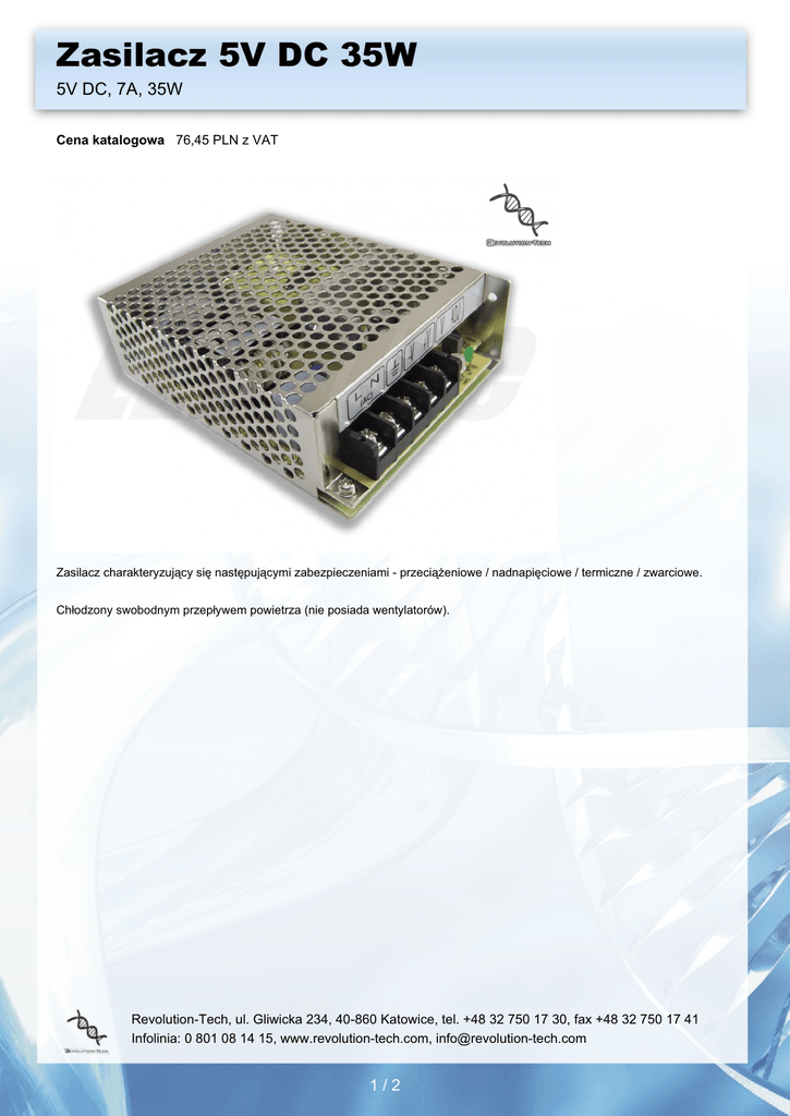 Zasilacz 5V DC 35W 5V DC, 7A, 35W Cena katalogowa 76,45 PLN z VAT Zasilacz charakteryzujący się następującymi zabezpieczeniami - przeciążeniowe / nadnapięciowe / termiczne / zwarciowe. Chłodzony swobodnym przepływem powietrza (nie posiada wentylatorów). Revolution-Tech, ul. Gliwicka 234, 40-860 Katowice, tel. +48 32 750 17 30, fax +48 32 750 17 41 Infolinia: 0 801 08 14 15, www.revolution-tech.com, [email protected] 1/2 Specyfikacje Napięcie wejściowe 88-264 V AC Napięcie wyjściowe 5 V DC Natężenie wyjściowe 7A Moc wyjściowa 35 W Wodoszczelność nie Obudowa metal Wymiary 9,9 / 8,2 / 3,5 cm Waga 0,4 kg Gwarancja 24 m-cy Revolution-Tech, ul. Gliwicka 234, 40-860 Katowice, tel. +48 32 750 17 30, fax +48 32 750 17 41 Infolinia: 0 801 08 14 15, www.revolution-tech.com, [email protected] 2/2