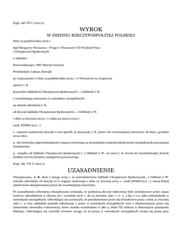Sygn. akt VII U 220/15 WYROK W IMIENIU RZECZYPOSPOLITEJ POLSKIEJ Dnia 13 października 2015 r. Sąd Okręgowy Warszawa - Praga w Warszawie VII Wydział Pracy i Ubezpieczeń Społecznych w składzie: Przewodniczący: SSO Marcin Graczyk Protokolant: Łukasz Jóźwiak po rozpoznaniu w dniu 13 października 2015 r. w Warszawie na rozprawię sprawy I. K. przeciwko Zakładowi Ubezpieczeń Społecznych (...) Oddział w W. o wcześniejszą emeryturę (z warunków szczególnych) na skutek odwołania I. K. od decyzji Zakładu Ubezpieczeń Społecznych (...) Oddział w W. z dnia 12 stycznia 2015 r. i z dnia 23 marca 2015 r. znak: ENMS/10/(...) 1. zmienia zaskarżone decyzje w ten sposób, że przyznaje I. K. prawo do wcześniejszej emerytury od dnia 1 grudnia 2014 roku; 2. nie stwierdza odpowiedzialności organu rentowego za nieustalenie ostatniej okoliczności niezbędnej do przyznania świadczenia; 3. zasądza od Zakładu Ubezpieczeń Społecznych (...) Oddział w W. na rzecz I. K. kwotę 60 (sześćdziesiąt) złotych tytułem zwrotu kosztów zastępstwa procesowego. Sygn. akt. VII U 220/15 UZASADNIENIE Ubezpieczona I. K. dnia 2 lutego 2015 r. za pośrednictwem Zakładu Ubezpieczeń Społecznych(...) Oddział w W. wniosła odwołanie od decyzji w/w organu rentowego z dnia 12 stycznia 2015 r., znak ENMS/10/(...), mocą której odmówiono ubezpieczonej prawa do wcześniejszej emerytury. W uzasadnieniu odwołania ubezpieczona wskazała, że podstawą decyzji odmownej było niezaliczenie przez organ rentowy zatrudnienia w okresie od 1 września 1976 r. do 31 stycznia 1997 r. w (...) Sp. z o.o. jako zatrudnienia w warunkach szczególnych. Odwołująca się zaznaczyła, że przedstawione przez nią świadectwo pracy z dnia 31 stycznia 1997 r. w tym zakładzie posiada informację o pracy w warunkach szczególnych oraz o obejmowanym przez nią stanowisku obuwnika wykrawacza, które zostało wymienione w pkt 4, dział VII wykazu A dotyczącym przemysłu lekkiego. Odwołująca się zwróciła również uwagę, że za pracę w warunkach szczególnych uważa się pracę przy produkcji spodów obuwniczych ze skóry, gumy i tworzyw sztucznych oraz klejenie i powlekanie tkanin obuwniczych. Praca ta odpowiada pracy na stanowisku cholewkarz ortopeda w rozumieniu rozporządzenia Ministra Zdrowia i Opieki Społecznej z dnia 12 lipca 1983 r. Swoje stanowisko w powyższym zakresie ubezpieczona poparła orzeczeniem Sądu Okręgowego w Gdańsku. Ponadto, zdaniem odwołującej, zaniedbania pracodawcy w zakresie prawidłowego wystawienia świadectwa pracy oraz świadectwa wykonywania pracy w szczególnych warunkach nie może w sposób negatywny oddziaływać na jej uprawnienia emerytalne. Okoliczność ta powinna zostać uwzględniona przez organ rentowy z urzędu. W odpowiedzi na odwołanie z dnia 13 lutego 2015 r. Zakład Ubezpieczeń Społecznych (...) Oddział w W. wniósł o oddalenie odwołania I. K. na podstawie art. 47714 § 1 k.p.c. Przedstawiając swoje stanowisko w sprawie organ rentowy podkreślił, że zgodnie z jego oceną ubezpieczona nie udokumentowała 15 letniego okresu pracy w szczególnych warunkach szczególnych i nie złożyła wniosku o przekazanie środków zgromadzonych na rachunku na dochody budżetu państwa mimo członkostwa w otwartym funduszu emerytalnym. Organ rentowy nie uwzględnił okresu zatrudnienia ubezpieczonej w (...) Sp. z o.o. ponieważ na przedłożonym świadectwie pracy z dnia 31 stycznia 1997 r. istniała rozbieżność w zajmowanych stanowiskach – zakład pracy powołał się na poz. 14, pkt 4 dział VII wykazu A stanowiącego załącznik do rozporządzenia Ministra Zdrowia i Opieki Społecznej z dnia 12 lipca 1983 r. w którym wskazano stanowisko cholewkarz ortopeda, natomiast w przedmiotowym świadectwie pracy wskazano, że odwołująca zajmowała stanowisko obuwnika wykrawacza. W tych okolicznościach oraz na podstawie przywołanych przepisów organ rentowy uznał decyzję za zasadną i zgodną z prawem. Sąd Okręgowy ustalił następujący stan faktyczny: I. K., urodzona w dniu (...), była zatrudniona w (...) Sp. z o.o. w W. w okresie od 1 września 1976 r. do 31 stycznia 1997 r. na stanowisku obuwnik wykrawacz. Zakład pracy zajmował się produkcją obuwia, jednakże nie wykonywał butów ortopedycznych i nikt nie pracował na stanowisku cholewkarz ortopeda. Praca w przedsiębiorstwie odbywała się na hali produkcyjno-montażowej o wielkiej powierzchni. Na hali pracowały wszystkie oddziały, znajdowały się taśmy montażowe oraz magazyn, panował hałas i unosił się zapach kleju. Praca odwołującej polegała głównie na ręcznym sklejaniu podeszw skórzanych oraz spajaniu ze sobą różnych elementów butów klejem butapren lub kauczukiem. Odwołująca pracowała również przy wykrawaniu skóry na elementy butów i wygładzaniu skóry przy użyciu przeznaczonych na ten cel maszyn, a także przy końcowym czyszczeniu butów rozpuszczalnikiem i acetylenem. Odwołująca świadczyła pracę w pełnym wymiarze czasu pracy, przez 8 godzin dziennie (zeznania świadka A. O., dowód z przesłuchania I. K., akta osobowe I. K. k. 73-73 a.s.). Dnia 22 grudnia 2014 r. I. K. złożyła do Zakładu Ubezpieczeń Społecznych (...) Oddział w W. wniosek o emeryturę wraz z kwestionariuszem informacyjnym dotyczącym okresów składkowych i nieskładkowych oraz załącznikami (wniosek o emeryturę, kwestionariusz i załączniki k. 1-25 tom I a.r.). W dniu 12 stycznia 2015 r. Zakład Ubezpieczeń Społecznych (...) Oddział w W. wydał decyzję znak: ENMS/10/(...) mocą której odmówił ubezpieczonej prawa do emerytury. Za podstawę odmowy organ rentowy przyjął nieudowodnienie przez ubezpieczoną okresu 15 lat pracy w warunkach szczególnych oraz niezłożenie wniosku o przekazanie środków zgromadzonych na rachunku w otwartym funduszu emerytalnym na dochody budżetu państwa pomimo członkostwa ubezpieczonej w funduszu (decyzja ZUS z 12.01.2015 r. tom I k. 43 a.r.). Dnia