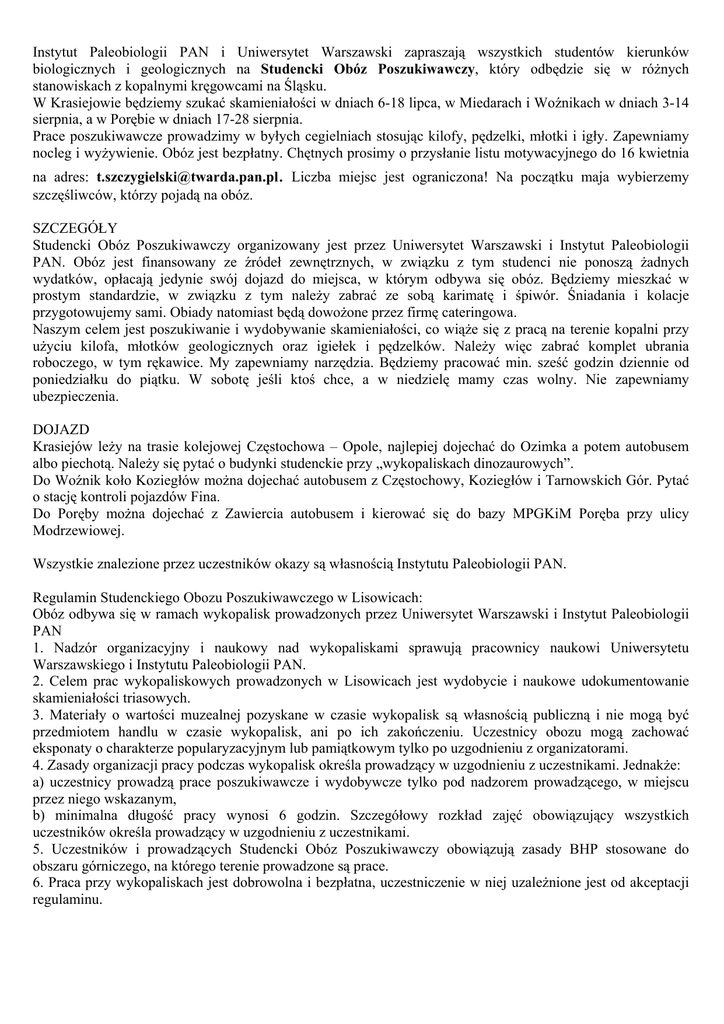 Instytut Paleobiologii PAN i Uniwersytet Warszawski zapraszają wszystkich studentów kierunków biologicznych i geologicznych na Studencki Obóz Poszukiwawczy, który odbędzie się w różnych stanowiskach z kopalnymi kręgowcami na Śląsku. W Krasiejowie będziemy szukać skamieniałości w dniach 6-18 lipca, w Miedarach i Woźnikach w dniach 3-14 sierpnia, a w Porębie w dniach 17-28 sierpnia. Prace poszukiwawcze prowadzimy w byłych cegielniach stosując kilofy, pędzelki, młotki i igły. Zapewniamy nocleg i wyżywienie. Obóz jest bezpłatny. Chętnych prosimy o przysłanie listu motywacyjnego do 16 kwietnia na adres: [email protected]. Liczba miejsc jest ograniczona! Na początku maja wybierzemy szczęśliwców, którzy pojadą na obóz. SZCZEGÓŁY Studencki Obóz Poszukiwawczy organizowany jest przez Uniwersytet Warszawski i Instytut Paleobiologii PAN. Obóz jest finansowany ze źródeł zewnętrznych, w związku z tym studenci nie ponoszą żadnych wydatków, opłacają jedynie swój dojazd do miejsca, w którym odbywa się obóz. Będziemy mieszkać w prostym standardzie, w związku z tym należy zabrać ze sobą karimatę i śpiwór. Śniadania i kolacje przygotowujemy sami. Obiady natomiast będą dowożone przez firmę cateringowa. Naszym celem jest poszukiwanie i wydobywanie skamieniałości, co wiąże się z pracą na terenie kopalni przy użyciu kilofa, młotków geologicznych oraz igiełek i pędzelków. Należy więc zabrać komplet ubrania roboczego, w tym rękawice. My zapewniamy narzędzia. Będziemy pracować min. sześć godzin dziennie od poniedziałku do piątku. W sobotę jeśli ktoś chce, a w niedzielę mamy czas wolny. Nie zapewniamy ubezpieczenia. DOJAZD Krasiejów leży na trasie kolejowej Częstochowa – Opole, najlepiej dojechać do Ozimka a potem autobusem albo piechotą. Należy się pytać o budynki studenckie przy „wykopaliskach dinozaurowych”. Do Woźnik koło Koziegłów można dojechać autobusem z Częstochowy, Koziegłów i Tarnowskich Gór. Pytać o stację kontroli pojazdów Fina. Do Poręby można dojechać z Zawiercia autobusem i kierować się do bazy MPGKiM Poręba przy ulicy Modrzewiowej. Wszystkie znalezione przez uczestników okazy są własnością Instytutu Paleobiologii PAN. Regulamin Studenckiego Obozu Poszukiwawczego w Lisowicach: Obóz odbywa się w ramach wykopalisk prowadzonych przez Uniwersytet Warszawski i Instytut Paleobiologii PAN 1. Nadzór organizacyjny i naukowy nad wykopaliskami sprawują pracownicy naukowi Uniwersytetu Warszawskiego i Instytutu Paleobiologii PAN. 2. Celem prac wykopaliskowych prowadzonych w Lisowicach jest wydobycie i naukowe udokumentowanie skamieniałości triasowych. 3. Materiały o wartości muzealnej pozyskane w czasie wykopalisk są własnością publiczną i nie mogą być przedmiotem handlu w czasie wykopalisk, ani po ich zakończeniu. Uczestnicy obozu mogą zachować eksponaty o charakterze popularyzacyjnym lub pamiątkowym tylko po uzgodnieniu z organizatorami. 4. Zasady organizacji pracy podczas wykopalisk określa prowadzący w uzgodnieniu z uczestnikami. Jednakże: a) uczestnicy prowadzą prace poszukiwawcze i wydobywcze tylko pod nadzorem prowadzącego, w miejscu przez niego wskazanym, b) minimalna długość pracy wynosi 6 godzin. Szczegółowy rozkład zajęć obowiązujący wszystkich uczestników określa prowadzący w uzgodnieniu z uczestnikami. 5. Uczestników i prowadzących Studencki Obóz Poszukiwawczy obowiązują zasady BHP stosowane do obszaru górniczego, na którego terenie prowadzone są prace. 6. Praca przy wykopaliskach jest dobrowolna i bezpłatna, uczestniczenie w niej uzależnione jest od akceptacji regulaminu.