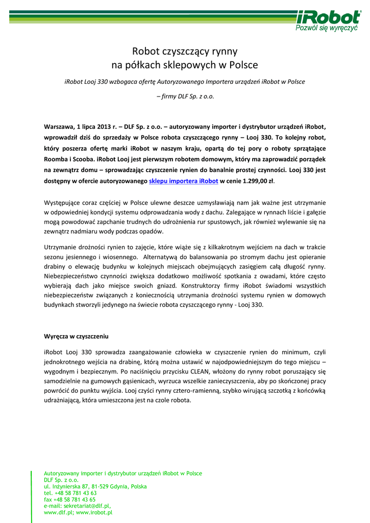 Robot czyszczący rynny na półkach sklepowych w Polsce iRobot Looj 330 wzbogaca ofertę Autoryzowanego Importera urządzeń iRobot w Polsce – firmy DLF Sp. z o.o. Warszawa, 1 lipca 2013 r. – DLF Sp. z o.o. – autoryzowany importer i dystrybutor urządzeń iRobot, wprowadził dziś do sprzedaży w Polsce robota czyszczącego rynny – Looj 330. To kolejny robot, który poszerza ofertę marki iRobot w naszym kraju, opartą do tej pory o roboty sprzątające Roomba i Scooba. iRobot Looj jest pierwszym robotem domowym, który ma zaprowadzić porządek na zewnątrz domu – sprowadzając czyszczenie rynien do banalnie prostej czynności. Looj 330 jest dostępny w ofercie autoryzowanego sklepu importera iRobot w cenie 1.299,00 zł. Występujące coraz częściej w Polsce ulewne deszcze uzmysławiają nam jak ważne jest utrzymanie w odpowiedniej kondycji systemu odprowadzania wody z dachu. Zalegające w rynnach liście i gałęzie mogą powodować zapchanie trudnych do udrożnienia rur spustowych, jak również wylewanie się na zewnątrz nadmiaru wody podczas opadów. Utrzymanie drożności rynien to zajęcie, które wiąże się z kilkakrotnym wejściem na dach w trakcie sezonu jesiennego i wiosennego. Alternatywą do balansowania po stromym dachu jest opieranie drabiny o elewację budynku w kolejnych miejscach obejmujących zasięgiem całą długość rynny. Niebezpieczeństwo czynności zwiększa dodatkowo możliwość spotkania z owadami, które często wybierają dach jako miejsce swoich gniazd. Konstruktorzy firmy iRobot świadomi wszystkich niebezpieczeństw związanych z koniecznością utrzymania drożności systemu rynien w domowych budynkach stworzyli jedynego na świecie robota czyszczącego rynny - Looj 330. Wyręcza w czyszczeniu iRobot Looj 330 sprowadza zaangażowanie człowieka w czyszczenie rynien do minimum, czyli jednokrotnego wejścia na drabinę, którą można ustawić w najodpowiedniejszym do tego miejscu – wygodnym i bezpiecznym. Po naciśnięciu przycisku CLEAN, włożony do rynny robot poruszający się samodzielnie na gumowych gąsienicach, wyrzuca wszelkie zanieczyszczenia, aby po skończonej pracy powrócić do punktu wyjścia. Looj czyści rynny cztero-ramienną, szybko wirującą szczotką z końcówką udrażniającą, która umieszczona jest na czole robota. Autoryzowany importer i dystrybutor urządzeń iRobot w Polsce DLF Sp. z o.o. ul. Inżynierska 87, 81-529 Gdynia, Polska tel. +48 58 781 43 63 fax +48 58 781 43 65 e-mail: [email protected], www.dlf.pl; www.irobot.pl Główne właściwości: Cztero-ramienna, wirująca z prędkością 500 obrotów na minutę szczotka, która wyrzuca zanieczyszczenia z rynny Podczas czyszczenia iRobot Looj rozpoznaje i automatycznie dostosowuje się do rodzaju zabrudzeń, aby czyścić jak najefektywniej Litowo-jonowy akumulator o mocy 7,2 V zapewnia wysoką wydajność pracy robota Udrażniająca część szczotki zwiększa wydajność robota oraz toruje mu drogę Niski profil robota, pozwala na czyszczenie większości standardowych rynien na świecie Zdalne sterowanie o zasięgu przeszło 15 metrów pozwala czyścić długie odcinki rynien Wymienne ramiona szczotki czyszczącej podnoszą wydajność Wodoodporna obudowa zwiększa użyteczność i pozwala na czyszczenie robota za pomocą węża ogrodowego Czas czyszczenia – 9,14 metrów (liczone liniowo) w ciągu 5 minut. Wydajność akumulatora – 61 metrów (liczone liniowo) na jednym ładowaniu Podstawowe wyposażenie robota, Robot z demontowanym uchwytem Cztero-ramienny świder złożony z gumowych łopatek i szczotek Dodatkowa para kompaktowych gumowych łopatek Ściągacz Zaczep na pasek Akumulator Ładowarka Zestaw akcesoriów: 4 wymienne łopatki 3 wymienne końcówki udrażniające 1 ściągacz gumowy ze szczotkami Miękki futerał iRobot Looj 330 jest już teraz dostępny w Oficjalnym Sklepie iRobot http://sklep.irobot.pl/ w cenie 1.299,00 zł. Autoryzowany importer i dystrybutor urządzeń iRobot w Polsce DLF Sp. z o.o. ul. Inżynierska 87, 81-529 Gdynia, Polska tel. +48 58 781 43 63 fax +48 58 781 43 65 e-mail: [email protected], www.dlf.pl; www.irobot.pl O iRobot Corporation iRobot projektuje i buduje roboty, które zmieniają rzeczywistość. Projektowane przez firmę roboty domowe pomagają ludziom szukać inteligentnych sposobów na sprzątanie, a roboty przeznaczone dla administracji publicznej i przemysłu pomagają chronić ludzi w strefach niebezpiecznych. Roboty konsumenckie i wojskowe cechuje iRobot Aware ®, czyli system inteligencji robota - opatentowana technologia wprowadzająca zaawansowane rozwiązania w dziedzinie nawigacji, poruszania się, sterowania i sztucznej inteligencji. Po więcej informacji na temat iRobot zapraszamy na stronę: http://www.irobot.pl/. O DLF Sp. z o.o. Autoryzowany importer i dystrybutor urządzeń iRobot w Polsce. DLF sp. z o.o. z Gdyni istnieje na polskim rynku od początku lat dziewięćdziesiątych i specjalizuje się w sprzedaży nowoczesnych produktów z zakresu Hi-tech, robotyki i AGD. Celem DLF jest dostarczenie klientom najwyższej jakości urządzeń, które poprawiają jakość życia. Obecnie firma jest autoryzowanym importerem lub dystrybutorem marek takich jak: iRobot, Pleo, Stadler Form, Stylies, Aura Roboclean, Ozonomatic, Kohersen, Zedi oraz Coway. Więcej informacji: Dariusz Zieliński RUMOUR Public Relations Tel.: 0 501 52 52 86 E-mail: [email protected] Autoryzowany importer i dystrybutor urządzeń iRobot w Polsce DLF Sp. z o.o. ul. Inżynierska 87, 81-529 Gdynia, Polska tel. +48 58 781 43 63 fax +48 58 781 43 65 e-mail: [email protected], www.dlf.pl; www.irobot.pl