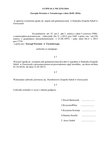 UCHWAŁA NR 22/91/2016 Zarządu Powiatu w Tarnobrzegu z dnia 28.09 .2016r. w sprawie wyrażenia zgody na najem sali gimnastycznej w budynku Zespołu Szkół w Gorzycach Na podstawie art. 32 ust 2 pkt 3 ustawy z dnia 5 czerwca 1998r. o samorządzie powiatowym / tekst jedn. Dz. U. z 2015, poz.1445 z póżn. zm. / art.25b ustawy o gospodarce nieruchomościami z 21.08.1997r. / jedn. tekst Dz.U z 2015 poz.1774/ z póżn.zm./ Zarząd Powiatu w Tarnobrzegu uchwala co następuje : §1 Wyrazić zgodę na wynajem sali gimnastycznej dwa dni w tygodniu w budynku Zespołu Szkół w Gorzycach z przeznaczeniem na prowadzenie zajęć aerobiku, na okres od dnia 01.10.2016r. do dnia 31.05.2017r. §2 Wykonanie uchwały powierza się Dyrektorowi Zespołu Szkół w Gorzycach. §3 Uchwała wchodzi w życie z dniem podjęcia . 1.Paweł Bartoszek 2.KrzysztofPitra ...................... ...................... 3.Krystyna Kozieja ........................ 4.Danuta Serafin ....................... 5. Jerzy Sudoł .......................