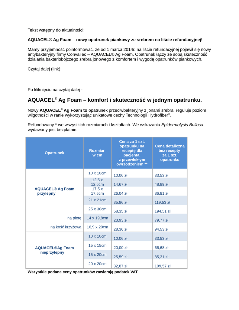 Tekst wstępny do aktualności: AQUACEL® Ag Foam – nowy opatrunek piankowy ze srebrem na liście refundacyjnej! Mamy przyjemność poinformować, że od 1 marca 2014r. na liście refundacyjnej pojawił się nowy antybakteryjny firmy ConvaTec – AQUACEL® Ag Foam. Opatrunek łączy ze sobą skuteczność działania bakteriobójczego srebra jonowego z komfortem i wygodą opatrunków piankowych. Czytaj dalej (link) Po kliknięciu na czytaj dalej - AQUACEL® Ag Foam – komfort i skuteczność w jednym opatrunku. Nowy AQUACEL® Ag Foam to opatrunek przeciwbakteryjny z jonami srebra, reguluje poziom wilgotności w ranie wykorzystując unikatowe cechy Technologii Hydrofiber ®. Refundowany * we wszystkich rozmiarach i kształtach. We wskazaniu Epidermolysis Bullosa, wydawany jest bezpłatnie. Rozmiar w cm Opatrunek 10 x 10cm AQUACEL® Ag Foam przylepny 12,5 x 12,5cm 17,5 x 17,5cm 21 x 21cm 25 x 30cm na piętę 14 x 19,8cm na kość krzyżową 16,9 x 20cm 10 x 10cm AQUACEL®Ag Foam nieprzylepny 15 x 15cm 15 x 20cm 20 x 20cm Cena za 1 szt. opatrunku na receptę dla pacjenta z przewlekłym owrzodzeniem ** Cena detaliczna bez recepty za 1 szt. opatrunku 10,06 zł 33,53 zł 14,67 zł 48,89 zł 26,04 zł 86,81 zł 35,86 zł 119,53 zł 58,35 zł 194,51 zł 23,93 zł 79,77 zł 28,36 zł 94,53 zł 10,06 zł 33,53 zł 20,00 zł 66,68 zł 25,59 zł 85,31 zł 32,87 zł Wszystkie podane ceny opatrunków zawierają podatek VAT 109,57 zł Cennik wszystkich opatrunków refundowanych* firmy ConvaTec znajdziesz tutaj. (proszę wstawić plik w pdfie z załączenia) Korzyści: Zabija szerokie spektrum drobnoustrojów, w tym bakterie MRSA, VRE i inne antybiotykooporne, już w 30 minut po zastosowaniu i jest skuteczny do 7 dni po zastosowaniu Pomaga redukować ból w trakcie zmiany opatrunku Żeluje w kontakcie z wysiękiem, zapewniając optymalne wilgotne środowisko gojenia rany Zatrzymuje we włóknach wysięk z rany wraz ze szkodliwymi komponentami Pionowe włókna zapobiegają rozprzestrzenianiu się płynu, redukując ryzyko maceracji skóry Idealnie dopasowuje się do dna rany, minimalizując puste przestrzenie, w których mogą namnażać się bakterie Na jakie rany? Opatrunek AQUACEL® Ag Foam jako opatrunek pierwotny przeznaczony na rany powierzchowne, zakażone lub z podejrzeniem infekcji, z umiarkowanym i obfitym wysiękiem. *Opatrunki ConvaTec znajdują się w wykazie wyrobów medycznych. Obwieszczenie Ministra Zdrowia z dnia 24 lutego 2014r. w sprawie wykazu refundowanych leków, środków spożywczych specjalnego przeznaczenia żywieniowego oraz wyrobów medycznych na dzień 1 marca 2014r. ** Opatrunki refundowane we wskazaniu przewlekłe owrzodzenia objęte są odpłatnością 30% ich limitu finansowania do wysokości limitu finansowania i za dopłatą w wysokości limitu finansowania Stanowi doskonałe połączenie z opatrunkiem AQUACEL® Ag Extra (również refundowanym) w przypadku ran głębokich.