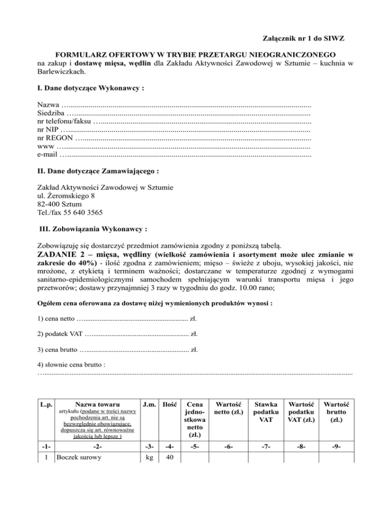 Załącznik nr 1 do SIWZ FORMULARZ OFERTOWY W TRYBIE PRZETARGU NIEOGRANICZONEGO na zakup i dostawę mięsa, wędlin dla Zakładu Aktywności Zawodowej w Sztumie – kuchnia w Barlewiczkach. I. Dane dotyczące Wykonawcy : Nazwa …........................................................................................................................... Siedziba …........................................................................................................................ nr telefonu/faksu …........................................................................................................... nr NIP …........................................................................................................................... nr REGON ….................................................................................................................... www …............................................................................................................................. e-mail …............................................................................................................................ II. Dane dotyczące Zamawiającego : Zakład Aktywności Zawodowej w Sztumie ul. Żeromskiego 8 82-400 Sztum Tel./fax 55 640 3565 III. Zobowiązania Wykonawcy : Zobowiązuję się dostarczyć przedmiot zamówienia zgodny z poniższą tabelą. ZADANIE 2 – mięsa, wędliny (wielkość zamówienia i asortyment może ulec zmianie w zakresie do 40%) - ilość zgodna z zamówieniem; mięso – świeże z uboju, wysokiej jakości, nie mrożone, z etykietą i terminem ważności; dostarczane w temperaturze zgodnej z wymogami sanitarno-epidemiologicznymi samochodem spełniającym warunki transportu mięsa i jego przetworów; dostawy przynajmniej 3 razy w tygodniu do godz. 10.00 rano; Ogółem cena oferowana za dostawę niżej wymienionych produktów wynosi : 1) cena netto ….......................................................... zł. 2) podatek VAT …...................................................... zł. 3) cena brutto …......................................................... zł. 4) słownie cena brutto : …........................................................................................................................................................................... L.p. Nazwa towaru J.m. Ilość artykułu (podane w treści nazwy pochodzenia art. nie są bezwzględnie obowiązujące, dopuszcza się art. równoważne jakością lub lepsze ) -11 -2- -3- -4- Boczek surowy kg 40 Cena jednostkowa netto (zł.) Wartość netto (zł.) Stawka podatku VAT Wartość podatku VAT (zł.) Wartość brutto (zł.) -5- -6- -7- -8- -9- 2 Flak krojony wołowy 1kg kg 40 3 Karczek bez kości kg 30 4 Kiełbasa biała kg 40 5 Kiełbasa typ ”Krakowska” kg 650 6 Kiełbasa typ „Tyrolska” kg 600 7 Kiełbasa typ „Podwawelska, Podlaska, Śląska” kg 300 8 Łopatka bez kości kg 1000 9 Mortadela kg 200 10 Parówki wieprzowe typ „Hod dog” kg 1000 11 Pasztet wieprzowy delikatesowy kg 300 12 Pasztetowa kg 300 13 Schab b/k kg 700 14 Szponder kg 50 15 Szynka b/k surowa kg 700 16 Szynka wędzona parzona kg 600 17 Kiełbasa typ „Szynkowa wieprzowa” kg 500 18 Drób kg 1500 19 Kaszanka kg 200 20 Boczek wędzony kg 3 21 Golonka wieprzowa kg 40 22 Ogonówka kg 500 23 Polędwica sopocka wędzona kg 400 24 Podgardle kg 20 25 Polędwiczki wieprzowe kg 50 26 Kiełbasa żywiecka kg 200 27 Salceson włoski kg 100 28 Gulasz angielski kg 200 X X X RAZEM X Opis obliczenia tabeli : Poz.6 = mnożenie poz. 4 x poz. 5, Poz. 7 – należy wpisać % stawki podatku VAT, Poz. 8 = mnożenie poz. 6 x poz.7, Poz. 9 = poz. 6 + poz. 8 Przewidywany wskaźnik zmiany cen w okresie obowiązywania umowy : …..................................................... …........................................................................................................................................................................... Publikowany w …................................................................................................................................................. Pod adresem : …................................................................................................................................................... Uwaga – zmiana cen musi być publikowana pod adresem internetowym dostępnym w internecie, według niezależnego źródła od obu stron postępowania. Brak wypełnienia publikatora i wskaźnika zmiany ceny spowoduje brak możliwości zmiany ceny w okresie obowiązywania umowy. IV.Oświadczam, że akceptuję : 1) Specyfikację istotnych warunków zamówienia wraz z załącznikami; 2) Proponowany przez zamawiającego wzór umowy …....................................................................... (czytelny podpis lub w przypadku parafki pieczątka imienna upełnomocnionego przedstawiciela) Załącznik nr 1 do SIWZ …....................................................... (miejscowość i data) …................................................................... (pieczęć adresowa firmy Wykonawcy) OŚWIADCZENIE nr 1 Składając ofertę w postępowaniu prowadzonym w trybie przetargu nieograniczonego na zakup z dostawą do Zakładu Aktywności Zawodowej w Sztumie – kuchnia w Barlewiczkach, według podziału na pakiety (zadania) : 3 – mięso i wędliny oświadczamy, że : - spełniamy warunki udziału w postępowaniu określone w art. 22 ust. 1 ustawy z 29 stycznia 2004 roku prawo zamówień publicznych (Dz. U. z 2010r. Nr 113. poz. 75 z późn. zm.). …....................................................................... (czytelny podpis lub w przypadku parafki pieczątka imienna upełnomocnionego przedstawiciela) Załącznik nr 1 do SIWZ …....................................................... (miejscowość i data) …................................................................... (pieczęć adresowa firmy Wykonawcy) OŚW