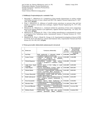 prof. dr hab. inż. Dariusz Mikielewicz, prof. zw. PG Politechnika Gdańska, Wydział Mechaniczny Katedra Energetyki i Aparatury Przemysłowej Tel 058 347 22 54 Email: [email protected] Gdańsk, 4 maja 2016 1. Publikacje (5 najważniejszych z ostatnich 5 lat) 1. Muszyński T., Mikielewicz D., Comparison of heat transfer characteristics in surface cooling with boiling microjets of water, ethanol and HFE7100, Applied Thermal Engineering 93, 1403– 1409, 2016, (40 pkt). 2. Wajs J., Mikielewicz D., Influence of metallic porous microlayer on pressure drop and heat transfer of stainless steel plate heat exchanger, Applied Thermal Engineering 93, 1337–1346, 2016, (40 pkt). 3. Mikielewicz D., Mikielewicz J., Analytical method for calculation of heat source temperature drop for the Organic Rankine Cycle application, Applied Thermal Engineering , vol. 63(2), 541 - 550, 2014. (40 pkt) 4. Mikielewicz D., Klugmann M., Wajs J. Flow boiling intensification in minichannels by means of mechanical flow turbulising inserts, International Journal of Thermal Sciences 65, 79-91, 2013, (40 pkt) 5. Mikielewicz D., Wajs J., Glinski M., Zrooga A.-B., Experimental investigation of dryout of SES 36, R134a, R123 and ethanol in vertical small diameter tubes, Experimental Thermal and Fluid Science 44, 556–564, 2013, (35 pkt) 2. Wykaz przewodów doktorskich zakończonych i otwartych Lp. Doktorant Tytuł pracy doktorskiej 1. Jan Wajs 2. Joanna Tesmar 3. Michał Klugmann 4. 5. Abdul Baset Rajab .S Zrooga Adam Stąsiek 6. Michał Gliński 7. Tomasz Muszyński 8. Rafał Andrzejczyk 9. Paweł Szymański 10. Mirosław Plata 11. Krzysztof Błauciak 12. Elżbieta Żmuda Ruch pęcherzyka w obecności ścianki w warunkach przepływu dwufazowego Uogólniony półempiryczny model procesu wrzenia w przepływie w kanałach o konwencjonalnej i małej średnicy Intensyfikacja wymiany ciepła podczas wrzenia w przepływie w kanałach o małej średnicy Selected aspects of flow boiling in small diameter channels Pasywna intensyfikacja wymiany ciepła na ożebrowanych powierzchniach płaskich Teoretyczne i eksperymentalne modelowanie procesu wysychania filmu cieczowego na ściance kanału w przepływie pierścieniowym Intensyfikacja wymiany ciepła przy pomocy modułów mikrostrugowych Badania wpływu efektu nieadiabatyczności na opory przepływu podczas kondensacji w minikanałach Badania wpływu efektu kapilarnego na wydajność parownika obiegowej rurki ciepła Termomechanika wysokociśnieniowego chłodzenia powierzchni za pomocą mikrostrug Wpływ parametrów konstrukcyjnych wymiennika ciepła z wypełnieniem porowatym na jego efektywność Wykorzystanie obiegu ORC jako sposobu poprawy sprawności obiegu Clausiusa- 22.09.2004 Data zakończenia przewodu lub przypuszczalny termin zakończenia przewodu 09.05.2007 23.02.2005 11.06.2008 23.02.2005 27.01.2010 24.02.2009 22.09.2010 23.01.2008 18.01.2011 24.01.2007 18.05.2011 07.07.2010 14.10.2013 19.10.2011 22.01.2014 19.10.2011 15.10.2014 13.12.2006 Marzec 2013 15.04.2015 Czerwiec 2016 15.10.2014 Grudzień 2016 Data otwarcia przewodu 12. Michał Bajor 13. Blanka Jakubowska 14. Aleksandra Konopka Rankina na podstawie wybranych przykładów Intensyfikacja wymiany ciepła poprzez zastosowanie techniki strugowej w rekuperatorach Modelowanie procesu wrzenia i kondensacji w przepływie w minikanałach perspektywicznych płynów do zastosowań technicznych Suszenie drewna za pomocą ciepła odpadowego przy wykorzystaniu techniki mikrostrugowej 10.06.2015 Grudzień 2017 10.06.2015 Grudzień 2017 Czerwiec 2018 3. Tematyka prowadzonych prac 1. Intensyfikacja procesów wymiany ciepła i masy w przepływach jednofazowych i dwufazowych 2. Nowoczesne obiegi termodynamiczne do produkcji energii elektrycznej 3. Magazynowanie energii 4. Pasywne metody wymiany ciepła i masy 4. Osiągnięcia w tematyce prowadzonych prac 1. Opracowanie modelu wrzenia i kondensacji w przepływie w minikanałach 2. Opracowanie nowoczesnych konstrukcji wymienników ciepła z pompowaniem kapilarnym 3. Opracowanie technologii mikrostrugowych do intensyfikacji wymiany ciepła.