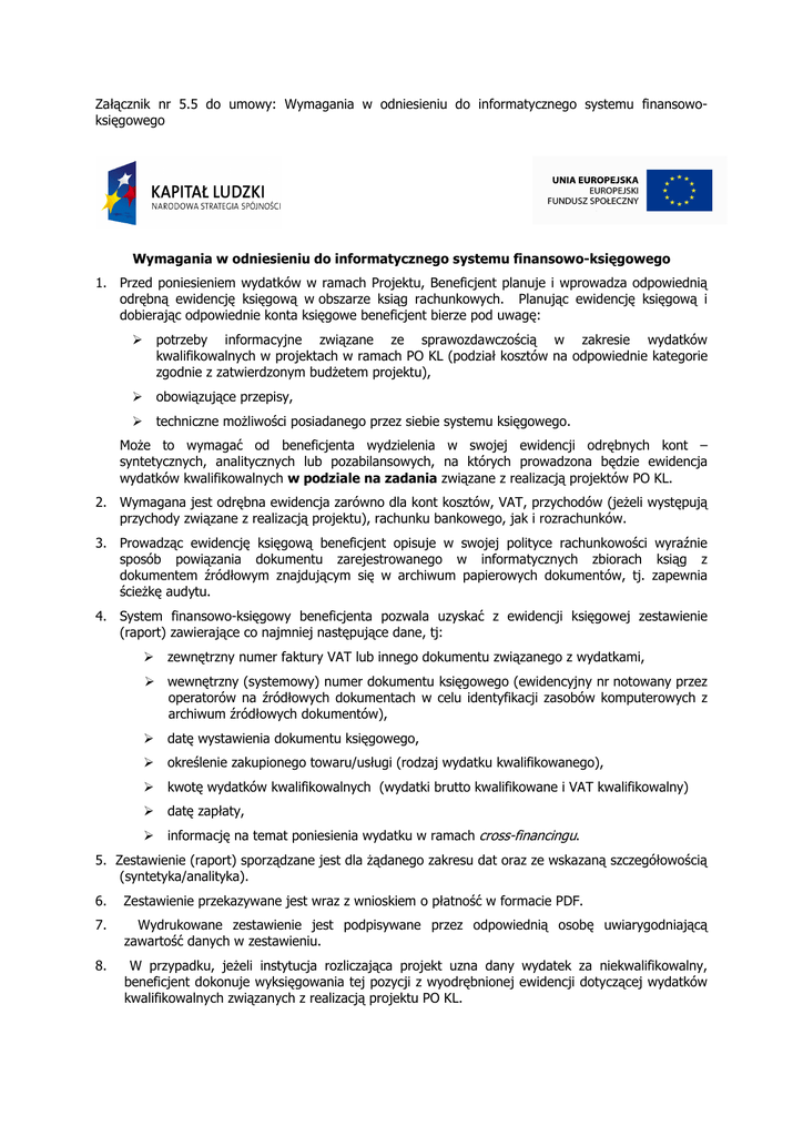 Załącznik nr 5.5 do umowy: Wymagania w odniesieniu do informatycznego systemu finansowoksięgowego Wymagania w odniesieniu do informatycznego systemu finansowo-księgowego 1. Przed poniesieniem wydatków w ramach Projektu, Beneficjent planuje i wprowadza odpowiednią odrębną ewidencję księgową w obszarze ksiąg rachunkowych. Planując ewidencję księgową i dobierając odpowiednie konta księgowe beneficjent bierze pod uwagę: potrzeby informacyjne związane ze sprawozdawczością w zakresie wydatków kwalifikowalnych w projektach w ramach PO KL (podział kosztów na odpowiednie kategorie zgodnie z zatwierdzonym budŜetem projektu), obowiązujące przepisy, techniczne moŜliwości posiadanego przez siebie systemu księgowego. MoŜe to wymagać od beneficjenta wydzielenia w swojej ewidencji odrębnych kont – syntetycznych, analitycznych lub pozabilansowych, na których prowadzona będzie ewidencja wydatków kwalifikowalnych w podziale na zadania związane z realizacją projektów PO KL. 2. Wymagana jest odrębna ewidencja zarówno dla kont kosztów, VAT, przychodów (jeŜeli występują przychody związane z realizacją projektu), rachunku bankowego, jak i rozrachunków. 3. Prowadząc ewidencję księgową beneficjent opisuje w swojej polityce rachunkowości wyraźnie sposób powiązania dokumentu zarejestrowanego w informatycznych zbiorach ksiąg z dokumentem źródłowym znajdującym się w archiwum papierowych dokumentów, tj. zapewnia ścieŜkę audytu. 4. System finansowo-księgowy beneficjenta pozwala uzyskać z ewidencji księgowej zestawienie (raport) zawierające co najmniej następujące dane, tj: zewnętrzny numer faktury VAT lub innego dokumentu związanego z wydatkami, wewnętrzny (systemowy) numer dokumentu księgowego (ewidencyjny nr notowany przez operatorów na źródłowych dokumentach w celu identyfikacji zasobów komputerowych z archiwum źródłowych dokumentów), datę wystawienia dokumentu księgowego, określenie zakupionego towaru/usługi (rodzaj wydatku kwalifikowanego), kwotę wydatków kwalifikowalnych (wydatki brutto kwalifikowane i VAT kwalifikowalny) datę zapłaty, informację na temat poniesienia wydatku w ramach cross-financingu. 5. Zestawienie (raport) sporządzane jest dla Ŝądanego zakresu dat oraz ze wskazaną szczegółowością (syntetyka/analityka). 6. Zestawienie przekazywane jest wraz z wnioskiem o płatność w formacie PDF. 7. Wydrukowane zestawienie jest podpisywane przez odpowiednią osobę uwiarygodniającą zawartość danych w zestawieniu. 8. W przypadku, jeŜeli instytucja rozliczająca projekt uzna dany wydatek za niekwalifikowalny, beneficjent dokonuje wyksięgowania tej pozycji z wyodrębnionej ewidencji dotyczącej wydatków kwalifikowalnych związanych z realizacją projektu PO KL.