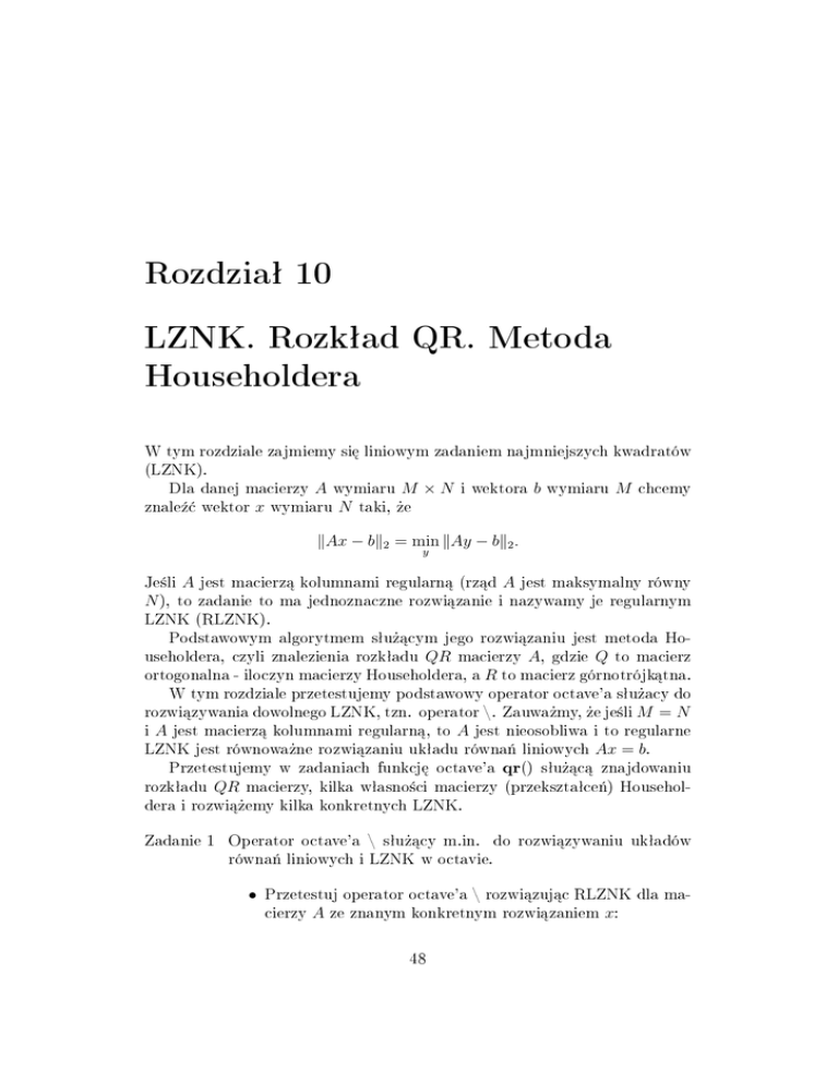 Rozdziaª 10 LZNK. Rozkªad QR. Metoda Householdera W tym rozdziale zajmiemy si¦ liniowym zadaniem najmniejszych kwadratów (LZNK). Dla danej macierzy A wymiaru M × N i wektora b wymiaru M chcemy znale¹¢ wektor x wymiaru N taki, »e kAx − bk2 = min kAy − bk2 . y Je±li A jest macierz¡ kolumnami regularn¡ (rz¡d A jest maksymalny równy N ), to zadanie to ma jednoznaczne rozwi¡zanie i nazywamy je regularnym LZNK (RLZNK). Podstawowym algorytmem sªu»¡cym jego rozwi¡zaniu jest metoda Householdera, czyli znalezienia rozkªadu QR macierzy A, gdzie Q to macierz ortogonalna - iloczyn macierzy Householdera, a R to macierz górnotrójk¡tna. W tym rozdziale przetestujemy podstawowy operator octave'a sªu»acy do rozwi¡zywania dowolnego LZNK, tzn. operator \. Zauwa»my, »e je±li M = N i A jest macierz¡ kolumnami regularn¡, to A jest nieosobliwa i to regularne LZNK jest równowa»ne rozwi¡zaniu ukªadu równa« liniowych Ax = b. Przetestujemy w zadaniach funkcj¦ octave'a qr() sªu»¡c¡ znajdowaniu rozkªadu QR macierzy, kilka wªasno±ci macierzy (przeksztaªce«) Householdera i rozwi¡»emy kilka konkretnych LZNK. Zadanie 1 Operator octave'a \ sªu»¡cy m.in. do rozwi¡zywaniu ukªadów równa« liniowych i LZNK w octavie. • Przetestuj operator octave'a \ rozwi¡zuj¡c RLZNK dla macierzy A ze znanym konkretnym rozwi¡zaniem x: 48 A = [1, 1; 1, −1; 1, 3], x = [1; 2] przyjmuj¡c, »e f = Ax. Czy y=A\f jest rozwi¡zaniem tego ukªadu? Policz normy residualn¡ kAy − f k2 i norm¦ bª¦du kx − yk2 . • Przetestuj ten operator dla nieregularnego LZNK dla macierzy AT z x = [1; 1; 1] i f = Ax. Czy y=A'\f jest rozwi¡zaniem tego ukªadu? Policz normy residualn¡ kAT y − f k2 i norm¦ bª¦du kx − yk2 . Zadanie 2 Rozkªad QR w octave. Funkcje qr(). (a) Zapoznaj si¦ z pomoc¡ do funkcji: qr(). (b) Dla macierzy A = [1, 1; 1, −1; 1, 3] znajd¹ jej rozkªad A = QR z pomoc¡ funkcji qr(). (c) Sprawd¹, czy uzyskana Q jest ortogonalna - policz normy Frobeniusa QQT − I i QT Q − I . (d) Sprawd¹ ten rozkªad licz¡c normy macierzowe: norm¦ drug¡ i norm¦ Frobeniusa bª¦du A − QR. (e) Zastosuj ten rozkªad do znalezienia rozwi¡zania LZNK Ax = f ze znanym rozwi¡zaniem, np. x = [1; 0] i f = [1; 1; 1]. (f) Policz norm¦ drug¡ wektorow¡ pomi¦dzy x, a wynikiem algorytmu w, polegaj¡cym na zastosowaniu odpowiedniego rozkªadu oraz takie same normy residualne, tzn. normy drugie Aw − f oraz Rw − QT f . Zadanie 3 Ukªad równa« normalnych, a rozkªad QR. Rozpatrzmy macierz A2n,k - pod-macierz wymiaru 2n × k macierzy Vandermonde'a A2n,2n dla 2n w¦zªów równoodlegªych na [0, 1]. LZNK z A2n,k z wektorem prawej strony f równym pierwszej kolumnie tej macierzy (rozwi¡zanie to pierwszy wersor) rozwi¡» trzema sposobami: (a) u»ywaj¡c operator \, (b) u»ywaj¡c rozkªad QR uzyskanym funkcj¡ qr(), 49 (c) poprzez rozwi¡zanie ukªadu równa« normalnych: Bx = g dla B = AT2n,k A2n,k , g = AT2n,k f, tzn. tworzymy macierz ukªadu równa« normalnych B , wektor prawej strony g ukªadu równa« normalnych, a nast¦pnie rozwi¡zujemy ukªad równa« normalnych operatorem \ . Macierz Vandermonde'a mo»na w octave'ie utworzy¢ za pomoc¡ funkcji vander(). Przeprowad¹ testy dla N = 10, 20, 40, 80 i k = 2, 4, n. Porównaj • czas oblicze« • bª¡d - kx − yk2 • bª¡d residualny kAx − f k2 dla x rozwi¡zania dokªadnego LZNK, f wektora prawej strony LZNK, y przybli»enia rozwi¡zania uzyskanego dan¡ metod¡. Zadanie 4 Rozkªad QR a operator \ przy rozwi¡zywaniu ukªadów równa« liniowych, Rozpatrzmy macierz An,n Vandermonde'a dla n w¦zªów równoodlegªych na [0, 1]. Ukªad równa« liniowych z wektorem prawej strony równym pierwszej kolumnie tej macierzy (rozwi¡zanie to pierwszy wersor) rozwi¡» dwoma sposobami: (a) operatorem \, (b) rozkªadem QR uzyskanym funkcj¡ qr(), Przetestuj dla N = 10, 20, 40, 80. Porównaj • czas oblicze«, • bª¡d kx − yk2 , • bª¡d rezydualny: kAx − f k2 , dla x rozwi¡zania dokªadnego tego ukªadu równa«, f wektora prawej strony ukªadu i y przybli»enia rozwi¡zania uzyskanego dan¡ metod¡. 50 Zadanie 5 Krzywa najlepiej pasuj¡ca do danych punktów. Zastosuj octave'a do znalezienia wspóªczynników a, b krzywej najlepiej pasuj¡cej do zadanych punktów: (xk , yk ), tzn. znajd¹ takie a, b, »e X |ax2k + byk2 − 1|2 = min c,d k X |cx2k + dyk2 − 1|2 . k Za (xk , yk ) przyjmiemy zaburzone punkty z danej elipsy q yk = 1 − 4 ∗ x2k + zk , gdzie zk to zaburzenie wylosowane z [0, 10−2 ] a xk = 1/k lub xk = −1 + h ∗ k dla h = 2/N k = 1, ..., N . Czy obliczone a i b jest bliskie 4 i 1? W jednym oknie zaznacz punkty (xk , yk ) plusami oraz narysuj fragmenty wykresów obu elips: pierwszej - dla a = 4, b = 1 i drugiej elipsy - dopasowanej do zaburzonych punktów. Powtórz obliczenia dla ró»nych zaburze« zk . Zadanie 6 Zaprogramuj funkcj¦ octave'a function y=H( x , w, nw) która dla danych wektorów ~x i w ~ tego samego wymiaru N i skalaru nw = kwk2 zwróci wektor y = Hw ~x dla Hw = I − 2 ∗ 1 w ~w ~T nw czyli przeksztaªcenia (macierzy) Householdera. Skalar mo»e by¢ parametrem opcjonalnym. Je±li funkcja b¦dzie wywoªana z dwoma tylko parametrami, to norm¦ w mo»na obliczy¢ w tej funkcji. Przetestuj t¦ funkcj¦ dla losowych wektorów ~x i w ~ i sprawd¹, czy kHw ~xk2 = k~xk2 , Hw (Hw x) = x. Zadanie 7 Napisz ogólniejsz¡ wersj¦ funkcji z poprzedniego zadania, tzn.: funkcj¦: function Y=Hm(X, w, nw) , 51 gdzie X macierz N × M i wtedy zwracany wynik to macierz Y = Hw ∗ X . Pozostaªe dwa parametry funkcji pozostan¡ bez zmian. Czy mo»na zaimplementowa¢ tak¡ funkcj¦ bez u»ycia p¦tli? Sprawd¹, wykorzystuj¡c t¦ funkcj¦, czy mno»enie przez macierz Householder nie zmienia norm macierzowych drugiej i Frobeniusa, tzn. czy: kAk2 = kHw ∗ Ak2 = kA ∗ Hw k2 i kAkF = kHw ∗ AkF = kA ∗ Hw kF dla losowej macierzy A i Hw macierzy Householdera dla losowego wektora w 6= 0. Zadanie 8 Znajd¹ wek