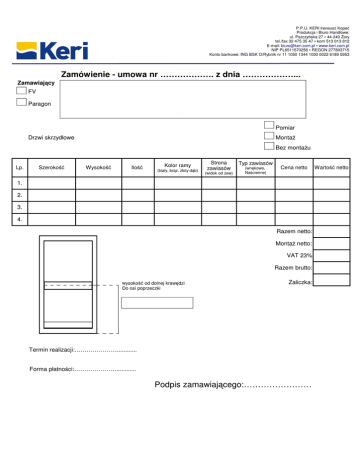 P.P.U. KERI Ireneusz Kopeć Produkcja i Biuro Handlowe: ul. Pszczyńska 27 ▪ 44-240 Żory tel./fax 32 475 35 47 ▪ kom 513 013 812 E-mail: [email protected] ▪ www.keri.com.pl NIP PL6511570256 ▪ REGON 277803715 Konto bankowe: ING BSK O/Rybnik nr 11 1050 1344 1000 0022 6189 5953 Zamówienie - umowa nr ………………. z dnia ………………... Zamawiający FV Paragon Pomiar Drzwi skrzydłowe Montaż Bez montażu Lp. Szerokość Wysokość Ilość Kolor ramy (biały, brąz, złoty dąb) Strona zawiasów (widok od zew) Typ zawiasów (wnękowe, Naścienne) Cena netto 1. 2. 3. 4. Razem netto: Montaż netto: VAT 23% Razem brutto: wysokość od dolnej krawędzi Do osi poprzeczki Zaliczka: Termin realizacji:…………………............ Forma płatności:…………………............ Podpis zamawiającego:…………………… Wartość netto