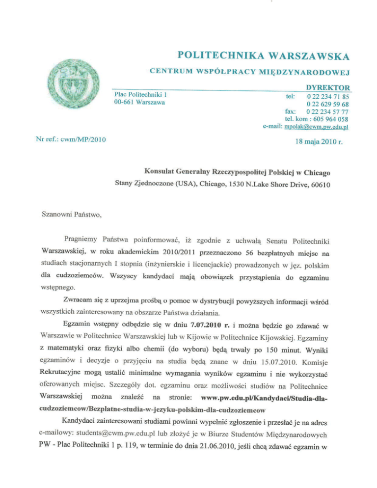 POLITECHNIKA WARSZAWSKA CENTRUM WSP6LPRACY MI4DZYNARODOWEJ DYREKTOR PlacPolitechnikiI 00-661 Warszawa Nr rcf.: cwm/MP/2O10 tel: 0 222347185 0 226295968 fan: 0 22 23457 77 tei.kom: 605964058 e-mail:mpolak@cwm,p!.edu.p! 18maja2010r. Konsulat (;cneralny Rzeczypospolitejpolskiej w Chicago StauyZjednoczone(JSA), Chicago,1530N.Lake ShoreDdvp, 60610 SzanowniPanstwo, Pmg1liemy Panstwa poinfomowac, i2 zgodnie z uchwal4 Senatu politechniki Warszawskiej,w roku akademickih 20l0l2}l1 ptzemaezolo 56 be4*atnych miejsc na studiach stacjonarnychI sl,opnia(inzynierskie i licencjackie) prowadzonychw jQz. polskim dla cudzoziemc6w. Wszyscy kandy&ci majq obowiEzek przystqpienia do egz€ldnu wstQpnego. ZwraoamsiEz uprzejmaproibqo pomocw dystrybucji po&)zszych informacji \rs6d wszystkichzaintercsowanyna obszarzeparlstwadzialania. EgzamiDwstQlrnyodbedziesie w dniu 2.07.2010r. i mozna trqdzie go zdawaCw Warszawiew PoUtechniccWarszawskiejlub w Kijowie w politechniceKijowskiej, Egzaminy z matematyki oraz f\zykt atbo chemii (do ryboru) bqd4 trwaly po 150 minut. W}liki egzamin6wi decyzje o przyjqciu na shrdia bqd4 znane w dniu 15.07.2010.Komisje Rekrutacyjrc mog4 ustaliC minimalne wymagania wyrik6w egzaminu i nie wykorzysla6 ofcrowanych miejsc. szczeg6iy do1. egzarlinu oraz mozliwosci studi6w na politechnice Warszawskiej mo2rtv znaleii na stlonie: www.pw.edu.pl/Kandydaci/Studia-dla_ cudzoziemcodBezplatqFstudia-w-jczyku-polskim-dla-cudzoziemcow Kandydacizainteresowanistudiamipowinni wlpehrii zgloszeniei przeslacje na adres e-mailowy: [email protected] zlo2yi je w Biurze StudentowMigdzlnarodolvych PW - Plac Politechniki 1 p. I 19,w tenninie do dnia 21.06.2010,jesli chc4zdawai egzaminw Kijowic, lub do 5.07.2010, jesli bQd{zdawaeegzaminw Warszawie.W zgloszeniu latezy wskazacwybranemiejscezdawnia egzaminu. WARSZAWSXA .iIOLITECHNIXA .riun {:ljtpJ;cy tt4gdzyndrodowpi ! oDI rraszowa ptc pottrchni[] -2- panstwu: W zai1czeniu przesylamy - tabelez wykazemoferowanych bezplatnych miejscna Z powaiwliem, studiac\ - wz6rformtlaxzazglosze 4 - zakles eg?aBinu i ptzykladowe zad"nia; - wykazdokument6w wymaganych od os6bprzyjetychna studia.