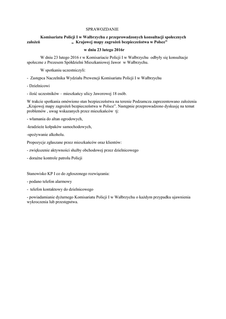 SPRAWOZDANIE założeń Komisariatu Policji I w Wałbrzychu z przeprowadzonych konsultacji społecznych „ Krajowej mapy zagrożeń bezpieczeństwa w Polsce” w dniu 23 lutego 2016r W dniu 23 lutego 2016 r w Komisariacie Policji I w Wałbrzychu odbyły się konsultacje społeczne z Prezesem Spółdzielni Mieszkaniowej Jawor w Wałbrzychu. W spotkaniu uczestniczyli: - Zastępca Naczelnika Wydziału Prewencji Komisariatu Policji I w Wałbrzychu - Dzielnicowi - ilość uczestników – mieszkańcy ulicy Jaworowej 18 osób. W trakcie spotkania omówiono stan bezpieczeństwa na terenie Podzamcza zaprezentowano założenia „Krajowej mapy zagrożeń bezpieczeństwa w Polsce”. Następnie przeprowadzono dyskusję na temat problemów , uwag wskazanych przez mieszkańców tj: - włamania do altan ogrodowych, -kradzieże kołpaków samochodowych, -spożywanie alkoholu. Propozycje zgłaszane przez mieszkańców oraz klientów: - zwiększenie aktywności służby obchodowej przez dzielnicowego - doraźne kontrole patrolu Policji Stanowisko KP I co do zgłoszonego rozwiązania: - podano telefon alarmowy - telefon kontaktowy do dzielnicowego - powiadamianie dyżurnego Komisariatu Policji I w Wałbrzychu o każdym przypadku ujawnienia wykroczenia lub przestępstwa.