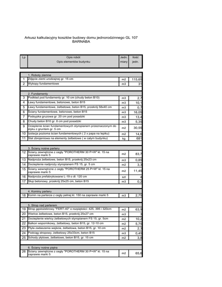 Arkusz kalkulacyjny kosztów budowy domu jednorodzinnego GL 107 BARNABA Lp Opis robót Jedn. Ilość Opis elementów budynku miary jedn. 1. Roboty ziemne 1 Zdjęcie ziemi urodzajnej gr. 15 cm m2 2 Wykopy fundamentowe m3 115,65 31 3 Podkład pod fundamenty gr. 10 cm (chudy beton B10) m3 2,7 4 Ławy fundamentowe, betonowe, beton B15 m3 10,1 5 Ławy fundamentowe, żelbetowe, beton B15, przekrój 58x40 cm m3 0,7 6 Ściany fundamentowe, betonowe, beton B15 m3 16,05 7 Podsypka gruzowa gr. 20 cm pod posadzki m3 13,4 8 Chudy beton B10 gr. 8 cm pod posadzki m3 5,35 m2 30,55 10 Izolacja pozioma ścian fundamentowych ( 2 x papa na lepiku) m2 11 Stal zbrojeniowa na elementy żelbetowe ( w całym budynku) kg 14,6 681 m2 83,7 13 Nadproża żelbetowe, beton B15, przekrój 25x23 cm m3 0,85 14 Docieplenie nadproży styropianem FS 15, gr. 5 cm m2 3,3 m2 11,45 16 Nadproża prefabrykowane L-19 o dł. 120 cm szt 17 Słup betonowy, przekrój 25x25 cm, beton B15 m3 4 0,2 m3 2,75 19 Strop gęstożebrowy "FERT-40" o rozpiętości: 425, 395 i 320cm m2 63,9 20 Wieńce żelbetowe, beton B15, przekrój 25x27 cm m3 3 21 Docieplenie wieńcy żelbetowych styropianem FS 15, gr. 5cm m2 10,2 22 Balkon wspornikowy, żelbetowy, beton B15, gr. 12-10 cm m2 5,75 23 Płyta zadaszenia wejścia, żelbetowa, beton B15, gr. 10 cm m2 2,3 24 Podciąg stropowy, żelbetowy 25x33cm, beton B15 m3 25 Schody płytowe, żelbetowe, beton B15, gr. 15 cm m2 0,45 3,8 m2 65,6 2. Fundamenty 9 Ocieplenie ścian fundamentowych styropianem przeznaczonym do styku z gruntem gr. 5 cm 3. Ściany nośne parteru 12 Ściany zewnętrzne z cegły "POROTHERM 30 P+W" kl. 15 na zaprawie marki 5 15 Ściany wewnętrzne z cegły "POROTHERM 25 P+W" kl. 15 na zaprawie marki 5 4. Kominy parteru 18 Komin na parterze z cegły pełnej kl. 150 na zaprawie marki 5 5. Strop nad parterem 6. Ściany nośne piętra 26 Ściany zewnętrzne z cegły "POROTHERM 30 P+W" kl. 15 na zaprawie marki 5 27 Nadproża zew. w ścianach gr. 30 cm, żelbetowe, beton B15, przekrój m3 0,7 28 Docieplenie nadproży styropianem FS 15, gr. 5 cm m2 2,7 29 Słupki kotwiące, żelbetowe, beton B15, przekrój 25x25 cm m3 0,9 30 Docieplenie słupków kotwiących styropianem FS 15, gr. 5 cm m2 3,5 31 Wieńce opaskowe, żelbetowe, beton B15, przekrój 25x22 cm m3 32 Docieplenie wieńcy żelbetowych styropianem FS 15, gr. 5 cm m2 1,4 5,5 m3 4 m3 0,2 35 Drewno konstrukcyjne więźby kl. K27 m3 36 Konstrukcja dachu w rozwinięciu m2 6,2 127 37 Krycie dachówką m2 127 38 Folia wiatroizolacyjna m2 127 39 Rynny f 100 mb 27 40 Rury spustowe f 70 mb 22 41 Rury spustowe f 50 mb 3,5 42 Wyłaz dachowy o wymiarach min. 80 x 80 cm szt 1 43 Podbitka drewniana, heblowana gr. 2 cm m2 44 Podłoga z desek na kleszczach m2 28 51,5 m2 19,9 46 Izolacja pozioma przeciwwilgociowa (2 x papa na lepiku) m2 66,7 47 Styropian FS 20, gr. 10 cm m2 48 Wylewka betonowa, beton B10, gr. 6, 0 cm, zatarta na gładko m3 68,1 4,1 m2 51,8 50 Styropian FS 20 gr. 3 cm m2 51 Wylewka betonowa, beton B10, gr. 3, 5 cm, zatarta na gładko m3 64,1 2,25 52 Tynk cementowo-wapienny na sufitach m2 66,9 53 Tynk cementowo-wapienny na ścianach od wewnątrz m2 258 54 Ocieplenie ścian zew. styropianem FS 15, gr. 10 cm m2 182,45 55 Ocieplenie cokołu zew. styropianem FS 15, gr. 5 cm m2 11,5 25x25 cm 7. Kominy piętra 33 Komin na piętrze z cegły ceramicznej pełnej kl. 150 na zaprawie marki 5 34 Nakrywy betonowe kominów, beton B15 8. Więźba 9. Dach 10. Ściany działowe parteru 45 Ściany działowe z cegły "POROTHERM 8 P+W" kl. 10 na zaprawie marki 3 11. Podłoga na parterze 12. Ściany działowe piętra 49 Ściana gr. 10 cm z płyt gips. -karton. na ruszcie stalowym 13. Podłoga na piętrze 14. Roboty wykończeniowe Tynki Docieplenie ścian Sufit podwieszany 56 Wełna szklana o gęstości max. 80 kg/m3, gr. 15 cm m2 82,6 57 Wełna szklana o gęstości max. 80 kg/m3, gr. 3 cm m2 67,65 58 Płyta gipsowo-kartonowa na ruszcie stalowym gr. 1, 25 cm m2 67,65 59 Posadzka z płytek gresowych m2 44,75 60 Posadzka z paneli podłogowych m2 87,75 61 Trepy dębowe na schodach m2 3,8 Posadzki Balkon 62 Ocieplenie płyty balkonowej od spodu (FS 15 gr. 2 cm) m2 5 63 x papa na lepiku m2 5,75 64 Styropian FS 20 gr. 3 cm m2 5,75 65 Wylewka betonowa, beton B10, gr. 4 cm, zatarta na gładko m3 0,25 66 Posadzka z płytek gresowych mrozoodpornych m2 5,25 67 Balustrada na schodach mb 68 Balustrada na balkonie mb 9 7,2 69 Okna o wymiarach ościeżnicy f 58 cm szt 1 70 Okna o wymiarach ościeżnicy 58x175, 5 cm szt 1 71 Okna o wymiarach ościeżnicy 88x85, 5 cm szt 1 72 Okna o wymiarach ościeżnicy 118x115, 5 cm szt 2 73 Okna o wymiarach ościeżnicy 178x85, 5 cm szt 1 74 Okna o wymiarach ościeżnicy 118x145, 5 cm szt 2 75 Okna o wymiarach ościeżnicy 58x55, 5 cm szt 1 76 Okna o wymiarach ościeżnicy 238x55, 5 cm szt 1 77 Drzwi wew. pokojowe o wymiarach ościeżnicy 88x205 cm szt 4 78 Drzwi wew. pokojowe o wymiarach ościeżnicy 98x205 cm szt 1 79 Drzwi wew. łazienkowe o wymiarach ościeżnicy 88x205 cm szt 5 80 Drzwi wew. pokojowe o wymiarach ościeżnicy 78x205 cm szt 1 81 Drzwi zew. o wymiarach ościeżnicy 96, 5x234 cm szt 1 82 Drzwi balkonowe o wymiarach ościeżnicy 116, 5x234 cm szt 2 83 Drzwi balkonowe o wymiarach ościeżnicy 116, 5x219 cm szt 2 Balustrady 15. Okna i drzwi 84 Wyłaz strychowy o wymiarach 80x70 cm szt 1 85 Parapety zewnętrzne mb 86 Parapety wewnętrzne mb 12 12 87 Schody zewnętrzne m2 13,4 88 Kostka brukowa gr. 6 cm m2 8,15 89 Palisady 12x40 cm mb 43,8 90 Tarasy zewnętrzne m2 17,55 91 Kostka brukowa gr. 6 cm m2 15,5 92 Palisady 12x40 cm mb 16,9 93 Ocieplenie płyty żelbetowej od spodu (FS 15 gr. 2 cm) m2 2 94 Styropian FS 20 gr. 2 cm m2 1,55 95 Wylewka betonowa, beton B10, gr. 3-5 cm, zatarta na gładko m3 96 Papa termozgrzewalna lub 2 x papa na lepiku m2 0,1 1,8 16. Roboty terenowe Zadaszenie nad wejściem