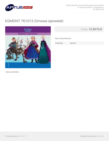 Sklep dziecięcy Smykuś Remigiusz Kaczmarek ul. Nowotoruńska 12, Bydgoszcz 52 362 02 63 EGMONT 761013 Zimowa opowieść Cena: 12,39 PLN Opis słownikowy Producent Egmont Opis produktu Plik wygenerowano: 08-03-2017 Powered by TCPDF (www.tcpdf.org) Oprogramowanie sklepu: AptusShop