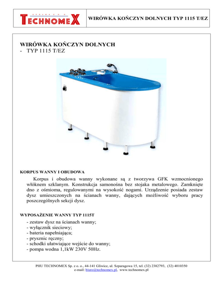 WIRÓWKA KOŃCZYN DOLNYCH TYP 1115 T/EZ WIRÓWKA KOŃCZYN DOLNYCH - TYP 1115 T/EZ KORPUS WANNY I OBUDOWA Korpus i obudowa wanny wykonane są z tworzywa GFK wzmocnionego włóknem szklanym. Konstrukcja samonośna bez stojaka metalowego. Zamknięte dno z ośmioma, regulowanymi na wysokość nogami. Urządzenie posiada zestaw dysz umieszczonych na ścianach wanny, dających możliwość wyboru pracy poszczególnych sekcji dysz. WYPOSAŻENIE WANNY TYP 1115T - zestaw dysz na ścianach wanny; - wyłącznik sieciowy; - bateria napełniająca; - prysznic ręczny; - schodki ułatwiające wejście do wanny; - pompa wodna 1,1kW 230V 50Hz. PHU TECHNOMEX Sp. z o. o., 44-141 Gliwice, ul. Szparagowa 15, tel. (32) 2382793, (32) 4010350 e-mail: [email protected], www.technomex.pl WIRÓWKA KOŃCZYN DOLNYCH TYP 1115 T/EZ WYPOSAŻENIE WANNY TYP 1115EZ - jak wyżej plus mikroprocesorowy sterownik (automatyzacja procesu napełniania i odliczania czasu zabiegu). - system ochrony pompy. - 3 niezależne sekcje sterowane z panelu elektronicznego WIRÓWKA KOŃCZYN DOLNYCH - TYP 1115 T/E SCHEMAT PRZYŁĄCZY WODNYCH WYMIARY WANNY - Długość: 1440 mm - Szerokość: 680 mm - Wysokość: 900mm WYMIARY WEWNĘTRZNE PHU TECHNOMEX Sp. z o. o., 44-141 Gliwice, ul. Szparagowa 15, tel. (32) 2382793, (32) 4010350 e-mail: [email protected], www.technomex.pl WIRÓWKA KOŃCZYN DOLNYCH TYP 1115 T/EZ PODŁĄCZENIA BUDOWLANO-MONTAŻOWE W WANNIE 1. Podłączenie wody ciepłej – wąż techniczny z nakrętką R 1/2”. 2. Podłączenie wody zimnej – wąż techniczny z nakrętką R 1/2”. 3. Odpływ o średnicy 50 mm. Przewód zasilający o długości ok. 2 m zakończony wtyczką z uziomem. WYMAGANIA MONTAŻOWE PO STRONIE UŻYTKOWNIKA 1. Zawory kulowe zamykające do zimnej i ciepłej wody (wg schematu). 2. Instalacja wodociągowa wyposażona w mechaniczne filtry cząstek stałych 3. Odpływ ściekowy średnicy o 100mm (ewentualnie75mm) zakończony redukcją 100/50 (równo z posadzką) wyposażony w zamknięcie przeciwzapachowe 4. Maksymalna wysokość zaworów zamykających 100mm. 5. Gniazdo zasilające 230V 50Hz z uziomem zlokalizowane w okolicy 1,5 metra od przyłączy zasilających w wodę. PHU TECHNOMEX Sp. z o. o., 44-141 Gliwice, ul. Szparagowa 15, tel. (32) 2382793, (32) 4010350 e-mail: [email protected], www.technomex.pl