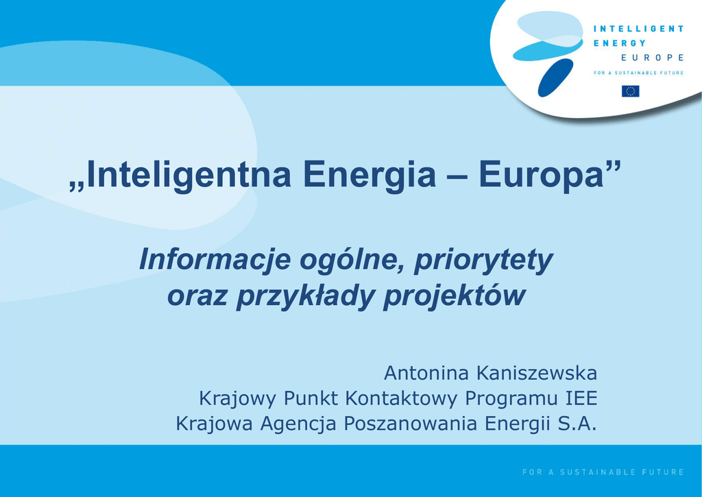 „Inteligentna Energia – Europa” Informacje ogólne, priorytety oraz przykłady projektów Antonina Kaniszewska Krajowy Punkt Kontaktowy Programu IEE Krajowa Agencja Poszanowania Energii S.A. Program IEE w kontekście polityki energetycznej UE WSPÓLNA POLITYKA ENERGETYCZNA DLA EUROPY CELE UE DO 2020 20% redukcja emisji gazów cieplarnianych 20% redukcja zużycia energii pierwotnej 20% energii odnawialnej w bilansie energetycznym 10% biopaliw w transporcie Bariery zwiększania efektywności energetycznej Brak informacji Niski priorytet dla efektywności energetycznej Kapitał na inwestycje, nie na projekty „miękkie” Niewystarczający kapitał Wielu uczestników rynku, szeroka grupa docelowa Inteligentna Energia – Europa > Wspiera politykę Unii Europejskiej w dziedzinie energetyki odnawialnej i efektywności energetycznej oraz pomaga osiągnąć cele wyznaczone na rok 2020 > Zachęca do korzystania ze sprawdzonych „inteligentnych” energetycznie rozwiązań > Nie jest programem rozwijającym technologie, w przeciwieństwie do 7. PR > Działa, aby zwiększyć innowacyjność i konkurencyjność Europy Program IEE jako uzupełnienie innych Programów Program, który pomaga zamienić założenia polityczne w konkretne działania Tworzenie najlepszych praktyk Edukacja Transfer wiedzy Cele UE w zakresie efektywności energetycznej i odnawialnych źródeł energii Doskonalenie rynku Wdrożenie założeń politycznych i ich doskonalenie 730 mln € na 2007-13 Zmiany w działaniu użytkowników końcowych Program IEE > Wspiera rozwój strategii, planów działań oraz usprawnia działanie rynku dla rozwiązań z dziedziny poszanowania energii i energetyki odnawialnej > Wspiera szybsze/bardziej powszechne wdrożenia technologii już dostępnych w UE > Wspiera „oddolne” działania pomagające we wdrożeniu polityki unijnej na poziomie lokalnym, regionalnym, krajowym Katalizator dla innowacji i rozwoju rynku Narzędzia Programu IEE Program IEE w liczbach Dotychczas w ramach Programu IEE: - dofinansowano > 500 projektów - utworzono > 60 lokalnych lub regionalnych agencji energetycznych Z pomocy skorzystało ponad 3000 beneficjentów z 30 krajów Efektywność energetyczna Odnawialne źródła energii Działania zintegrowane Efektywność energetyczna w transporcie Program IEE - instrumenty > konkursy na najlepsze projekty (zaproszenie do składania wniosków), > przetargi na projekty zamówione przez Komisję Europejską, > Inicjatywy ELENA. Budżet na 2011 r. > € 67 milionów wsparcie „projektów promocyjnych i rozpowszechniających” (dofinansowanie do 75% kosztów kwalifikowanych) > € 30 milionów inicjatywy ELENA we współpracy z Europejskim Bankiem Inwestycyjnym, Bankiem KfW oraz Bankiem Rozwoju Rady Europy - wsparcie projektów powielania rynkowego > € 11 millionów projekty zamawiane (przetargi) > € 6 millionów działania wspólne i inne mechanizmy Terminologia w Programie IEE OBSZARY DZIAŁAŃ (SAVE, ALTENER, STEER, Działania zintegrowane) OBSZARY DOFINANSOWANIA lub DZIAŁANIA KLUCZOWE (np. produkty efektywne energetycznie, energia elektryczna z OZE, efektywny energetycznie transport) PRIORYTETY = wybrane corocznie zagadnienia w danym obszarze Obszary działań Efektywność energetyczna (SAVE) Efektywny energetycznie transport (STEER) Odnawialne źródła energii (ALTENER) Działania zintegrowane Obszary finansowania Efektywność energetyczna (SAVE) Promowanie energooszczędnych urządzeń, zachowań konsumenckich Efektywność energetyczna w przemyśle Efektywność energetyczna w budownictwie Transport (STEER) „czyste” pojazdy i alternatywne paliwa Energooszczędny transport Doszkolenie agencji branżowych Odnawialne źródła energii (ALTENER) Energia elektryczna Biopaliwa Ciepło i chłodzenie Zastosowanie źródeł odnawialnych w małej skali Obszary finansowania Działania zintegrowane Lokalne inicjatywy w zakresie energii „Zrównoważone energetycznie” samorządy Tworzenie agencji energetycznych Bio-business Usługi energetyczne Kogeneracja Mobilizowanie lokalnych inwestycji związanych z energią Budynki o prawie zerowym zużyciu energii Edukacja Szkolenia i podnoszenie kwalifikacji pracowników budowlanych Przykład: Energy Trophy + „Europejskie Trofeum Energetyczne +” Energy Trophy jest europejskim konkursem mającym na celu oszczędzanie energii w budynkach biurowych poprzez zmianę zachowao pracowników. Niewielkie, nisko-kosztowe działania, jak wprowadzenie energooszczędnych żarówek, regulatorów lub przeprowadzenie małych audytów były dopuszczalne. Nie dopuszczalne były natomiast działania renowacyjne czy termomodernizacyjne. W pierwszej edycji, zorganizowanej w latach 2004-2005, uczestniczyło 38 przedsiębiorstw i instytucji z sześciu krajów. W czasie trwania konkursu wprowadziły one szereg działao, które pozwoliły na zmniejszenie zużycia energii średnio o 7% w ciągu roku. Zwycięzca uzyskał oszczędności rzędu 30% w ciągu roku. Uczestnicy projektu uzyskali w sumie redukcję zużycia energii w wysokości 3700 MWh, emisji CO2 o 1 885 ton oraz oszczędności kosztów wynoszące ponad 200 000 €. W drugiej edycji konkursu (09.2007-08.2008), wzięło udział155 firm z 17 krajów. Maksymalna wielkośd oszczędności uzyskanej przez uczestników sięgała nawet 42% energii w ciągu roku. Łączna oszczędnośd dla wszystkich uczestników konkursu wyniosła tym razem 11,8% energii, co spowodowało ograniczenie emisji CO2 o blisko 9500 ton. www.energytrophy.org Przykład: CEECAP Wdrażanie polityki Unii Europejskiej dotyczącej efektywności energetycznej urządzeń AGD w krajach Europy Środkowej i Wschodniej CEECAP > Projekt miał na celu wspieranie krajów Europy środkowej i wschodniej w implementacji unijnych przepisów dotyczących efektywności energetycznej urządzeń gospodarstwa domowego, > Zadaniem projektu było rozpowszechnienie wśród decydentów, wytwórców i sprzedawców specjalistycznej wiedzy o