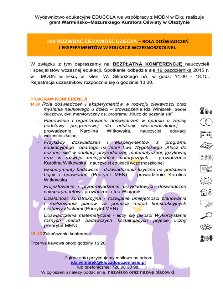 Wydawnictwo edukacyjne EDUCOLA we współpracy z MODN w Ełku realizuje grant Warmińsko–Mazurskiego Kuratora Oświaty w Olsztynie JAK ROZWIJAĆ CIEKAWOŚĆ DZIECKA – ROLA DOŚWIADCZEŃ I EKSPERYMENTÓW W EDUKACJI WCZESNOSZKOLNEJ. W związku z tym zapraszamy na BEZPŁATNĄ KONFERENCJĘ nauczycieli i specjalistów wczesnej edukacji. Spotkanie odbędzie się 19 października 2015 r. w MODN w Ełku, ul. Gen. W. Sikorskiego 5A, w godz. 14:00 - 18:15. Rejestracja uczestników rozpocznie się o godzinie 13:30. PROGRAM KONFERENCJI 14:00 Rola doświadczeń i eksperymentów w rozwoju ciekawości oraz myślenia naukowego u dzieci – prowadzenie Ida Winiarek, trener kluczowy, dyr. merytoryczny ds. programu „Klucz do uczenia się” Planowanie i organizowanie doświadczeń w oparciu o zapisy podstawy programowej prowadzenie Karolina dla edukacji Witkowska, wczesnoszkolnej nauczyciel – edukacji wczesnoszkolnej Przykłady doświadczeń i eksperymentów z programu edukacyjnego opartego na teorii Lwa Wygotskiego „Klucz do uczenia się” w edukacji przyrodniczej, matematycznej, językowej oraz w rozwoju umiejętności motorycznych - prowadzenie Karolina Witkowska, nauczyciel edukacji wczesnoszkolnej Eksperymenty badawcze - doświadczenia fizyczne na podstawie bajek i opowiadań (Priorytet MEN) – prowadzenie Karolina Witkowska Projektowanie i przeprowadzenie przykładowych doświadczeń i eksperymentów - prowadzenie Ida Winiarek Działalność konstrukcyjna - rozwijanie umiejętności planowania i realizowania planów za pomocą metod konstrukcyjnych i zabawy klockami (Priorytet MEN) Doświadczenia matematyczne - liczy się jakość! Wykorzystanie różnych metod badawczych kształtujących pojęcie liczby (Priorytet MEN) 18:15 Zakończenie konferencji Przerwa kawowa około godziny 16:20 Zgłoszenia przyjmujemy mailowo na adres: [email protected] lub telefonicznie: 728 98 30 98. W zgłoszeniu należy podać imię, nazwisko oraz nazwę placówki.