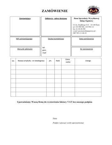 ZAMÓWIENIE Zamawiający Odbiorca - adres dostawy Dom Sprzedaży Wysyłkowej Sklep Ogniowy Ul. Ks. Rzadkiego 5/15 63-100 Śrem tel. 535 998 998 ; 535 998 112 fax. 61-28-38-398 e-mail: [email protected] NIP 785-111-86-10 NIP zamawiającego Warunki płatności Lp. Osoba kontaktowa Data zamówienia tel. gsm. mail Nazwa artykułu - nr katalogowy Nr zamówienia jm. Ilość Cena netto Uwagi Upoważniamy Waszą firmę do wystawienia faktury VAT bez naszego podpisu Data Podpis i pieczęć osoby upoważnionej