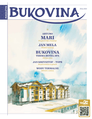 Zima 2013 Arturo Mari Przyjaciel Ojca Świętego Jan Mela Obudzić nadzieję BUKOVINA TERMA HOTEL SPA Zdrowa zima Jan Krzysztof – TOPR Bezpieczeństwo w górach WODY TERMALNE Zdrowie z natury Menrad Polska sp. z o.o. ul. Transportowców 11 02-858 Warszawa Tel.: + 48 22 250 88 80 Fax: + 48 22 250 88 81 [email protected] www.menrad.pl Dostępne w