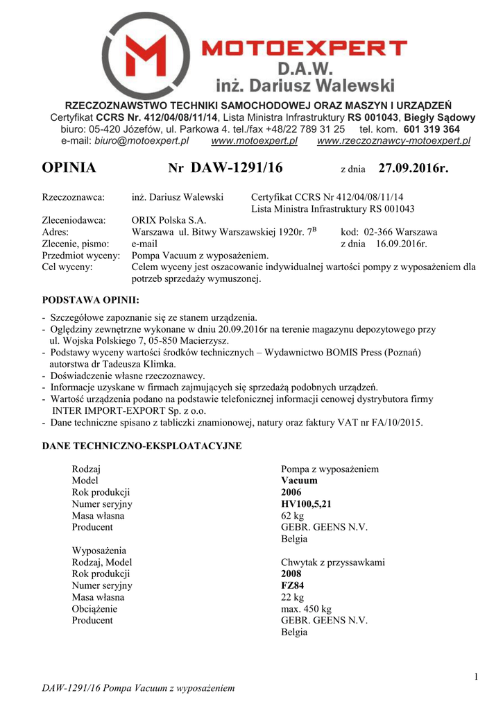RZECZOZNAWSTWO TECHNIKI SAMOCHODOWEJ ORAZ MASZYN I URZĄDZEŃ Certyfikat CCRS Nr. 412/04/08/11/14, Lista Ministra Infrastruktury RS 001043, Biegły Sądowy biuro: 05-420 Józefów, ul. Parkowa 4. tel./fax +48/22 789 31 25 tel. kom. 601 319 364 e-mail: [email protected] www.motoexpert.pl www.rzeczoznawcy-motoexpert.pl OPINIA Nr DAW-1291/16 z dnia 27.09.2016r. Rzeczoznawca: inż. Dariusz Walewski Zleceniodawca: Adres: Zlecenie, pismo: Przedmiot wyceny: Cel wyceny: ORIX Polska S.A. Warszawa ul. Bitwy Warszawskiej 1920r. 7B kod: 02-366 Warszawa e-mail z dnia 16.09.2016r. Pompa Vacuum z wyposażeniem. Celem wyceny jest oszacowanie indywidualnej wartości pompy z wyposażeniem dla potrzeb sprzedaży wymuszonej. Certyfikat CCRS Nr 412/04/08/11/14 Lista Ministra Infrastruktury RS 001043 PODSTAWA OPINII: - Szczegółowe zapoznanie się ze stanem urządzenia. - Oględziny zewnętrzne wykonane w dniu 20.09.2016r na terenie magazynu depozytowego przy ul. Wojska Polskiego 7, 05-850 Macierzysz. - Podstawy wyceny wartości środków technicznych – Wydawnictwo BOMIS Press (Poznań) autorstwa dr Tadeusza Klimka. - Doświadczenie własne rzeczoznawcy. - Informacje uzyskane w firmach zajmujących się sprzedażą podobnych urządzeń. - Wartość urządzenia podano na podstawie telefonicznej informacji cenowej dystrybutora firmy INTER IMPORT-EXPORT Sp. z o.o. - Dane techniczne spisano z tabliczki znamionowej, natury oraz faktury VAT nr FA/10/2015. DANE TECHNICZNO-EKSPLOATACYJNE Rodzaj Model Rok produkcji Numer seryjny Masa własna Producent Wyposażenia Rodzaj, Model Rok produkcji Numer seryjny Masa własna Obciążenie Producent Pompa z wyposażeniem Vacuum 2006 HV100,5,21 62 kg GEBR. GEENS N.V. Belgia Chwytak z przyssawkami 2008 FZ84 22 kg max. 450 kg GEBR. GEENS N.V. Belgia 1 DAW-1291/16 Pompa Vacuum z wyposażeniem ZASTOSOWANIE Generatory podciśnienia oraz specjalnie zaprojektowane przyssawki podciśnieniowe pozwalają na zastosowanie tej technologii do podnoszenia oraz układania różnego typu prefabrykatów betonowych oraz elementów z kamienia naturalnego. OPIS STANU TECHNICZNEGO: Do oceny przedstawiono urządzenie o w/w danych identyfikacyjnych, bez widocznych braków, znajdującą się na terenie magazynu depozytowego przy ul. Wojska Polskiego 7, 05-850 Macierzysz. Wg oświadczenia zleceniodawcy urządzenie podczas przekazania leasingobiorcy do leasingodawcy sprawdzone w działaniu. Wizualny stan techniczny można określić jako dostateczny. Do urządzenia nie przedstawiono dokumentacji technicznej i serwisowej. Urządzenie ze śladami uszkodzeń eksploatacyjnych, zabrudzone. Obudowa pompy – porysowana z punktowymi ogniskami korozji. Przewody hydrauliczne – powgniatane. Podstawka chwytaka z przyssawkami – prowizorycznie naprawiona. RZECZOZNAWCA DAW-1291/16 Pompa Vacuum z wyposażeniem 2