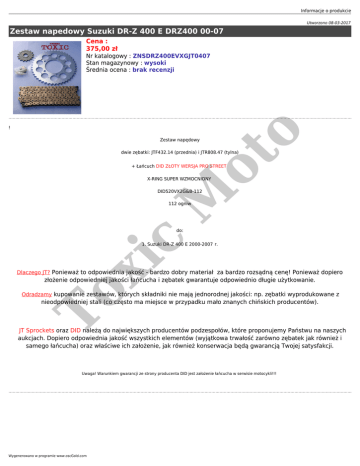 Informacje o produkcie Utworzono 08-03-2017 Zestaw napedowy Suzuki DR-Z 400 E DRZ400 00-07 Cena : 375,00 zł Nr katalogowy : ZNSDRZ400EVXGJT0407 Stan magazynowy : wysoki Średnia ocena : brak recenzji ot o ! Zestaw napędowy dwie zębatki: JTF432.14 (przednia) i JTR808.47 (tylna) + Łańcuch DID ZŁOTY WERSJA PRO STREET X-RING SUPER WZMOCNIONY M DID520VX2G&B-112 112 ogniw c do: xi 1. Suzuki DR-Z 400 E 2000-2007 r. Dlaczego JT? Ponieważ to odpowiednia jakość - bardzo dobry materiał za bardzo rozsądną cenę! Ponieważ dopiero To złożenie odpowiedniej jakości łańcucha i zębatek gwarantuje odpowiednio długie użytkowanie. Odradzamy kupowanie zestawów, których składniki nie mają jednorodnej jakości: np. zębatki wyprodukowane z nieodpowiedniej stali (co często ma miejsce w przypadku mało znanych chińskich producentów). JT Sprockets oraz DID należą do największych producentów podzespołów, które proponujemy Państwu na naszych aukcjach. Dopiero odpowiednia jakość wszystkich elementów (wyjątkowa trwałość zarówno zębatek jak również i samego łańcucha) oraz właściwe ich założenie, jak również konserwacja będą gwarancją Twojej satysfakcji. Uwaga! Warunkiem gwarancji ze strony producenta DID jest założenie łańcucha w serwisie motocykli!!! Wygenerowano w programie www.oscGold.com