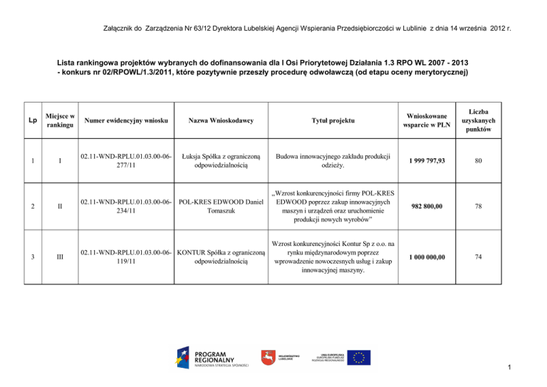Załącznik do Zarządzenia Nr 63/12 Dyrektora Lubelskiej Agencji Wspierania Przedsiębiorczości w Lublinie z dnia 14 września 2012 r. Lista rankingowa projektów wybranych do dofinansowania dla I Osi Priorytetowej Działania 1.3 RPO WL 2007 - 2013 - konkurs nr 02/RPOWL/1.3/2011, które pozytywnie przeszły procedurę odwoławczą (od etapu oceny merytorycznej) Tytuł projektu Wnioskowane wsparcie w PLN Liczba uzyskanych punktów Łuksja Spółka z ograniczoną odpowiedzialnością Budowa innowacyjnego zakładu produkcji odzieży. 1 999 797,93 80 POL-KRES EDWOOD Daniel Tomaszuk „Wzrost konkurencyjności firmy POL-KRES EDWOOD poprzez zakup innowacyjnych maszyn i urządzeń oraz uruchomienie produkcji nowych wyrobów” 982 800,00 78 1 000 000,00 74 Lp Miejsce w rankingu Numer ewidencyjny wniosku Nazwa Wnioskodawcy 1 I 02.11-WND-RPLU.01.03.00-06277/11 II 02.11-WND-RPLU.01.03.00-06234/11 III Wzrost konkurencyjności Kontur Sp z o.o. na 02.11-WND-RPLU.01.03.00-06- KONTUR Spółka z ograniczoną rynku międzynarodowym poprzez 119/11 odpowiedzialnością wprowadzenie nowoczesnych usług i zakup innowacyjnej maszyny. 2 3 1 Załącznik do Zarządzenia Nr 63/12 Dyrektora Lubelskiej Agencji Wspierania Przedsiębiorczości w Lublinie z dnia 14 września 2012 r. 4 IV 02.11-WND-RPLU.01.03.00-06233/11 5 IV 02.11-WND-RPLU.01.03.00-06270/11 AMS RAIDER Sp.J. R.Kasprzak, M.Krupa Wyposażenie stacji obsługi pojazdów w innowacyjne urządzenia, pojazdy specjalne oraz rozwiązania ICT motorem wzrostu przedsiębiorstwa. 917 850,18 73 HANDEL-PRODUKCJA USŁUGI STOLARSKIE "GRAB" Zenon Grabowski Zwiększenie poziomu konkurencyjności Przedsiębiorstwa Handel - Produkcja Usługi Stolarskie GRAB Zenon Grabowski 1 999 797,80 73 RAZEM: 6 900 245,91 WARTOŚĆ ALOKACJI W RAMACH KONKURSU w PLN (rezerwa finansowa) 7 035 542,35 2