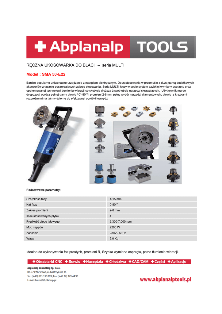 RĘCZNA UKOSOWARKA DO BLACH – seria MULTI Model : SMA 50-E22 Bardzo popularne uniwersalne urządzenie z napędem elektrycznym. Do zastosowania w przemyśle z dużą gamą dodatkowych akcesoriów znacznie poszerzających zakres stosowania. Seria MULTI łączy w sobie system szybkiej wymiany osprzętu oraz opatentowanej technologii tłumienia wibracji co skutkuje dłuższą żywotnością narzędzi skrawających. Użytkownik ma do dyspozycji oprócz pełnej gamy głowic / 0*-80*/ i promieni 2-8mm, pełny wybór narządzi diamentowych, głowic z krążkami rozprężnymi na taśmy ścierne do efektywnej obróbki krawędzi Podstawowe parametry: Szerokość fazy 1-15 mm Kąt fazy 0-80*° Zakres promieni 2-8 mm Ilość stosowanych płytek 4 Prędkość biegu jałowego 2.300-7.000 rpm Moc napędu 2200 W Zasilanie 230V / 50Hz Waga 9,0 Kg Idealna do wykonywania faz prostych, promieni R, Szybka wymiana osprzętu, pełne tłumienie wibracji.