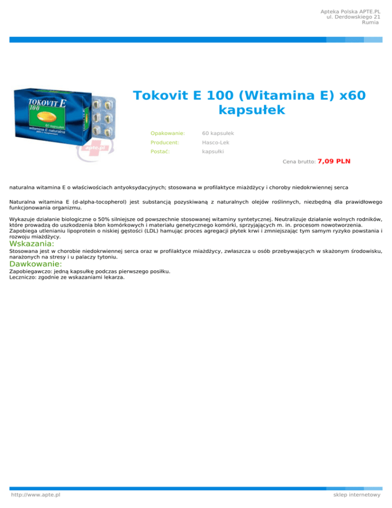 Apteka Polska APTE.PL ul. Derdowskiego 21 Rumia Tokovit E 100 (Witamina E) x60 kapsułek Opakowanie: 60 kapsułek Producent: Hasco-Lek Postać: kapsułki Cena brutto: 7,09 PLN naturalna witamina E o właściwościach antyoksydacyjnych; stosowana w profilaktyce miażdżycy i choroby niedokrwiennej serca Naturalna witamina E (d-alpha-tocopherol) jest substancją pozyskiwaną z naturalnych olejów roślinnych, niezbędną dla prawidłowego funkcjonowania organizmu. Wykazuje działanie biologiczne o 50% silniejsze od powszechnie stosowanej witaminy syntetycznej. Neutralizuje działanie wolnych rodników, które prowadzą do uszkodzenia błon komórkowych i materiału genetycznego komórki, sprzyjających m. in. procesom nowotworzenia. Zapobiega utlenianiu lipoprotein o niskiej gęstości (LDL) hamując proces agregacji płytek krwi i zmniejszając tym samym ryzyko powstania i rozwoju miażdżycy. Wskazania: Stosowana jest w chorobie niedokrwiennej serca oraz w profilaktyce miażdżycy, zwłaszcza u osób przebywających w skażonym środowisku, narażonych na stresy i u palaczy tytoniu. Dawkowanie: Zapobiegawczo: jedną kapsułkę podczas pierwszego posiłku. Leczniczo: zgodnie ze wskazaniami lekarza. http://www.apte.pl sklep internetowy