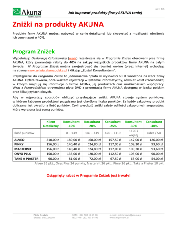 Jak kupować produkty firmy AKUNA taniej str.: 1/5 Zniżki na produkty AKUNA Produkty firmy AKUNA możesz nabywać w cenie detalicznej lub skorzystać z możliwości obniżenia ich ceny nawet o 40%. Program Zniżek Wypełniając Deklarację Członkowską (wzór) rejestrujesz się w Programie Zniżek oferowany prze firmę AKUNA, który gwarantuje rabaty do 40% na zakupy wszystkich produktów firmy AKUNA na całym świecie. W Programie Zniżek można zarejestrować się również on-line (przez Internet) wchodząc na stronę www.sylwia.akunapolska.pl i klikając „Zostań Konsultantem”. Przystąpienie do Programu Zniżek to jednorazowa opłata w wysokości 60 zł wnoszona na rzecz firmy AKUNA. Opłata zawiera, poza kosztem rejestracji w systemie informatyczny, również koszt Przewodnika, w którym znajdują się informacje o firmie AKUNA, jej produktach oraz możliwościach współpracy. Wraz z Przewodnikiem otrzymujesz płytę DVD z prezentacją firmy AKUNA dostępną w języku polskim oraz kilku językach obcych. Aby w najprostszy sposobów obliczyć przysługujące zniżki, AKUNA stosuje system punktowy, w którym każdemu produktowi przypisana jest określona liczba punktów. Za każdy zakupiony produkt doliczana jest określona ilość punktów. Czyli wysokość zniżki zależy od ilości zakupionych preparatów, która wyrażona jest sumą punktów. Klient Detaliczny Konsultant -10% Konsultant -20% Konsultant -25% Konsultant -30% Konsultant -40% 1120 i Lider / SD więcej ALVEO 210,00 zł 189,00 zł 168,00 zł 157,50 zł 147,00 zł 126,00 zł PINKY 156,00 zł 140,40 zł 124,80 zł 117,00 zł 109,20 zł 93,60 zł MASTERVIT 156,00 zł 140,40 zł 124,80 zł 117,00 zł 109,20 zł 93,60 zł ONYX PLUS 150,00 zł 135,00 zł 120,00 zł 112,50 zł 105,00 zł 90,00 zł TAKE A PLASTER 90,00 zł 81,00 zł 72,00 zł 67,50 zł 63,00 zł 54,00 zł Alveo 35 pkt., Onyx Plus 24 punkty, Mastervit 26 pkt., Pinky 26 pkt., Take a Plaster 10 pkt. Ilość punktów 0 – 139 140 – 419 420 – 1119 Osiągnięty rabat w Programie Zniżek jest trwały! Piotr Brożek Skype: piotr_brozek GSM: +48 503 96 58 96 TEL: +48 (32) 797 91 96 e-mail: [email protected] www.mdjw.com.pl Jak kupować produkty firmy AKUNA taniej str.: 2/5 Awans na pozycję LIDER / Senior Dystrybutor EKSPRESOWY – jednorazowy zakup produktów o wartości 2100 punktów ze zniżką 35%, awans natychmiastowy STOPNIOWY – zakup produktów o wartości 2100 punktów w ciągu dwóch kolejnych miesięcy z rabatami wynikającymi z Programu Zniżek, awans od następnego miesiąca TRIANGLE – trzykrotny zakup produktów o wartości 700 punktów ze zniżką 30%, dokonany przez Ciebie oraz Twoich dwóch nowych partnerów w okresie trzech miesięcy od daty Twojej rejestracji KUMULACYJNY – zakup produktów o wartości 3500 punktów w ciągu dwunastu miesięcy z rabatami wynikającymi z Programu Zniżek, awans od następnego miesiąca Zasady zniżek liczba zakupionych produktów (punktów decydujących o rabacie) sumuje się w dowolnym czasie Przykład: Przy zakupie bieżącej partii towaru o wartości np. 245 punktów o wysokości rabatu decyduje suma ilości uprzednio zakupionych produktów (np. 210 punktów) i ilości produktów bieżącego zakupu (245 punktów). Suma ta (455 punktów) upoważnia do zakupu bieżącej partii produktów z rabatem 25% raz uzyskany poziom zniżek nigdy nie ulega zmniejszeniu brak limitów czasowych i ilościowych w celu utrzymania zniżki Piotr Brożek Skype: piotr_brozek GSM: +48 503 96 58 96 TEL: +48 (32) 797 91 96 e-mail: [email protected] www.mdjw.com.pl Jak kupować produkty firmy AKUNA taniej str.: 3/5 Program: „MÓJ KLIENT, Akuna i ja” AKUNA Polska oferuje możliwość zamawiania preparatów za pośrednictwem swojego Sklepu internetowego ze stałą zniżką w wysokości 20% (liczonej od cen detalicznych). Cały proces realizacji zamówienia obsługiwany jest przez AKUNA Polska, dzięki czemu nabywasz preparaty taniej i masz pewność, że są one oryginalne. Aby dokonać zakupu ze zniżką 20% wejdź na stronę www.sylwia.akunapolska.pl Ceny w Sklepie internetowym AKUNA Polska Cena Detaliczna ALVEO PINKY MASTERVIT ONYX PLUS TAKE A PLASTER 210,00 zł 156,00 zł 156,00 zł 150,00 zł 90,00 zł Cena z 20% zniżką 168,00 zł 124,80 zł 124,80 zł 120,00 zł 72,00 zł Oszczędzasz 32,00 zł* 21,20 zł* 21,20 zł* 20,00 zł* 8,00 zł* *) oszczędność przy zakupie jednego produktu w porównaniu do ceny detalicznej z uwzględnieniem 10 zł kosztu wysyłki Piotr Brożek Skype: piotr_brozek GSM: +48 503 96 58 96 TEL: +48 (32) 797 91 96 e-mail: [email protected] www.mdjw.com.pl Jak kupować produkty firmy AKUNA taniej str.: 4/5 ALVEO za "0,00 zł" Posiadając Deklarację Członkowską możesz obniżyć cenę zakupu swoich produktów dzieląc się informacją na ich temat z osobami, które znasz. Na niższą cenę wpływ mają dwa czynniki. Po pierwsze, produkty nabyte przez Ciebie i osoby które znasz, a tym samym punkty za nie, sumują się, dzięki czemu szybciej osiągasz większą zniżkę i niższą cenę. Po drugie, różnica w zniżkach, która się pojawia, powoduje, że finalnie wydajesz na swoje produkty zdecydowanie mniej. Stosując prostą zasadę Pij, Poczuj, Przekaż dalej możesz już wkrótce korzystać ze wszystkich produktów firmy AKUNA zupełnie za darmo! Poniższe przykłady oparto dla uproszczenia wyłącznie o preparat ALVEO i rozpatruje się w nich okres jednego miesiąca czasu, ponieważ na tyle wystarcza jeden preparat stosowany profilaktycznie. Przyjęto również, że każda osoba korzystająca z preparatu jest ma Deklarację Członkowską, czyli możliwość nabywania preparatu w niższej cenie. Wariant 1 Kiedy trzy osoby nabędą z Twojego polecenia po jednej sztuce ALVEO, dokładnie po takiej samej cenie jak Ty, czyli po 189,00 zł, to Twój drugi preparat, a piąty w kolejności – ponieważ wszystkie zakupy sumują się – kupisz z 20% zniżką po 168,00 zł. Preparat kupiony przez