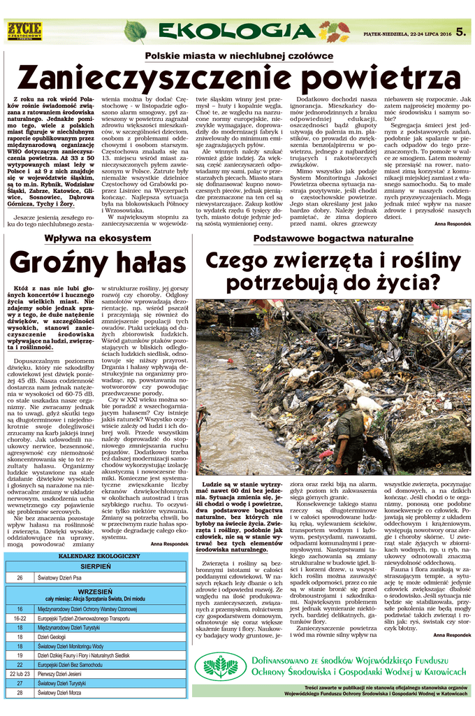 PIĄTEK-NIEDZIELA, 22-24 LIPCA 2016 5. Polskie miasta w niechlubnej czołówce Zanieczyszczenie powietrza Z roku na rok wśród Polaków rośnie świadomość związana z ratowaniem środowiska naturalnego. Jednakże pomimo tego, wiele z polskich miast figuruje w niechlubnym raporcie opublikowanym przez międzynarodową organizację WHO dotyczącym zanieczyszczenia powietrza. Aż 33 z 50 wytypowanych miast leży w Polsce i aż 9 z nich znajduje się w województwie śląskim, są to m.in. Rybnik, Wodzisław Śląski, Zabrze, Katowice, Gliwice, Sosnowiec, Dąbrowa Górnicza, Tychy i Żory. Jeszcze jesienią zeszłego roku do tego niechlubnego zesta- wienia można by dodać Częstochowę - w listopadzie ogłoszono alarm smogowy, pył zawieszony w powietrzu zagrażał zdrowiu większości mieszkańców, w szczególności dzieciom, osobom z problemami oddechowymi i osobom starszym. Częstochowa znalazła się na 13. miejscu wśród miast zanieczyszczonych pyłem zawieszonym w Polsce. Zatrute były niemalże wszystkie dzielnice Częstochowy od Grabówki poprzez Lisiniec na Wyczerpach kończąc. Najlepsza sytuacja była na blokowiskach Północy i Wrzosowiaka. W największym stopniu za zanieczyszczenia w wojewódz- Wpływa na ekosystem Groźny hałas Któż z nas nie lubi głośnych koncertów i hucznego życia wielkich miast. Nie zdajemy sobie jednak sprawy z tego, że duże natężenie dźwięków, w szczególności wysokich, stanowi zanieczyszczenie środowiska wpływające na ludzi, zwięrzęta i roślinność. Dopuszczalnym poziomem dźwięku, który nie szkodziłby człowiekowi jest dźwięk ponieżej 45 dB. Nasza codzienność dostarcza nam jednak natężenia w wysokości od 60-75 dB, co stale uszkadza nasze organizmy. Nie zwracamy jednak na to uwagi, gdyż skutki tego są długoterminowe i niejednokrotnie swoje dolegliwośći zrzucamy na karb jakiejś innej choroby. Jak udowodnili naukowcy nerwice, bezsenność, agresywność czy niemożność skoncentrowania się to też rezultaty hałasu. Organizmy ludzkie wystawione na stałe działanie dźwięków wysokich i głośnych są narażone na nieodwracalne zmiany w układzie nerwowym, uszkodzenia ucha wewnętrznego czy pojawienie się problemów sercowych. Nie bez znaczenia pozostaje wpływ hałasu na roślinność i zwierzęta. Dźwięki wysokie, oddziałowujące na uprawy, mogą powodować zmiany w strukturze rośliny, jej gorszy rozwój czy choroby. Odgłosy samolotów wprowadzają dezorientację, np. wśród pszczół i przczyniają się również do zmniejszenie populacji tych owadów. Ptaki uciekają od dużych zbiorowisk ludzkich. Wśród gatunków ptaków pozostających w bliskich odległościach ludzkich siedlisk, odnotowuje się niższy przyrost. Drgania i hałasy wpływają destrukcyjnie na organizmy prowadząc, np. powstawania nowotwororów czy powodując przedwczesne porody. Czy w XXI wieku można sobie poradzić z wszechogarniającym hałasem? Czy istnieje jakiś ratunek? Wszystko oczywiście zależy od ludzi i ich dobrej woli. Przede wszystkim należy doprowadzić do stopniowego zmniejszania ruchu pojazdów. Dodatkowo trzeba też dalszej modernizacji samochodów wykorzystując izolację akustyczną i nowoczesne tłumiki. Konieczne jest systematyczne zwięszkanie liczby ekranów dzwiękochłonnych w okolichach autostrad i tras szybkiego ruchu. To oczywiście tylko niektóre wyzwania. Zmiany są potrzebą chwili, bo w przeciwnym razie hałas spowoduje degradację całego ekosystemu. KALENDARZ EKOLOGICZNY SIERPIEŃ 26 Światowy Dzień Psa WRZESIEŃ cały miesiąc: Akcja Sprzątania Świata, Dni miodu 16 16-22 Międzynarodowy Dzień Ochrony Warstwy Ozonowej Europejski Tydzień Zrównoważonego Transportu 18 Międzynarodowy Dzień Turystyki 18 Dzień Geologii 18 Światowy Dzień Monitoringu Wody 19 Dzień Dzikiej Fauny i Flory i Naturalnych Siedlisk 22 Europejski Dzień Bez Samochodu 22 lub 23 Anna Respondek twie śląskim winny jest przemysł – huty i kopalnie węgla. Choć te, ze względu na narzucone normy europejskie, niezwykle wymagające, doprowadziły do modernizacji fabryk i zniwelowały do minimum emisje zagrażających pyłów. Ale winnych należy szukać również gdzie indziej. Za większą część zanieczyszczeń odpowiadamy my sami, paląc w przestarzałych piecach. Miasto stara się dofinansować kupno nowoczesnych pieców, jednak pieniądze przeznaczone na ten cel są niewystarczające. Zakup kotłów to wydatek rzędu 6 tysięcy złotych, miasto dotuje jedynie jedną szóstą wymienionej ceny. Dodatkowo dochodzi nasza ignorancja. Mieszkańcy domów jednorodzinnych z braku odpowiedniej edukacji, oszczędności bądź głupoty używają do palenia m.in. plastików, co prowadzi do zwiększenia benzo(a)pirenu w powietrzu, jednego z najbardziej trujących i rakotwórczych związków. Mimo wszystko jak podaje System Monitoringu Jakości Powietrza obecna sytuacja nastraja pozytywnie, jeśli chodzi o częstochowskie powietrze. Jego stan określany jest jako bardzo dobry. Należy jednak pamiętać, że zima dopiero przed nami, okres grzewczy niebawem się rozpocznie. Jak zatem najprościej możemy pomóc środowisku i samym sobie? Segregacja śmieci jest jednym z podstawowych zadań, podobnie jak spalanie w piecach odpadów do tego przeznaczonych. To pomoże w walce ze smogiem. Latem możemy się przesiąść na rower, natomiast zimą korzystać z komunikacji miejskiej zamiast z własnego samochodu. Są to małe zmiany w naszych codziennych przyzwyczajeniach. Mogą jednak mieć wpływ na nasze zdrowie i przyszłość naszych dzieci. Anna Respondek Podstawowe bogactwa naturalne Czego zwierzęta i rośliny potrzebują do życia? Ludzie są w stanie wytrzymać nawet 60 dni bez jedzenia. Sytuacja zmienia się, jeśli chodzi o wodę i powietrze, dwa podstawowe bogactwa naturalne, bez których nie byłoby na świecie życia. Zwierzęta i rośliny, podobnie jak człowiek, nie są w stanie wytrwać bez tych elementów środow