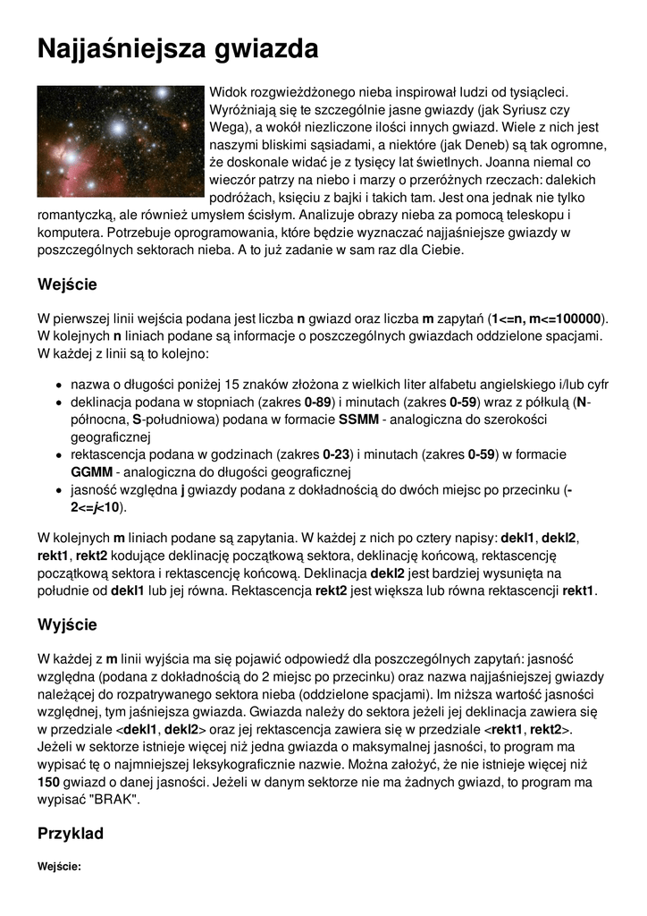 Najjaśniejsza gwiazda Widok rozgwieżdżonego nieba inspirował ludzi od tysiącleci. Wyróżniają się te szczególnie jasne gwiazdy (jak Syriusz czy Wega), a wokół niezliczone ilości innych gwiazd. Wiele z nich jest naszymi bliskimi sąsiadami, a niektóre (jak Deneb) są tak ogromne, że doskonale widać je z tysięcy lat świetlnych. Joanna niemal co wieczór patrzy na niebo i marzy o przeróżnych rzeczach: dalekich podróżach, księciu z bajki i takich tam. Jest ona jednak nie tylko romantyczką, ale również umysłem ścisłym. Analizuje obrazy nieba za pomocą teleskopu i komputera. Potrzebuje oprogramowania, które będzie wyznaczać najjaśniejsze gwiazdy w poszczególnych sektorach nieba. A to już zadanie w sam raz dla Ciebie. Wejście W pierwszej linii wejścia podana jest liczba n gwiazd oraz liczba m zapytań (1<=n, m<=100000). W kolejnych n liniach podane są informacje o poszczególnych gwiazdach oddzielone spacjami. W każdej z linii są to kolejno: nazwa o długości poniżej 15 znaków złożona z wielkich liter alfabetu angielskiego i/lub cyfr deklinacja podana w stopniach (zakres 0-89) i minutach (zakres 0-59) wraz z półkulą (Npółnocna, S-południowa) podana w formacie SSMM - analogiczna do szerokości geograficznej rektascencja podana w godzinach (zakres 0-23) i minutach (zakres 0-59) w formacie GGMM - analogiczna do długości geograficznej jasność względna j gwiazdy podana z dokładnością do dwóch miejsc po przecinku (2<=j<10). W kolejnych m liniach podane są zapytania. W każdej z nich po cztery napisy: dekl1, dekl2, rekt1, rekt2 kodujące deklinację początkową sektora, deklinację końcową, rektascencję początkową sektora i rektascencję końcową. Deklinacja dekl2 jest bardziej wysunięta na południe od dekl1 lub jej równa. Rektascencja rekt2 jest większa lub równa rektascencji rekt1. Wyjście W każdej z m linii wyjścia ma się pojawić odpowiedź dla poszczególnych zapytań: jasność względna (podana z dokładnością do 2 miejsc po przecinku) oraz nazwa najjaśniejszej gwiazdy należącej do rozpatrywanego sektora nieba (oddzielone spacjami). Im niższa wartość jasności względnej, tym jaśniejsza gwiazda. Gwiazda należy do sektora jeżeli jej deklinacja zawiera się w przedziale <dekl1, dekl2> oraz jej rektascencja zawiera się w przedziale <rekt1, rekt2>. Jeżeli w sektorze istnieje więcej niż jedna gwiazda o maksymalnej jasności, to program ma wypisać tę o najmniejszej leksykograficznie nazwie. Można założyć, że nie istnieje więcej niż 150 gwiazd o danej jasności. Jeżeli w danym sektorze nie ma żadnych gwiazd, to program ma wypisać "BRAK". Przyklad Wejście: 15 5 ACHERNAR 5714S 0137 0.45 ALDEBARAN 1630N 0435 0.85 RIGEL 0812S 0514 0.18 CAPELLA 4559N 0516 0.71 BETELGEUSE 0724N 0555 0.45 CANOPUS 5241S 0623 -0.62 SIRIUS 1642S 0645 -1.43 PROCYON 0513N 0739 0.38 ACRUX 6305S 1226 0.77 SPICA 1109S 1325 0.98 HADAR 6022S 1403 0.61 ARCTURUS 1911N 1415 -0.10 RIGELKENT 6050S 1439 0.01 VEGA 3846N 1836 0.03 ALTAIR 0852N 1950 0.77 4244S 8822S 1028 1706 5325N 8045S 1500 1919 2100S 8338S 0131 1335 3942S 5150S 2353 2353 0713S 5205S 0325 1750 Wyjście: 0.01 RIGELKENT 0.03 VEGA -0.62 CANOPUS BRAK -1.43 SIRIUS
