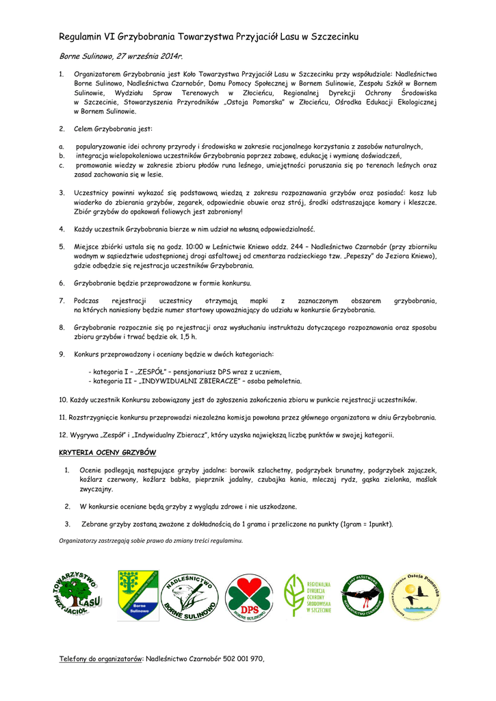 Regulamin VI Grzybobrania Towarzystwa Przyjaciół Lasu w Szczecinku Borne Sulinowo, 27 września 2014r. 1. Organizatorem Grzybobrania jest Koło Towarzystwa Przyjaciół Lasu w Szczecinku przy współudziale: Nadleśnictwa Borne Sulinowo, Nadleśnictwa Czarnobór, Domu Pomocy Społecznej w Bornem Sulinowie, Zespołu Szkół w Bornem Sulinowie, Wydziału Spraw Terenowych w Złocieńcu, Regionalnej Dyrekcji Ochrony Środowiska w Szczecinie, Stowarzyszenia Przyrodników „Ostoja Pomorska” w Złocieńcu, Ośrodka Edukacji Ekologicznej w Bornem Sulinowie. 2. Celem Grzybobrania jest: a. b. c. popularyzowanie idei ochrony przyrody i środowiska w zakresie racjonalnego korzystania z zasobów naturalnych, integracja wielopokoleniowa uczestników Grzybobrania poprzez zabawę, edukację i wymianę doświadczeń, promowanie wiedzy w zakresie zbioru płodów runa leśnego, umiejętności poruszania się po terenach leśnych oraz zasad zachowania się w lesie. 3. Uczestnicy powinni wykazać się podstawową wiedzą z zakresu rozpoznawania grzybów oraz posiadać: kosz lub wiaderko do zbierania grzybów, zegarek, odpowiednie obuwie oraz strój, środki odstraszające komary i kleszcze. Zbiór grzybów do opakowań foliowych jest zabroniony! 4. Każdy uczestnik Grzybobrania bierze w nim udział na własną odpowiedzialność. 5. Miejsce zbiórki ustala się na godz. 10:00 w Leśnictwie Kniewo oddz. 244 – Nadleśnictwo Czarnobór (przy zbiorniku wodnym w sąsiedztwie udostępnionej drogi asfaltowej od cmentarza radzieckiego tzw. „Pepeszy” do Jeziora Kniewo), gdzie odbędzie się rejestracja uczestników Grzybobrania. 6. Grzybobranie będzie przeprowadzone w formie konkursu. 7. Podczas rejestracji uczestnicy otrzymają mapki z zaznaczonym obszarem na których naniesiony będzie numer startowy upoważniający do udziału w konkursie Grzybobrania. 8. Grzybobranie rozpocznie się po rejestracji oraz wysłuchaniu instruktażu dotyczącego rozpoznawania oraz sposobu zbioru grzybów i trwać będzie ok. 1,5 h. 9. Konkurs przeprowadzony i oceniany będzie w dwóch kategoriach: grzybobrania, - kategoria I – „ZESPÓŁ” – pensjonariusz DPS wraz z uczniem, - kategoria II – „INDYWIDUALNI ZBIERACZE” – osoba pełnoletnia. 10. Każdy uczestnik Konkursu zobowiązany jest do zgłoszenia zakończenia zbioru w punkcie rejestracji uczestników. 11. Rozstrzygnięcie konkursu przeprowadzi niezależna komisja powołana przez głównego organizatora w dniu Grzybobrania. 12. Wygrywa „Zespół” i „Indywidualny Zbieracz”, który uzyska największą liczbę punktów w swojej kategorii. KRYTERIA OCENY GRZYBÓW 1. Ocenie podlegają następujące grzyby jadalne: borowik szlachetny, podgrzybek brunatny, podgrzybek zajączek, koźlarz czerwony, koźlarz babka, pieprznik jadalny, czubajka kania, mleczaj rydz, gąska zielonka, maślak zwyczajny. 2. W konkursie oceniane będą grzyby z wyglądu zdrowe i nie uszkodzone. 3. Zebrane grzyby zostaną zważone z dokładnością do 1 grama i przeliczone na punkty (1gram = 1punkt). Organizatorzy zastrzegają sobie prawo do zmiany treści regulaminu. Telefony do organizatorów: Nadleśnictwo Czarnobór 502 001 970,