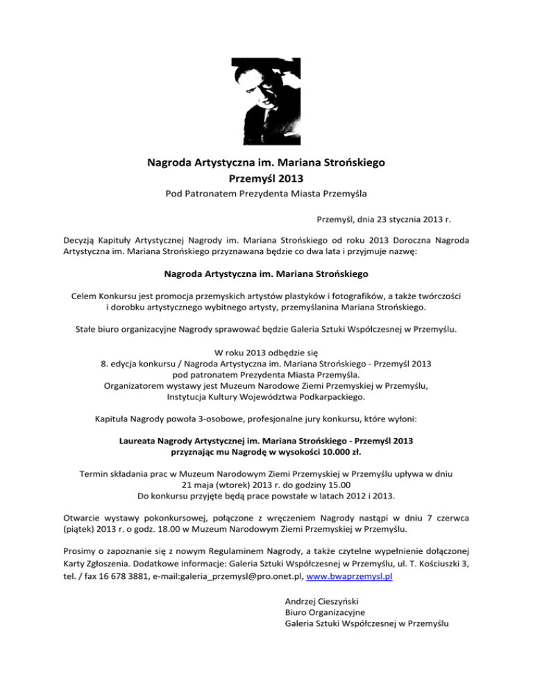 Nagroda Artystyczna im. Mariana Strońskiego Przemyśl 2013 Pod Patronatem Prezydenta Miasta Przemyśla Przemyśl, dnia 23 stycznia 2013 r. Decyzją Kapituły Artystycznej Nagrody im. Mariana Strońskiego od roku 2013 Doroczna Nagroda Artystyczna im. Mariana Strońskiego przyznawana będzie co dwa lata i przyjmuje nazwę: Nagroda Artystyczna im. Mariana Strońskiego Celem Konkursu jest promocja przemyskich artystów plastyków i fotografików, a także twórczości i dorobku artystycznego wybitnego artysty, przemyślanina Mariana Strońskiego. Stałe biuro organizacyjne Nagrody sprawować będzie Galeria Sztuki Współczesnej w Przemyślu. W roku 2013 odbędzie się 8. edycja konkursu / Nagroda Artystyczna im. Mariana Strońskiego - Przemyśl 2013 pod patronatem Prezydenta Miasta Przemyśla. Organizatorem wystawy jest Muzeum Narodowe Ziemi Przemyskiej w Przemyślu, Instytucja Kultury Województwa Podkarpackiego. Kapituła Nagrody powoła 3-osobowe, profesjonalne jury konkursu, które wyłoni: Laureata Nagrody Artystycznej im. Mariana Strońskiego - Przemyśl 2013 przyznając mu Nagrodę w wysokości 10.000 zł. Termin składania prac w Muzeum Narodowym Ziemi Przemyskiej w Przemyślu upływa w dniu 21 maja (wtorek) 2013 r. do godziny 15.00 Do konkursu przyjęte będą prace powstałe w latach 2012 i 2013. Otwarcie wystawy pokonkursowej, połączone z wręczeniem Nagrody nastąpi w dniu 7 czerwca (piątek) 2013 r. o godz. 18.00 w Muzeum Narodowym Ziemi Przemyskiej w Przemyślu. Prosimy o zapoznanie się z nowym Regulaminem Nagrody, a także czytelne wypełnienie dołączonej Karty Zgłoszenia. Dodatkowe informacje: Galeria Sztuki Współczesnej w Przemyślu, ul. T. Kościuszki 3, tel. / fax 16 678 3881, e-mail:[email protected], www.bwaprzemysl.pl Andrzej Cieszyński Biuro Organizacyjne Galeria Sztuki Współczesnej w Przemyślu Nagroda Artystyczna im. Mariana Strońskiego Przemyśl 2013 Pod Patronatem Prezydenta Miasta Przemyśla REGULAMIN Kapituła Nagrody / Organizatorzy Wydział Kultury Urzędu Miejskiego w Przemyślu Muzeum Narodowe Ziemi Przemyskiej w Przemyślu Przemyskie Centrum Kultury i Nauki „Zamek” w Przemyślu Galeria Sztuki Współczesnej w Przemyślu Cel Promocja przemyskich artystów plastyków i fotografików, a także twórczości i dorobku artystycznego wybitnego artysty, przemyślanina Mariana Strońskiego Warunki udziału 1. W konkursie i wystawie pokonkursowej mogą wziąć udział wyłącznie artyści profesjonalni absolwenci wyższych uczelni plastycznych, członkowie plastycznych i fotograficznych związków twórczych oraz plastycy legitymujący się dyplomem magisterskim wyższych uczelni prowadzących kształcenie na kierunkach artystycznych, zamieszkali i tworzący na terenie miasta Przemyśla i powiatu przemyskiego. 2. Konkurs będzie rozstrzygnięty przy udziale minimum 10 artystów. 3. Każdy z artystów może złożyć wraz z kartą zgłoszenia od 2 do 5 prac - niezależnie od uprawianej dziedziny sztuki. 4. W konkursie mogą wziąć udział prace będące własnością autora, wykonane w roku bieżącym lub poprzedzającym aktualną edycję konkursu. 5. W przypadku dzieł wieloczłonowych każda część traktowana będzie jako oddzielna praca. 6. Każda z prac zgłoszonych do konkursu musi być sygnowana i datowana, a także wyraźnie opisana na odwrocie w/g schematu ustalonego w karcie zgłoszenia (w załączeniu). Nagroda Artystyczna im. Mariana Strońskiego 1. Jury konkursu przyzna jedną Nagrodę Artystyczną im. Mariana Strońskiego w wysokości 10.000 zł. oraz pamiątkową statuetkę. 2. Nagroda przyznana zostanie za dzieło pojedyncze lub za zestaw prezentowanych prac. 3. Nagrodzona praca przejdzie na własność aktualnego organizatora konkursu. 4. W przypadku przyznania Nagrody za zestaw prac - aktualny organizator konkursu zdecyduje o wyborze jednej z prezentowanych prac laureata do przekazania na rzecz organizatora. 5. Laureat Nagrody im Mariana Strońskiego w terminie jednego tygodnia od ogłoszenia wyników, Dostarczy organizatorowi konkursu materiały niezbędne do zamieszczenia w katalogu. 6. Laureat zostanie zaproszony do zorganizowania wystawy indywidualnej w Muzeum Narodowym Ziemi Przemyskiej w Przemyślu w roku 2014 w terminie i na zasadach ustalonych z organizatorem. 7. Jury zastrzega sobie prawo do wyeliminowania z konkursu prac obrażających uczucia religijne, Obyczajowe i narodowe. Jury Kapituła Nagrody powoła profesjonalne jury konkursu złożone z artystów plastyków, historyków i krytyków sztuki. Terminy 2013 1 lutego 21 maja 7 czerwca - ogłoszenie konkursu, rozesłanie regulaminów wraz z kartami zgłoszenia - składanie prac w Muzeum Narodowym Ziemi Przemyskiej w Przemyślu - otwarcie wystawy w Muzeum Narodowym Ziemi Przemyskiej w Przemyślu połączone z wręczeniem Nagrody 7 lipca - zakończenie wystawy do końca lipca - zwrot prac uczestnikom konkursu Postanowienia ogólne 1. Każdy uczestnik konkursu składa wraz z pracami wypełnioną kartę zgłoszenia. 2. Brak karty zgłoszenia, jej błędne wypełnienie, przekroczenie ustalonego terminu zgłaszania prac do konkursu, brak odpowiedniego opisu prac - upoważnia organizatora do wyeliminowania tych prac z udziału w konkursie i wystawie pokonkursowej. 3. W roku 2013 konkurs i wystawa pokonkursowa zorganizowana będzie przez Muzeum Narodowe Ziemi Przemyskiej w Przemyślu. 4. Organizator wystawy pokonkursowej (ze względu na możliwości ekspozycyjne) ma prawo decyzji Dotyczącej ilości prac jednego autora eksponowanych na wystawie - za wyjątkiem prac nagrodzonego artysty. 5. Wystawie towarzyszyć będzie katalog / składanka z nazwiskami wszystkich uczestników wystawy pokonkursowej. 6. Organizator ponosi odpowiedzialność za powierzone prace od momentu przyjęcia do czasu ich zwrotu. 7. Autorzy są zobowiązani do odbioru prac do końca września br. Po tym terminie organizator nie ponosi odpowiedzialności za powierzone prace. 8. Organizator wystawy pokonkurs
