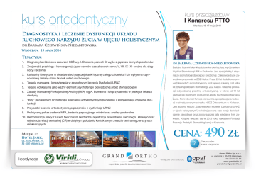 kurs ortodontyczny kurs przedzjazdowy I Kongresu PTTO Wrocław, 15-17 maja 2014 Diagnostyka i leczenie dysfunkcji układu ruchowego narządu żucia w ujęciu holistycznym dr Barbara Czerwińska-Niezabitowska Wrocław, 15 maja 2014 Tematyka: 1. Diagnostyka różnicowa zaburzeń SSŻ wg J. Okesona pozwoli Ci wyjść z gąszcza licznych problemów dr Barbara Czerwińska-Niezabitowska 2. Znajomość przebiegu i konwergencja jąder nerwów czaszkowych nerwu V, VII, IX i X - ważna dla diagnozy i leczenia Barbara Czerwińska-Niezabitowska ukończyła z wyróżnieniem 3. Łańcuchy kinetyczne w układzie sieci pajęczej tkanki łącznej całego człowieka i ich wpływ na czynnościową zmianę stanu tkanek układu ruchowego nia ze stomatologii dziecięcej i ortodoncji. Całe swoje życie za- 4. Terapia manualna i kinezyterapia w zespołowym leczeniu Dysfunkcji URNŻ Wydział Stomatologii AM w Krakowie. Jest specjalistką II stopwodowe pracowała w ZOZ Kielce. Przez 25 lat dodatkowo prowadziła nadzór stomatologiczny nad higieną szkolną, zaś kilka 5. Terapia edukacyjna jako ważny element psychoterapii prowadzonej przez stomatologów lat była inspektorem stomatologii ZOZ Kielce. Obecnie prowa- 6. Zasady Manualnej Funkcjonalnej Analizy (MFA) wg A. Bumanna i ich przydatność w praktyce lekarza dentysty zajmuje się leczeniem Dysfukncji Układu Ruchowego Narządu 7. “Bity” jako element szynoterapii w leczeniu ortodontycznym pacjentów z kompensacją objawów dysfunkcji 8. Przypadki leczenia ortodontycznego pacjentów z dysfunkcją URNŻ 9. Praktyczny pokaz badania MFA, badania palpacyjnego mięśni oraz analizy posturalnej 10. Demonstracja pracy z łukiem twarzowym Girrbacha, rejestracja prowadzenia siecznego i kłowego oraz rejestracja relacji centralnej (CR) w dotylnym położeniu kontaktowym zwarcia centralnego w szynach relaksacyjnych Miejsce: Hotel Jasek, ul. Sułowska 39, 51-180 Wrocław koordynacja dzi indywidualną praktykę ortodontyczną, w której od 12 lat Żucia. Pełni również funkcje kierownika specjalizacji z ortodoncji w akredytowanym ośrodku NZOZ Ortocentrum w Kielcach. Jest autorką książki „Diagnostyka i leczenie Dysfukncji URNŻ w ujęciu holistycznym”, w której zawarła całe swoje doświadczenie zawodowe oraz zdobytą przez lata wiedzę w tym zakresie. Książka ukazała się w 2013 roku nakładem Fundacji Rozwoju Protetyki Stomatologicznej w Krakowie. cena: 490 zł 7 wyłączny dystrybutor: 7 punktów eduk acyjnych Grand Ortho Sp. z o.o. ul. Annopol 3, 03-236 Warszawa tel: 22 519 01 64 www.grandortho.pl [email protected]