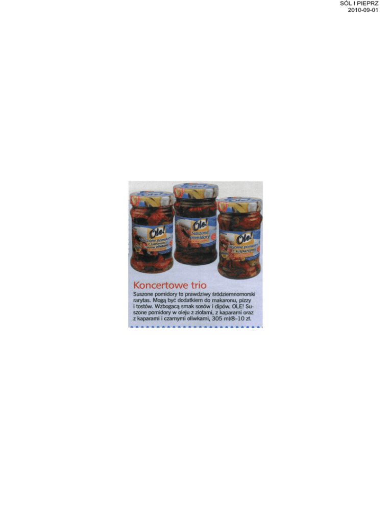 SÓL I PIEPRZ 2010-09-01 zone Suszone omidory uszone ponn Koncertowe trio Suszone pomidory to prawdziwy śródziemnomorski rarytas. Mogą być dodatkiem do makaronu, pizzy i tostów. Wzbogacą smak sosów i dipów. OLE! Su szone pomidory w oleju z ziołami, z kaparami oraz z kaparami i czarnymi oliwkami, 305 ml/8-10 zł.